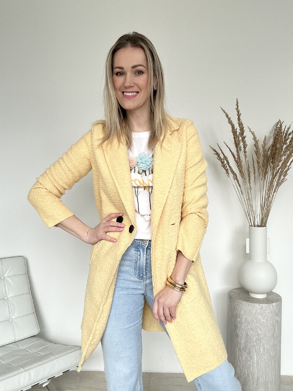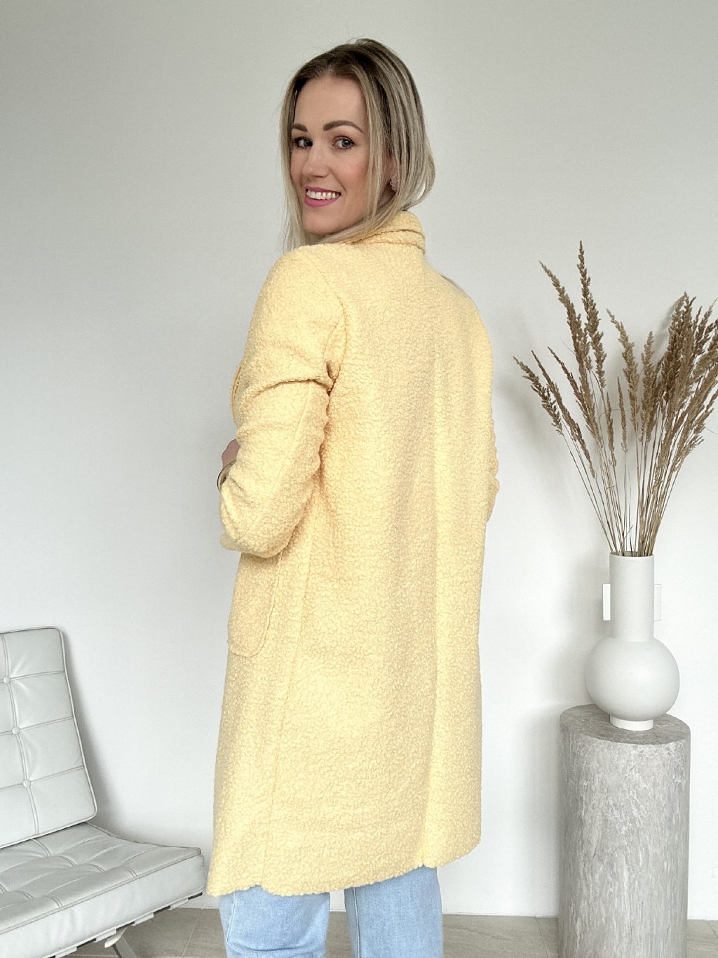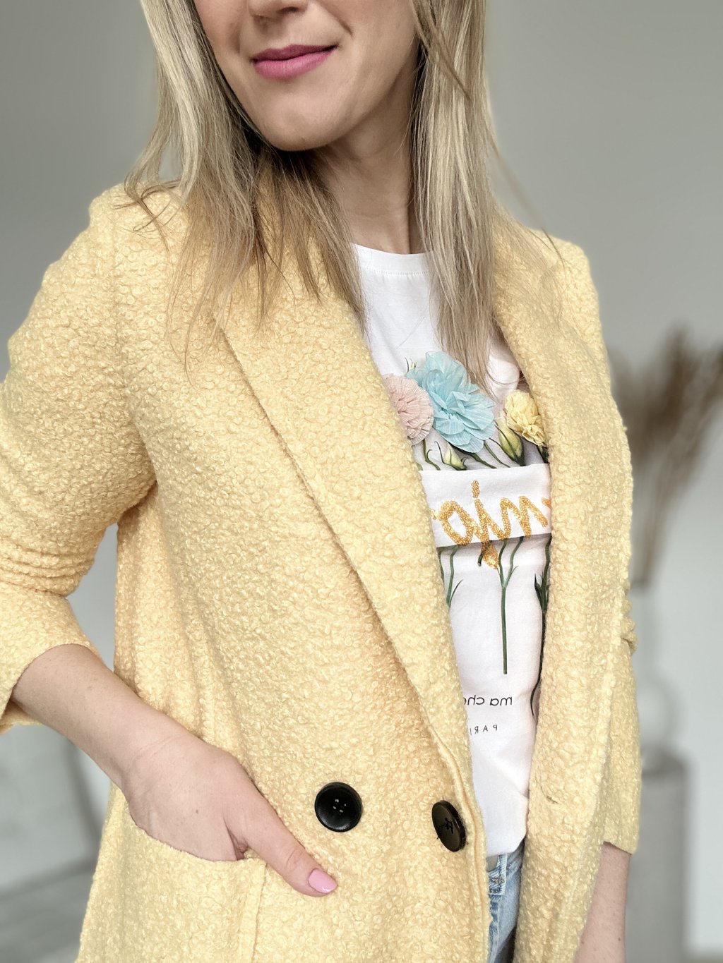 Jarný uzlíčkový kabát klasického rovného strihu s vreckami a so zapínaním na gombíky.
