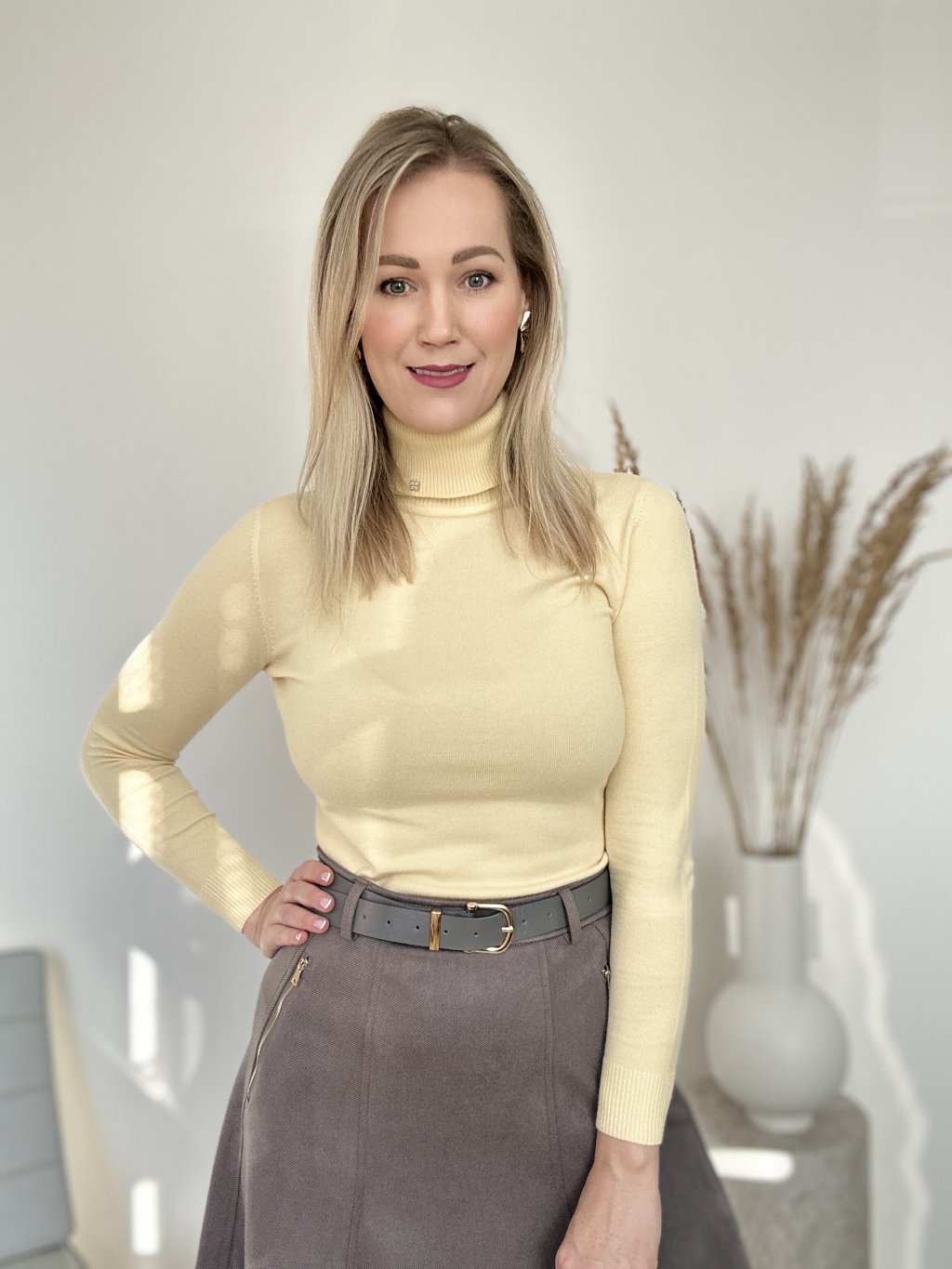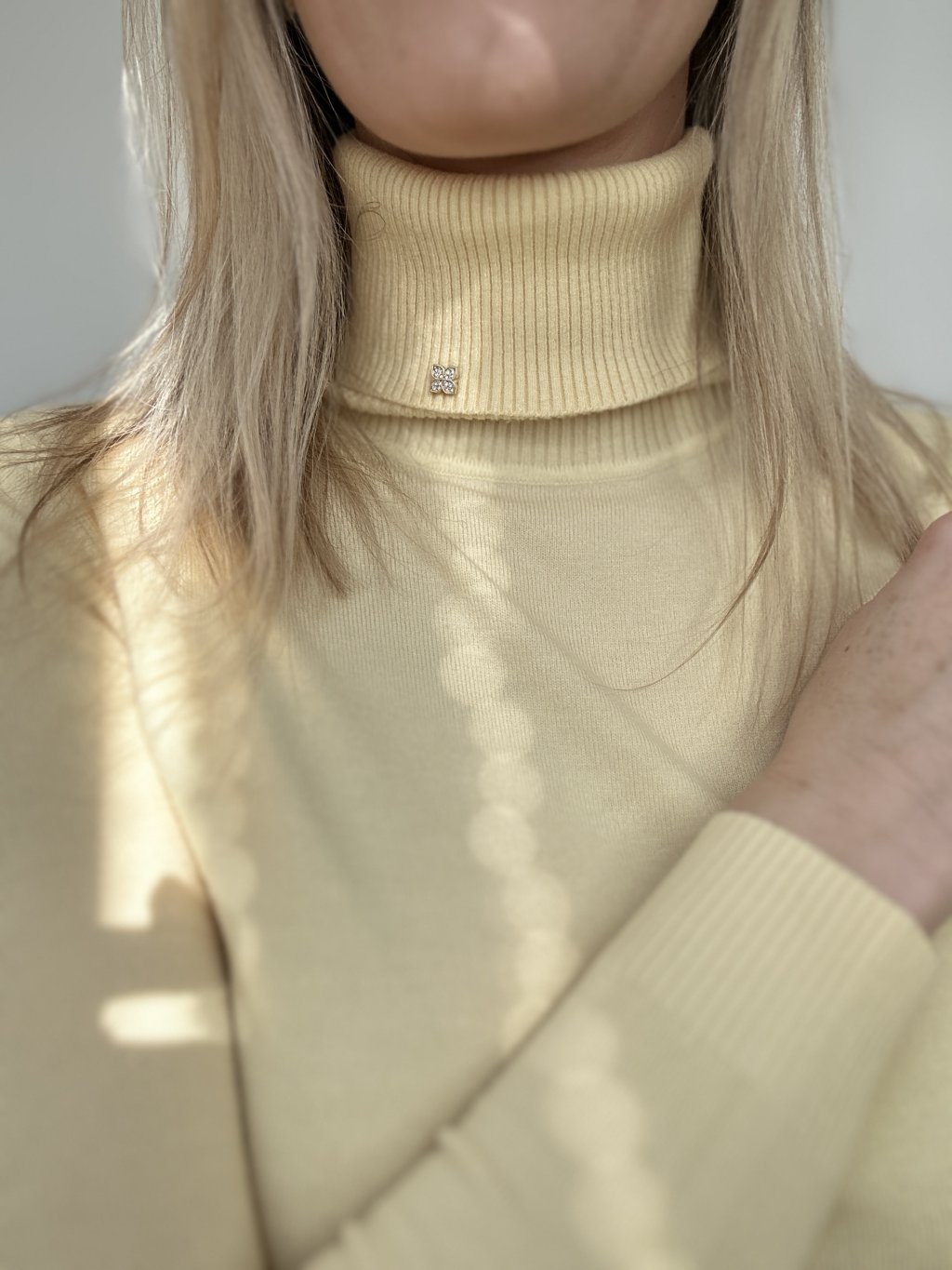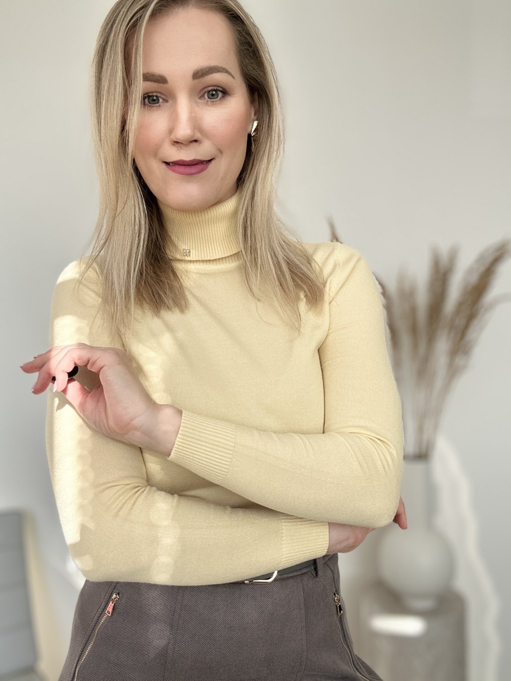 - Rolák v jemnej žltej farbe sa hodí k neutrálnym farbám, ako sú biela, tmavomodrá, sivá alebo hnedá. Hnedé nohavice vytvárajú elegantný jesenný vzhľad.