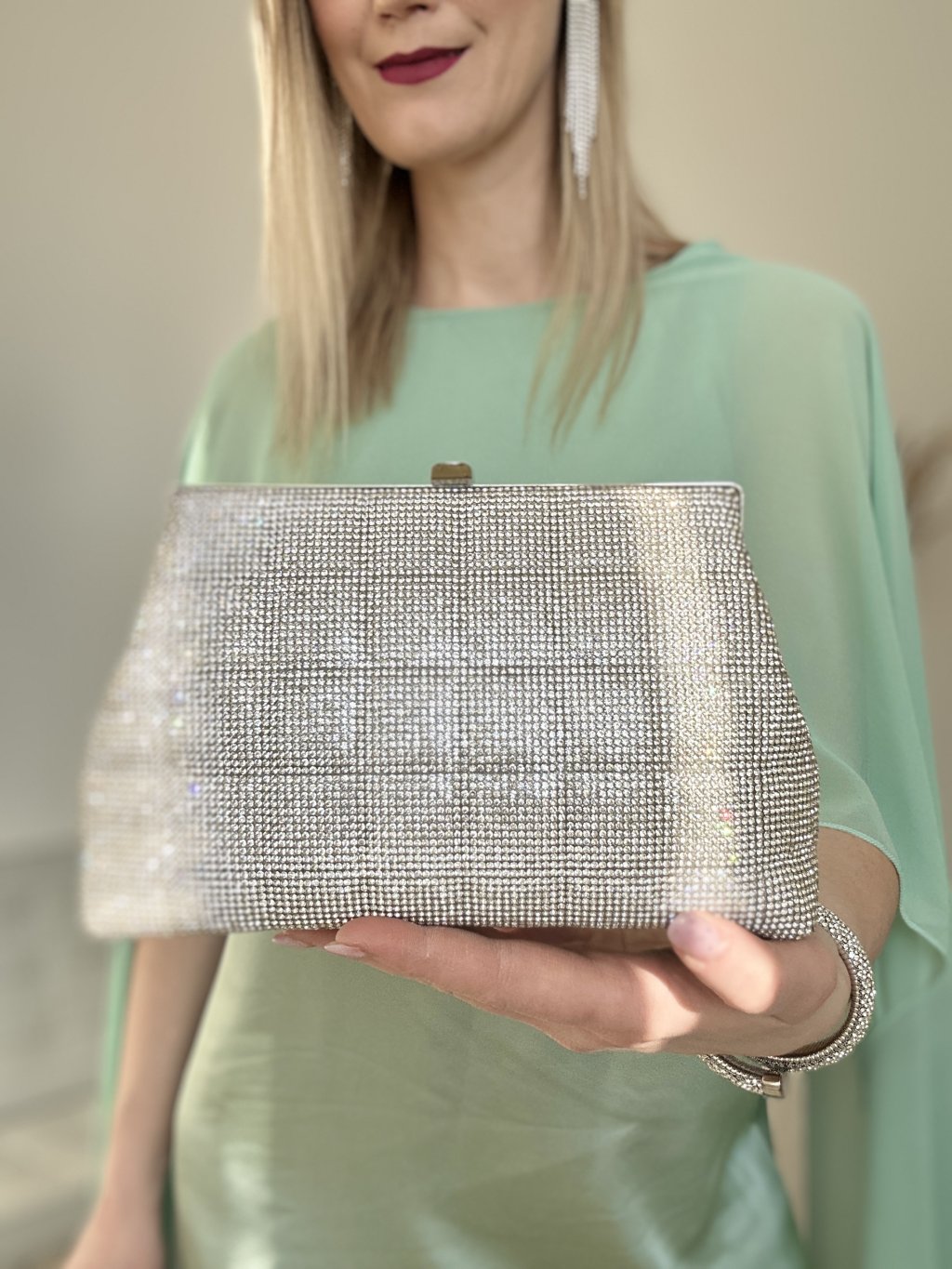- Dizajn: Celý povrch kabelky je pokrytý drobnými lesklými kamienkami, ktoré zachytávajú svetlo a dodávajú jej luxusný vzhľad.