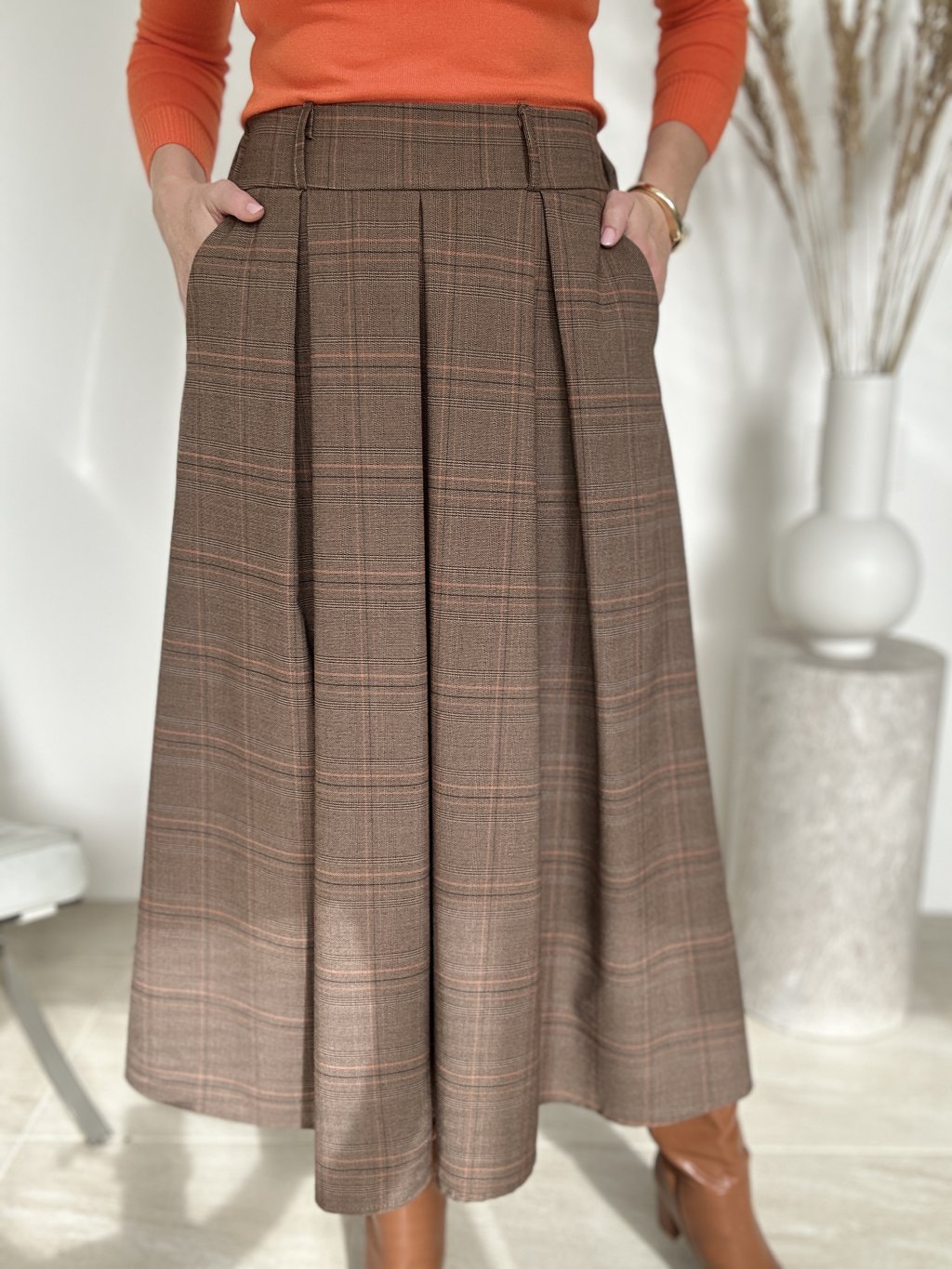 Moderná karovaná sukňa s gumičkou v páse a vreckami. Možnosť kombinácie so sakom.