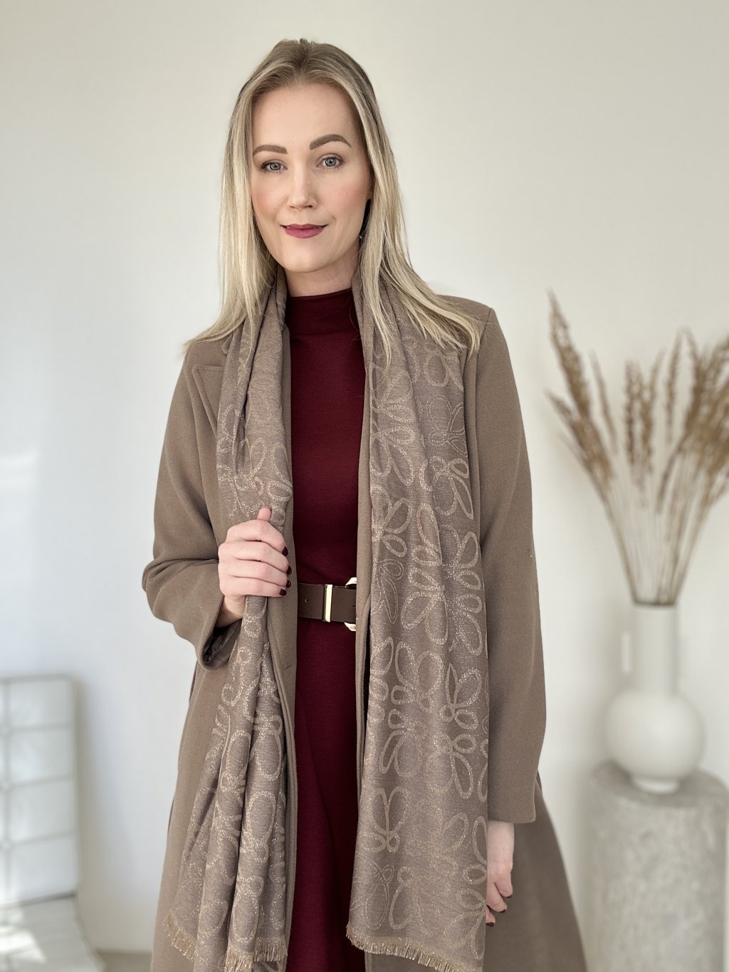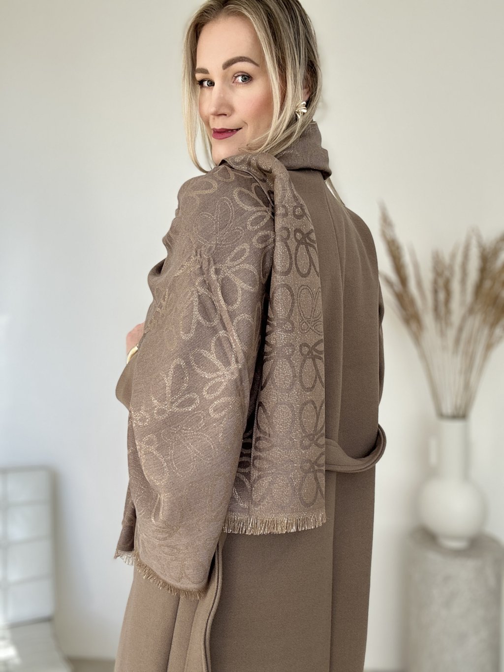 Jemný elegantný kašmírový šál pretkávaný zlatou niťou.