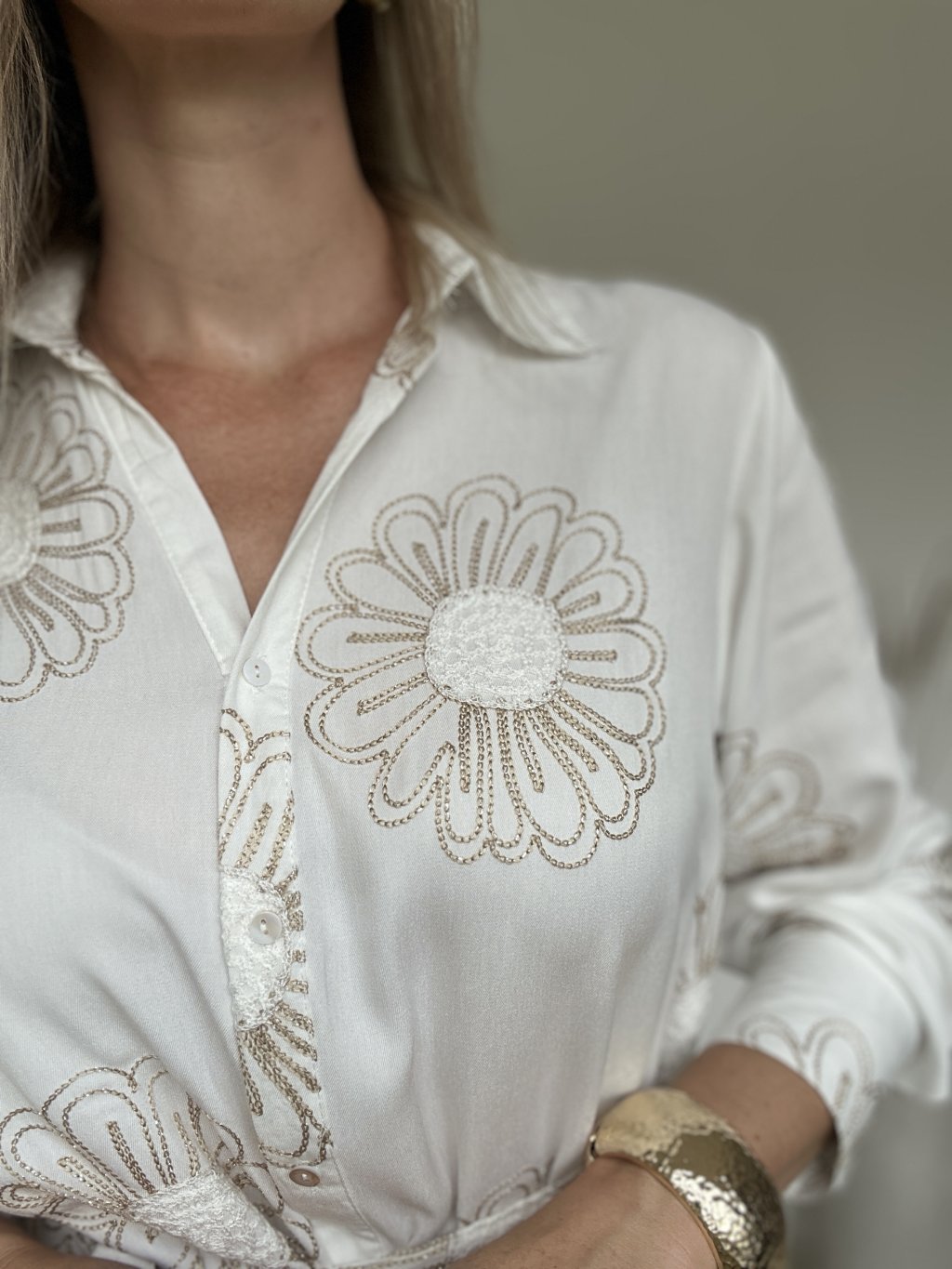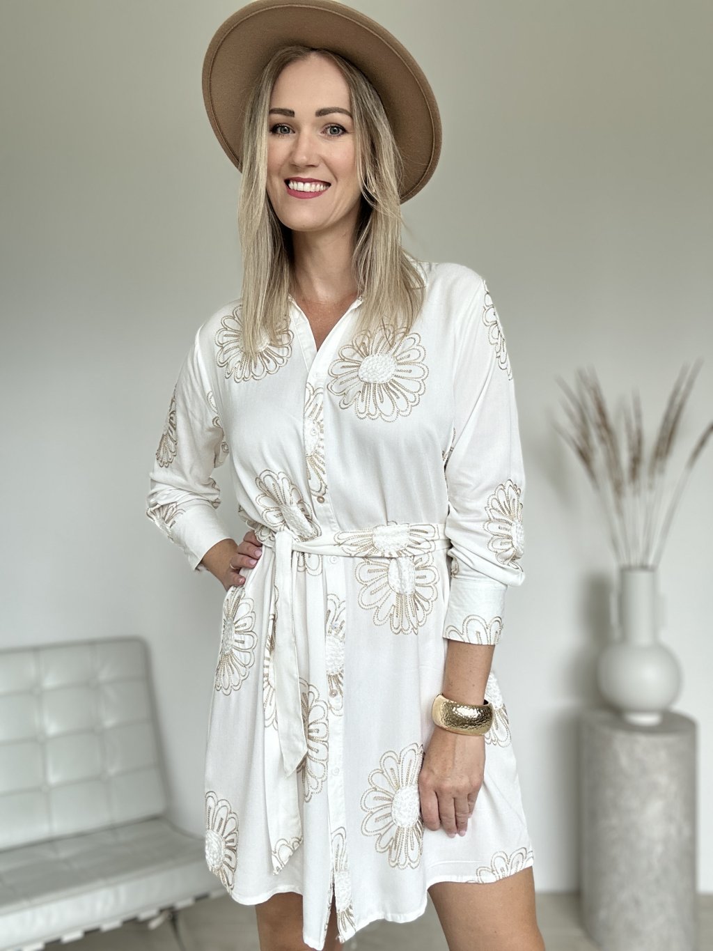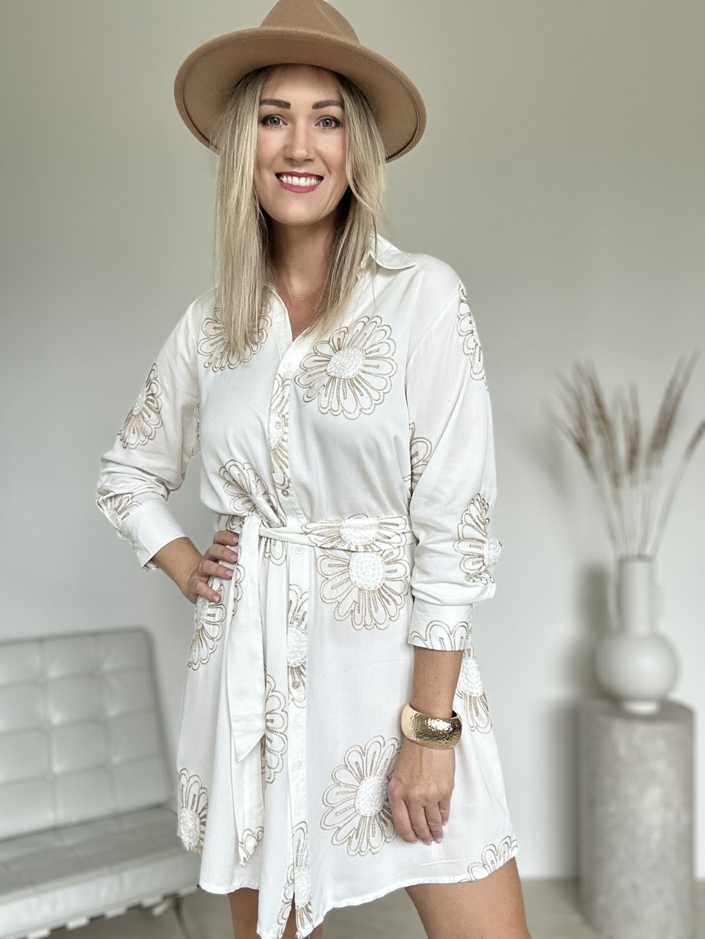 Košeľové šaty s kvetinovým zlatým vzorom.