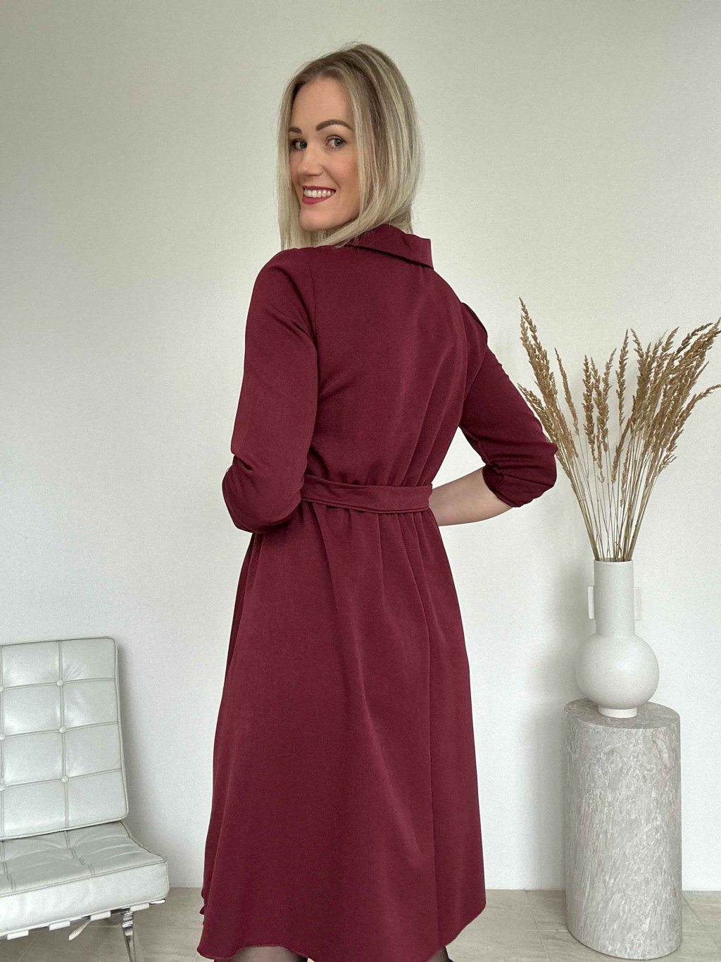 Nadčasové košeľové šaty s golierom a gombíkmi ktoré sa zapínajú vpredu a viažu sa látkovým opaskom. Farba šiat je jednofarebná a opasok zvýrazňuje pás.