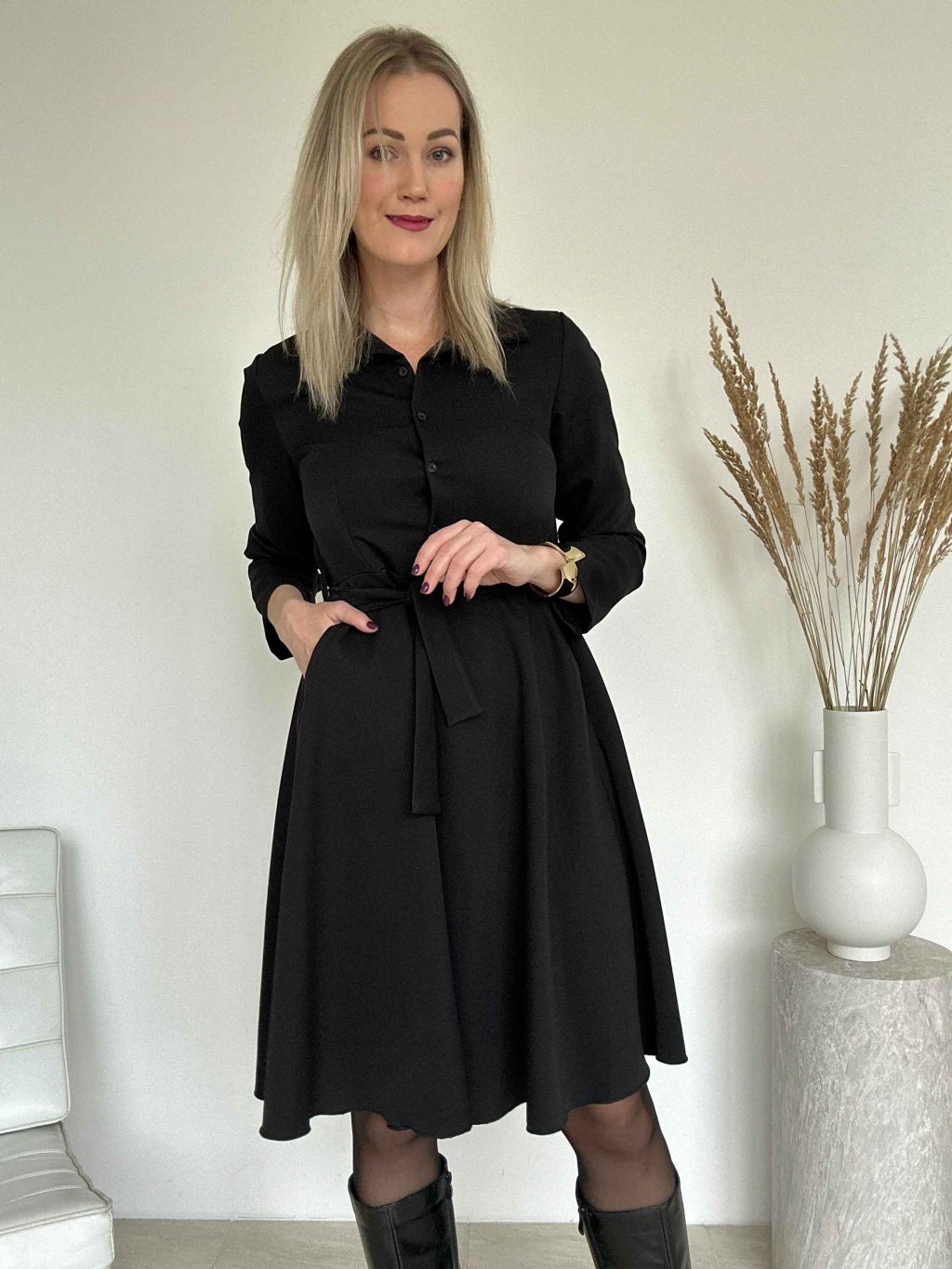 Nadčasové elastické košeľové šaty s golierom a gombíkmi a látkovým opaskom.