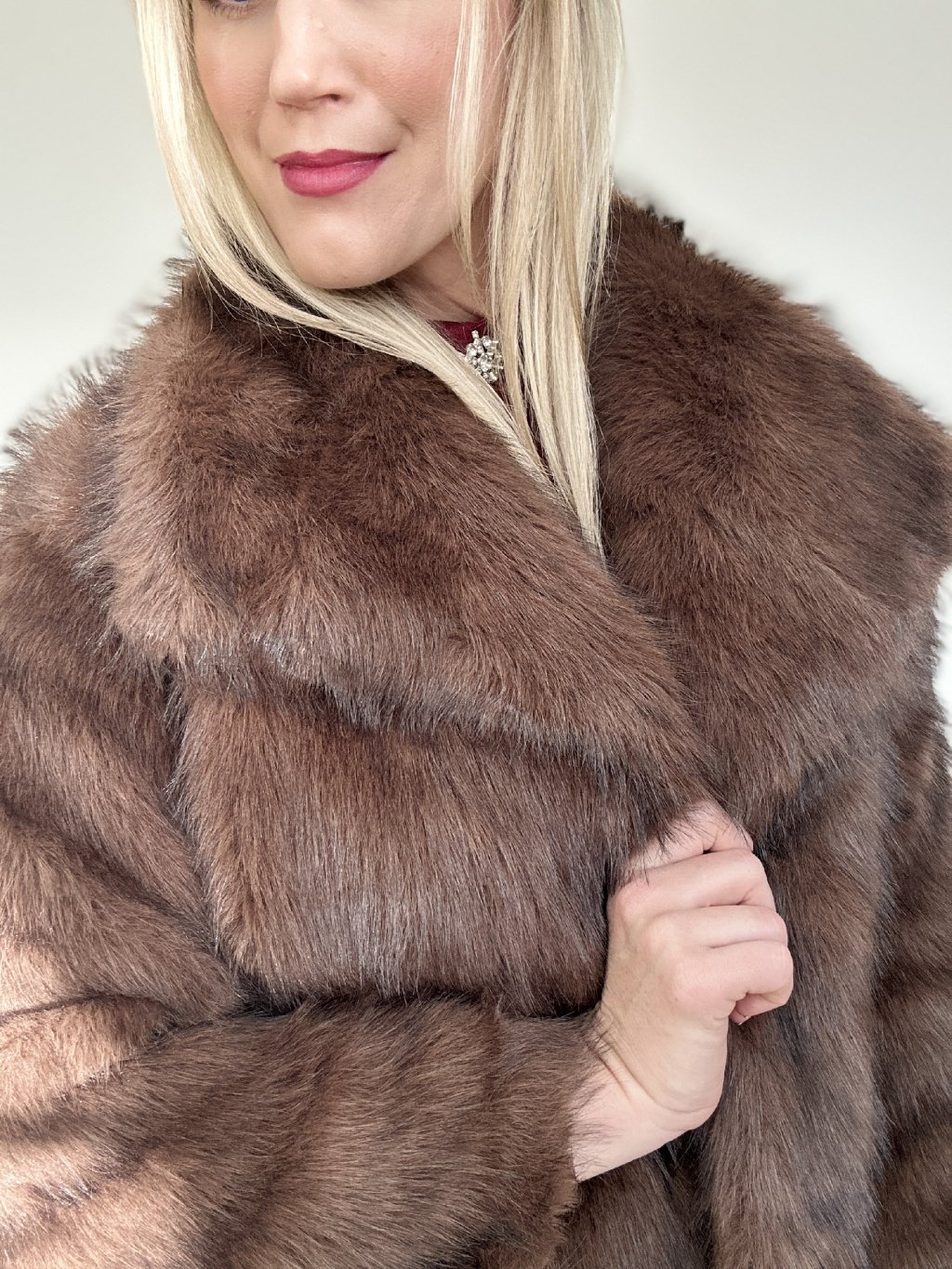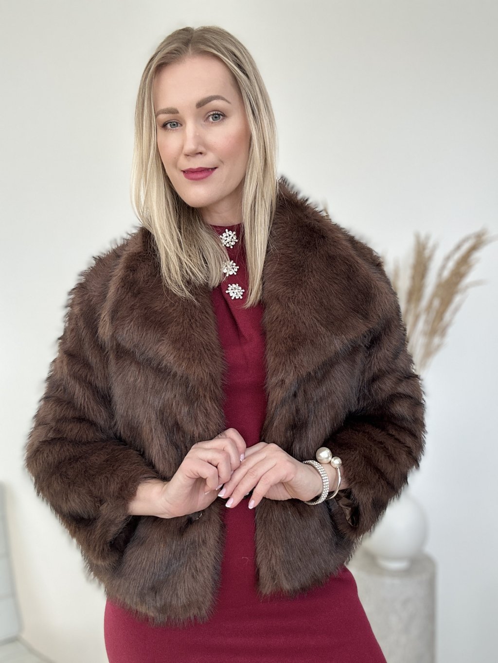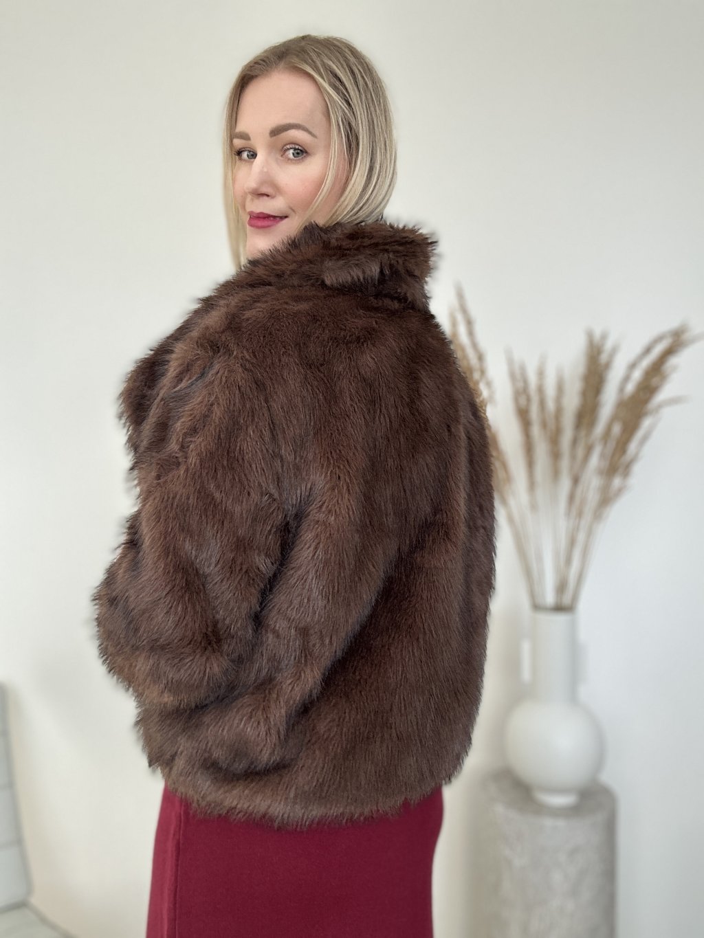 Krátky kožušinový kabát z umelej kožušiny s golierom v tmavohnedej farbe. Tento kúsok oblečenia, často označovaný ako umelý kožuch alebo plyšová bunda, je obľúbeným štýlom prechodnej sezóny.