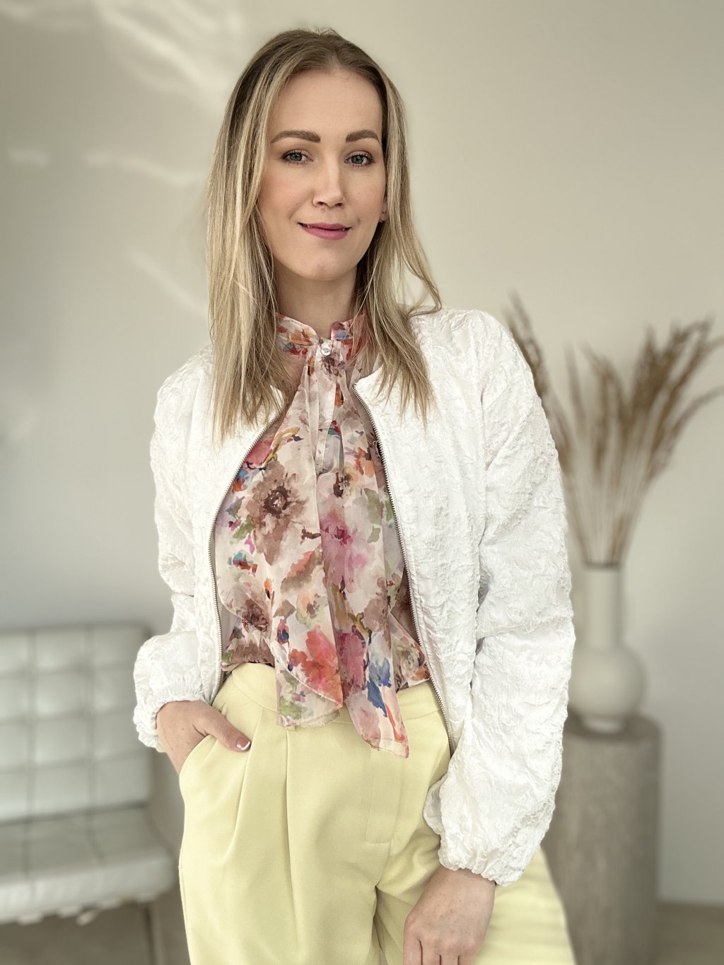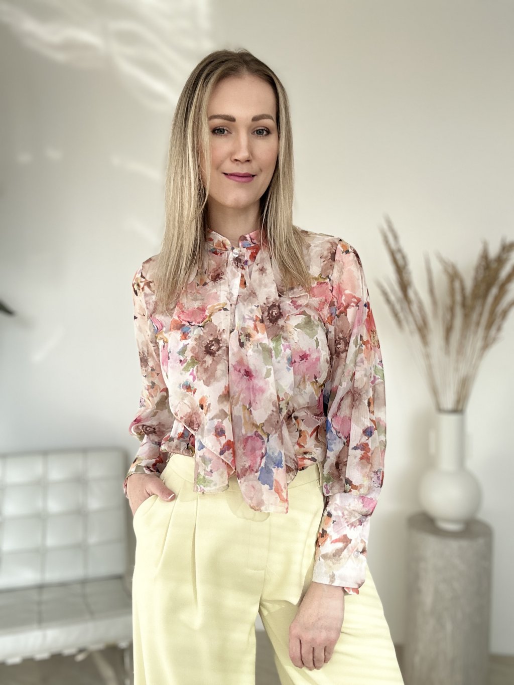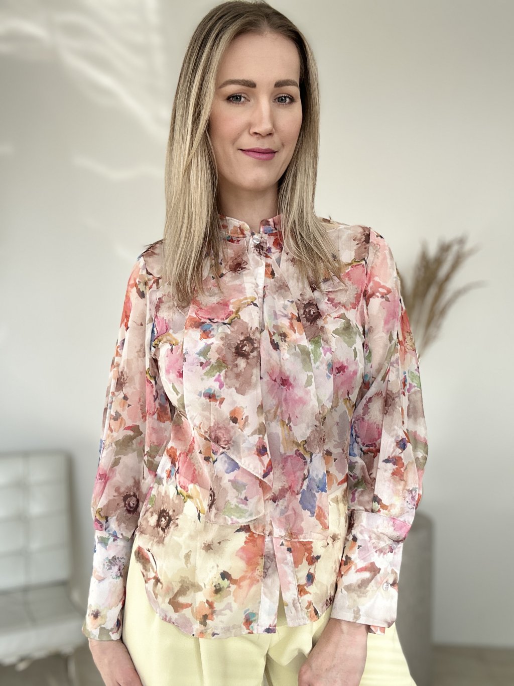 Elegantná dámska blúzka s akvarelovou kvetinovou potlačou ktorá vyniká svojím romantickým dizajnom a jemným spracovaním.