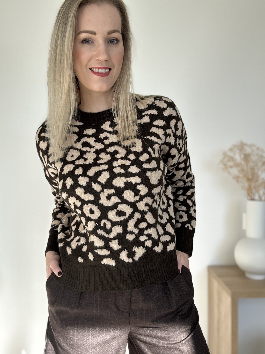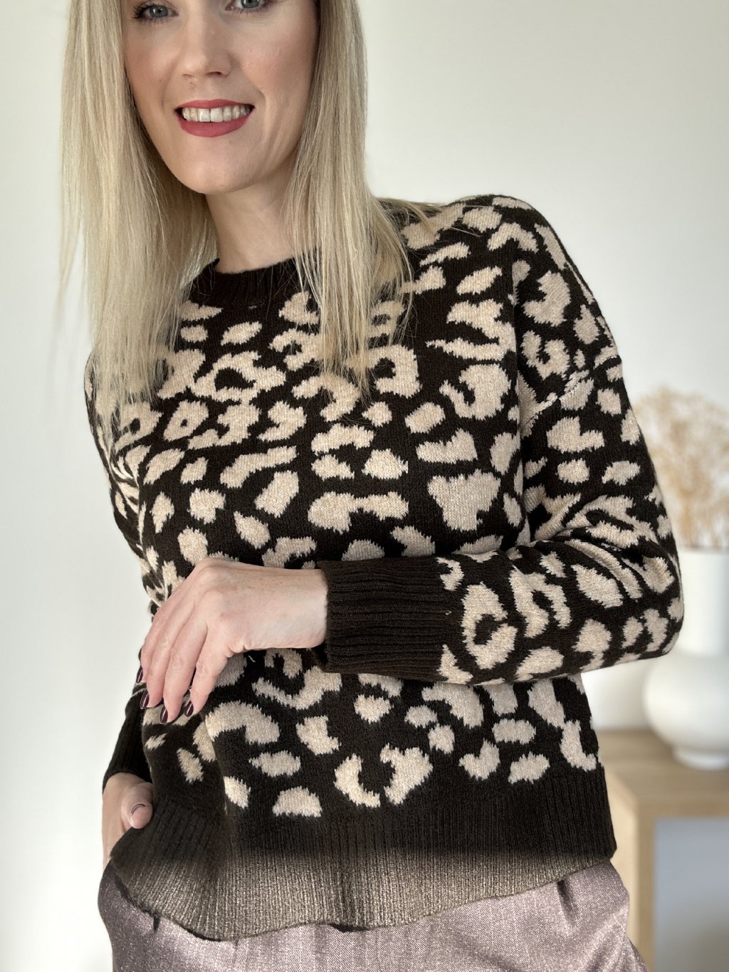 Sveter oversizového strihu s trendovým vzorom. Sedí na veľkosť S/XL.