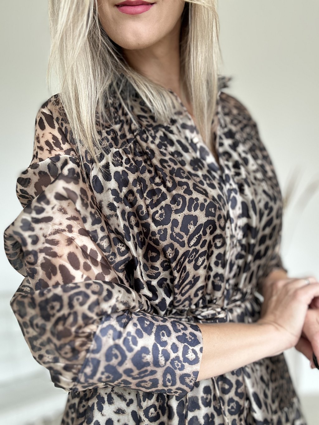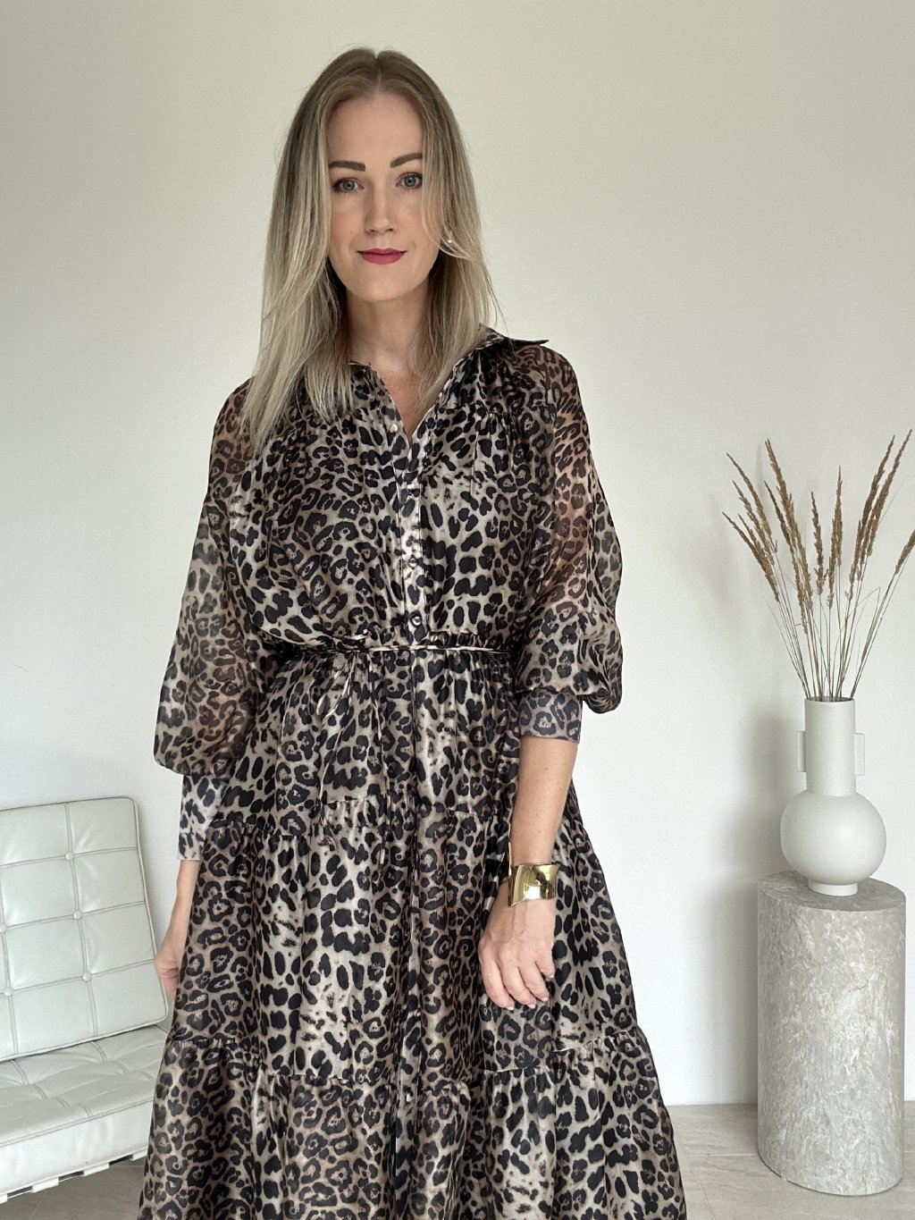 - Vzor: Celé šaty sú pokryté leopardím vzorom v odtieňoch hnedej a čiernej.