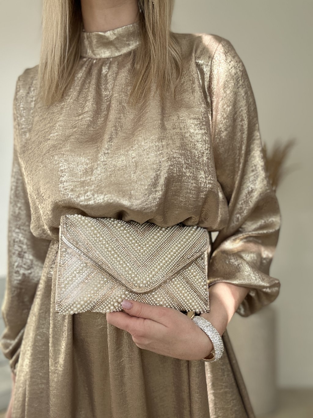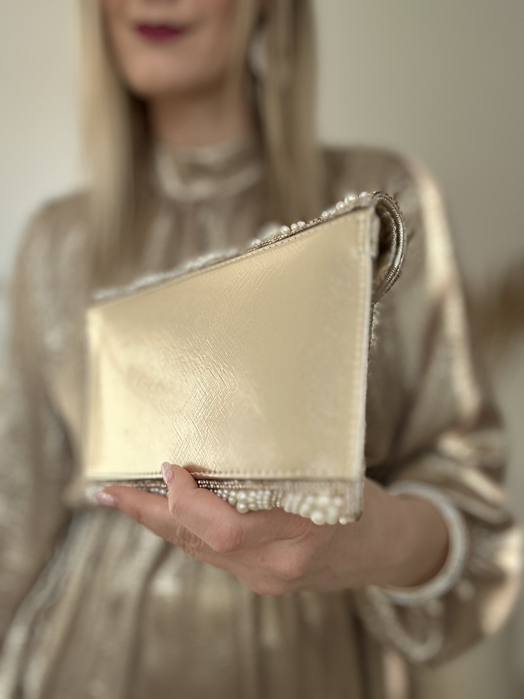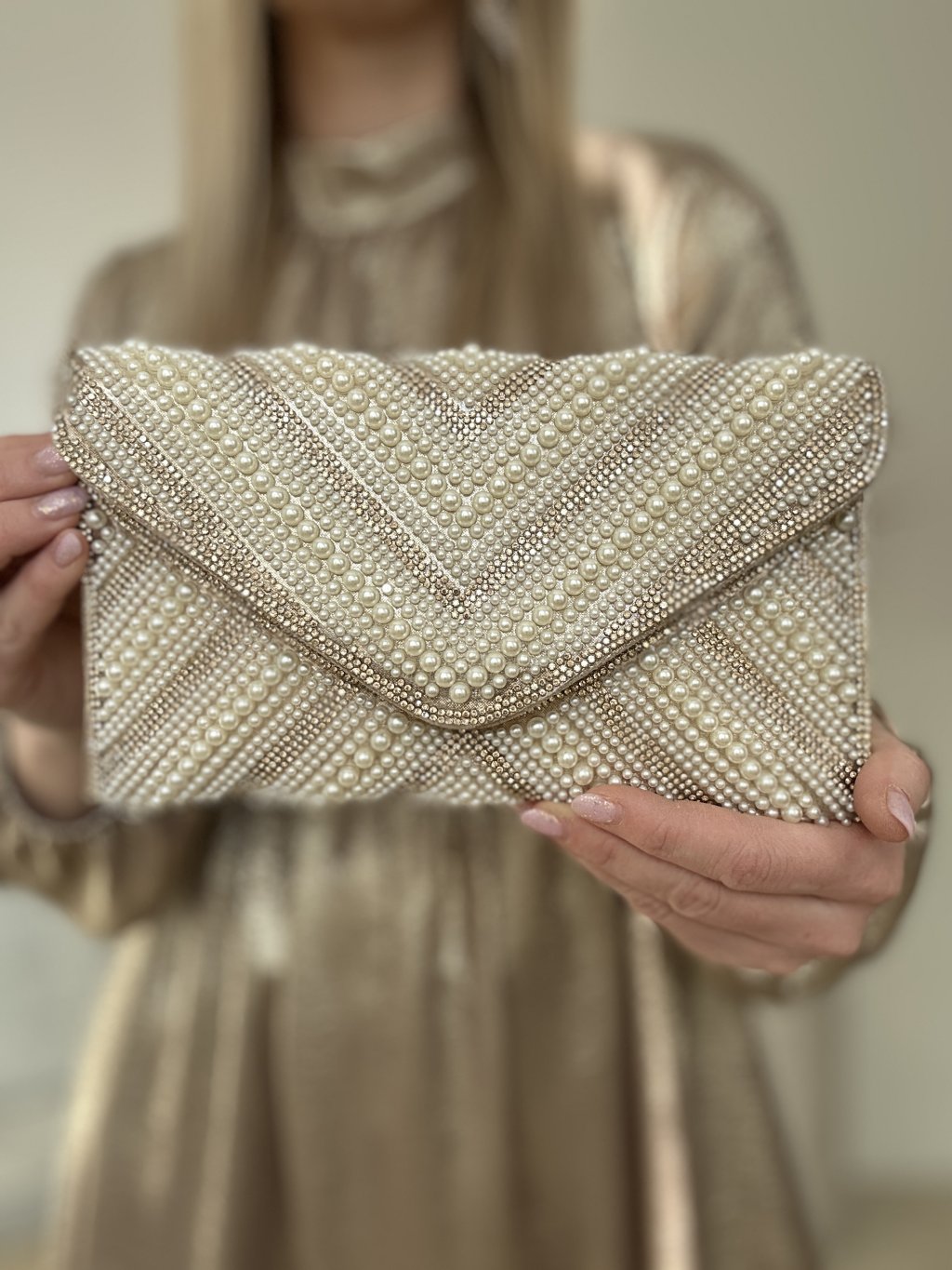 Parina Pearl Clutch Bag je luxusná dámska listová kabelka zdobená kombináciou rôzne veľkých perál a trblietavého podkladu v elegantnom šípkovom vzore. Táto spoločenská kabelka je ideálna na rôzne udalosti, ako sú svadby, plesy alebo večierky, a dodá vášmu outfitu nádych elegancie a sofistikovanosti.