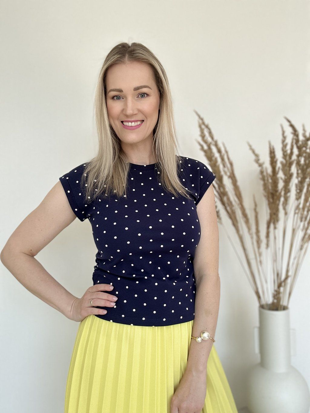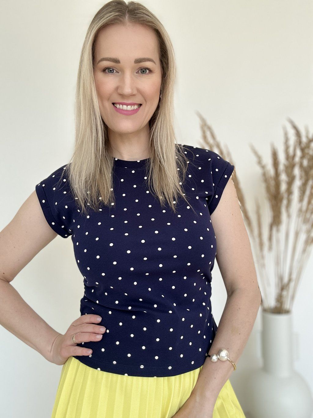 Oblečené tričko má tmavomodrú (navy) farbu s bielymi bodkami, krátke rukávy a okrúhly výstrih.
