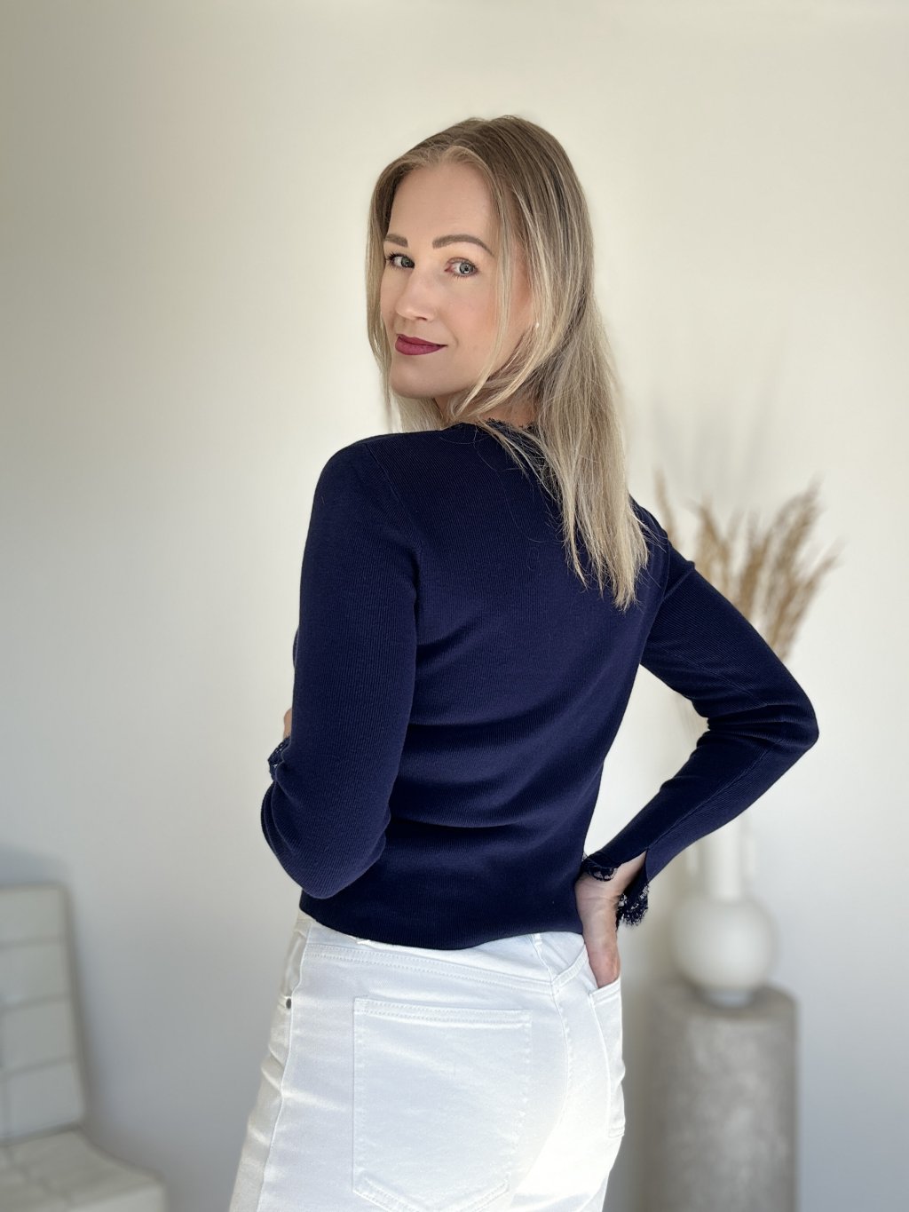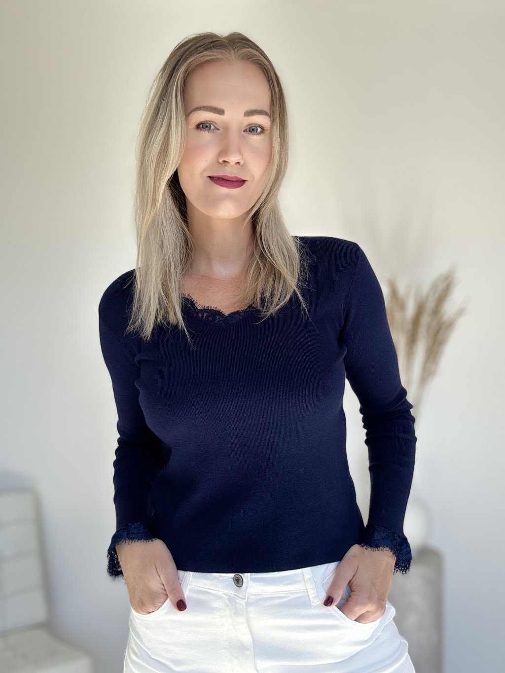 Modrý rebrovaný top s dlhými rukávmi a čipkovaným výstrihom do V. Spája v sebe eleganciu vďaka čipke a ležérnosť vďaka rebrovanému materiálu, čo ho robí vhodným na rôzne príležitosti.