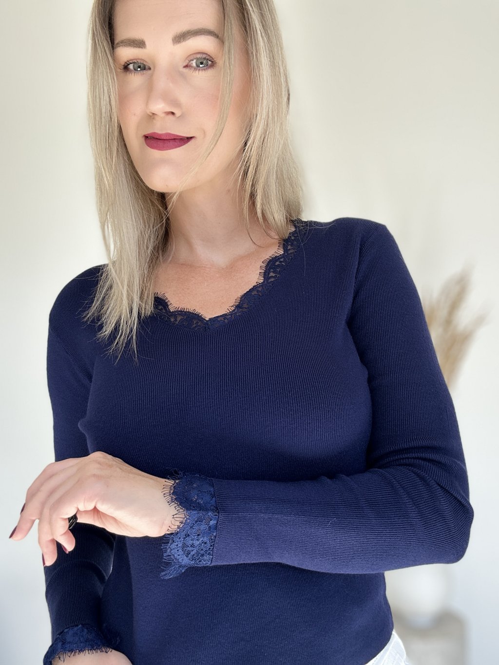 Modrý rebrovaný top s dlhými rukávmi a čipkovaným výstrihom do V.
