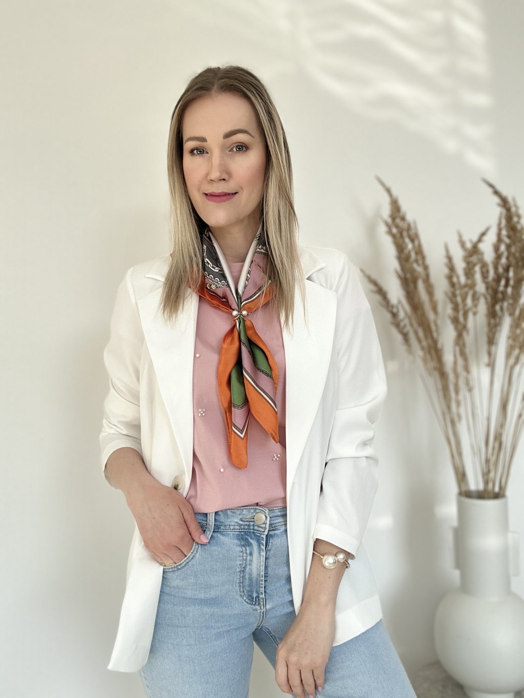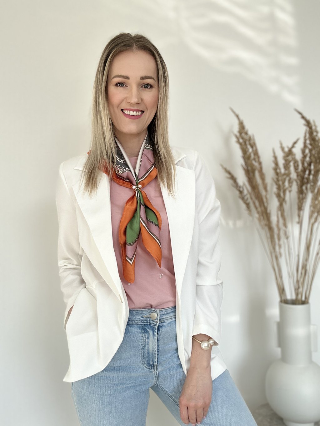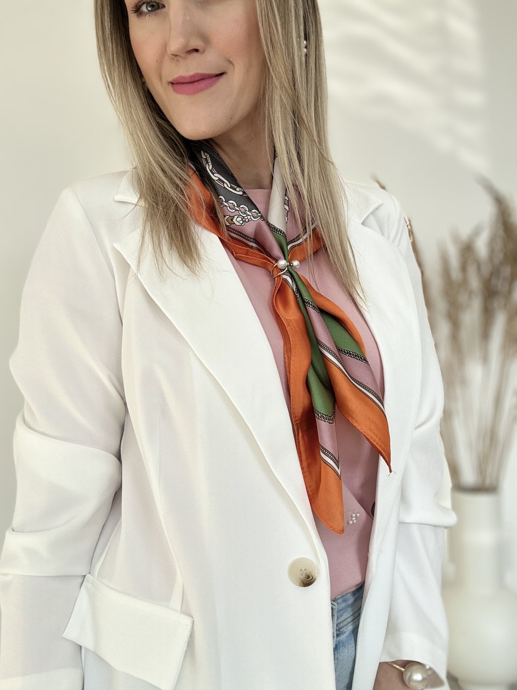 Elegantné dámske sako (blejzer) vyniká najmä svojou sviežou bielou farbou, ktorá pôsobí veľmi moderne a čisto.