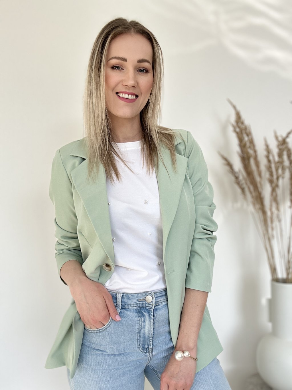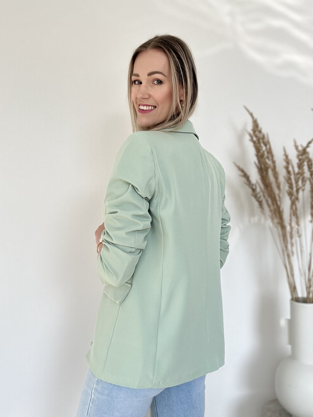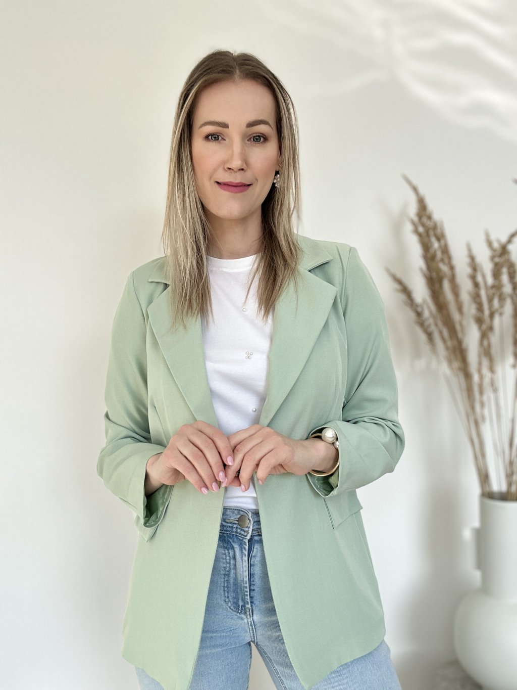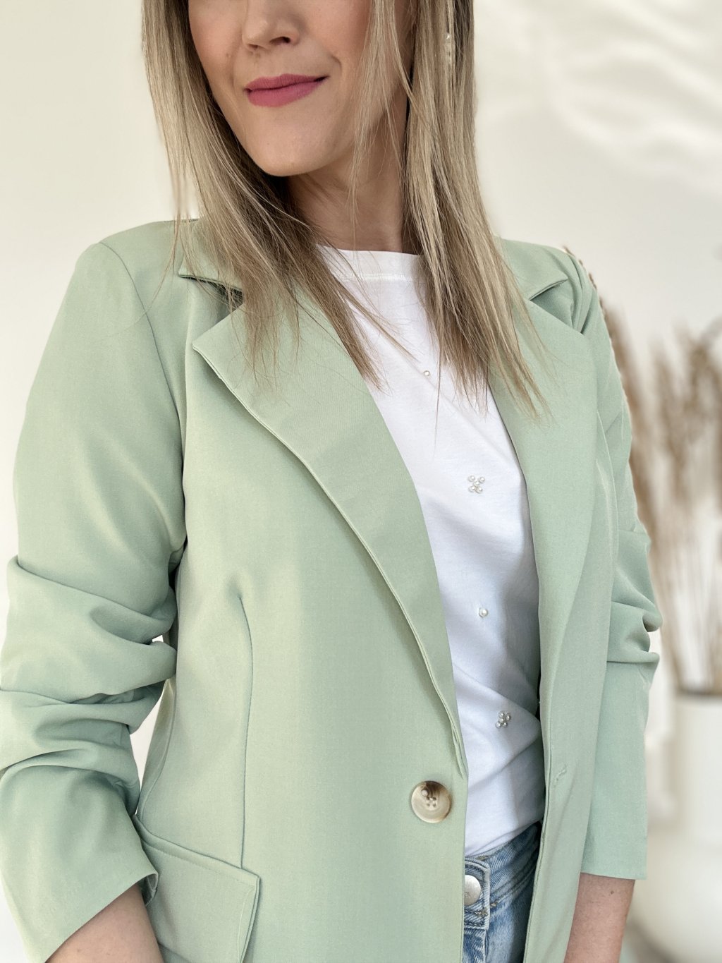 Elegantné dámske sako (blejzer) vyniká najmä svojou sviežou svetlozelenou farbou v odtieni mäty alebo pistácie, ktorá pôsobí veľmi moderne a čisto.