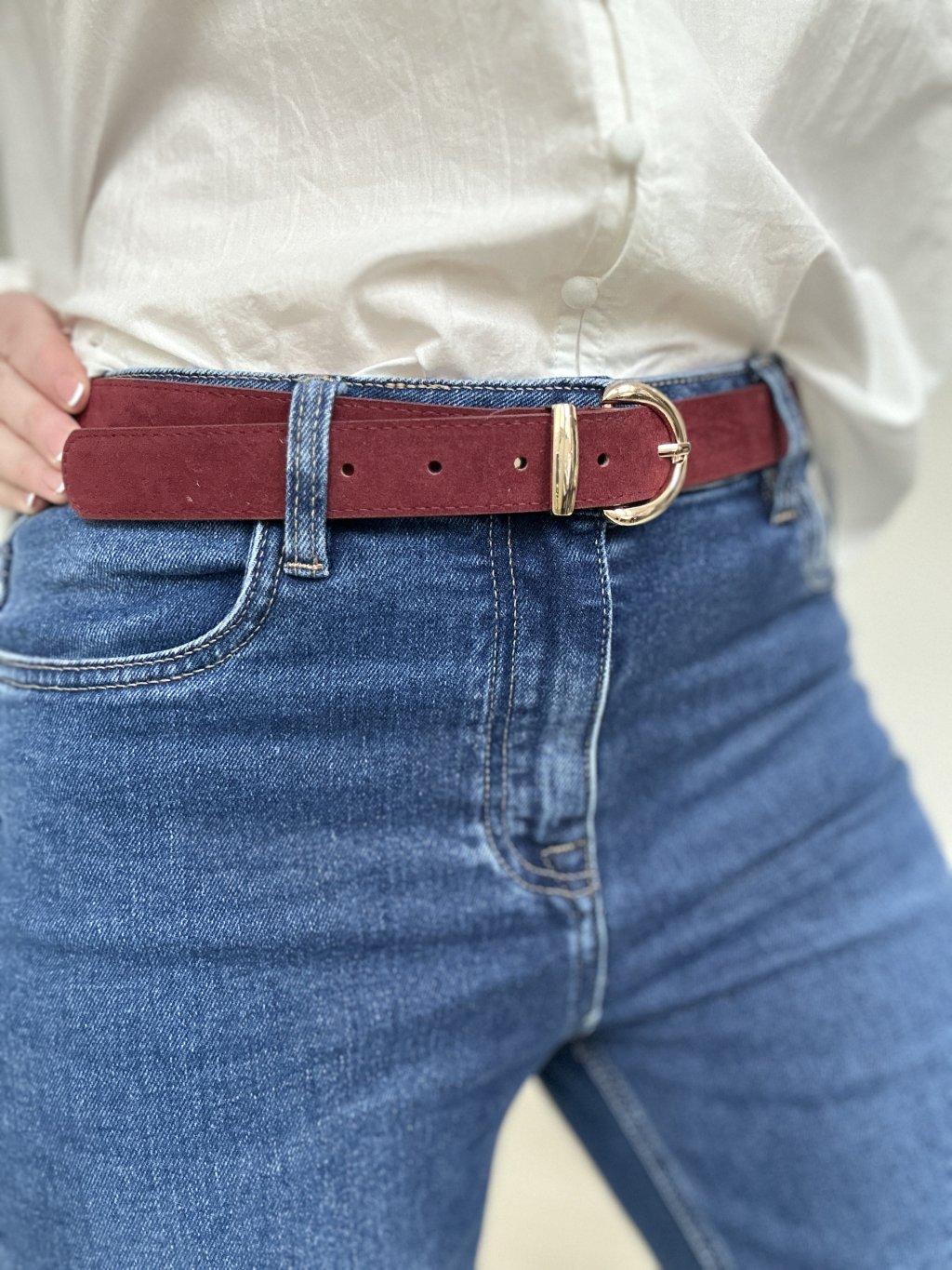 Perfektný semišový bordový opasok.