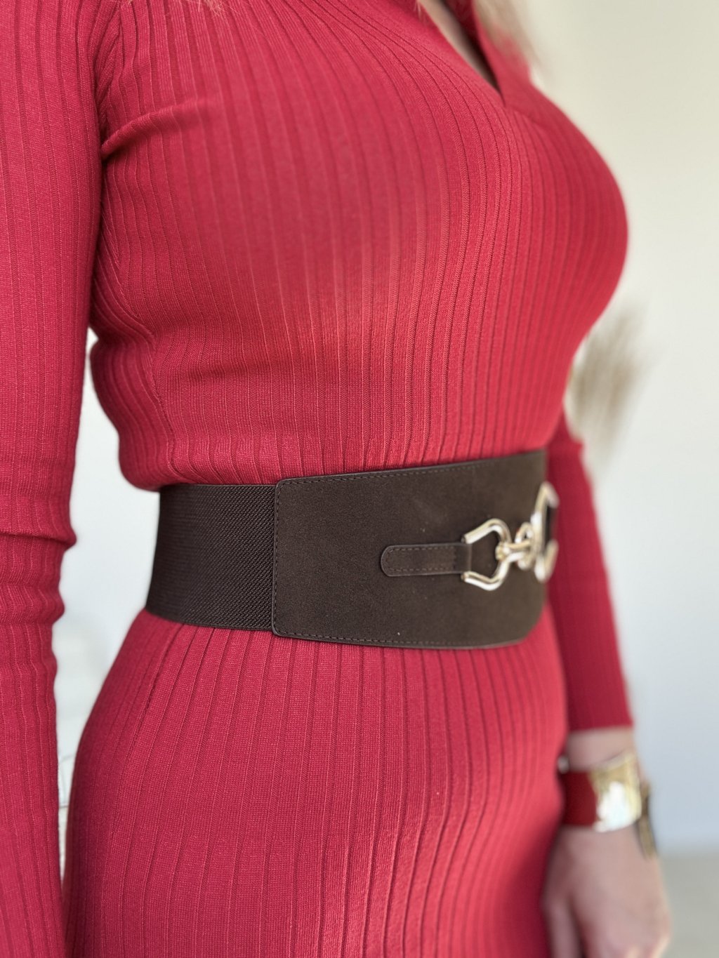 Tmavohnedý elastický opasok s dominantnou lesklou zlatou prackou ktorá slúži ako zapínanie a zároveň ako dekoratívny prvok. Opasok má moderný a elegantný vzhľad, vhodný na doplnenie rôznych outfitov, ako sú šaty, tuniky alebo blúzky.