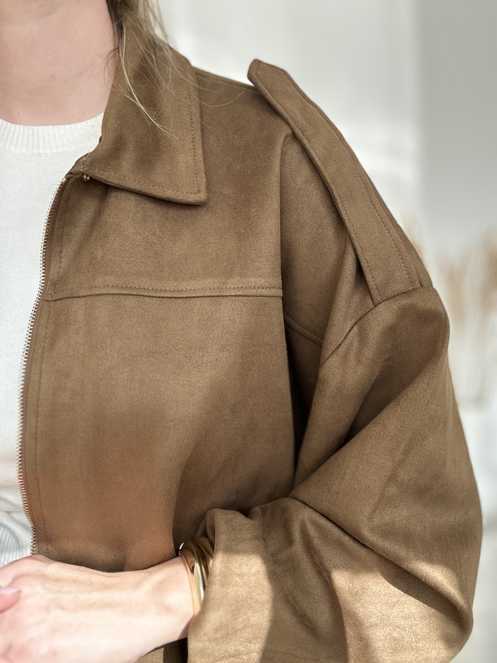 Štýlová oversize bunda s voľným strihom a zapínaním na zips a cvoky. Bunda má podšívku.