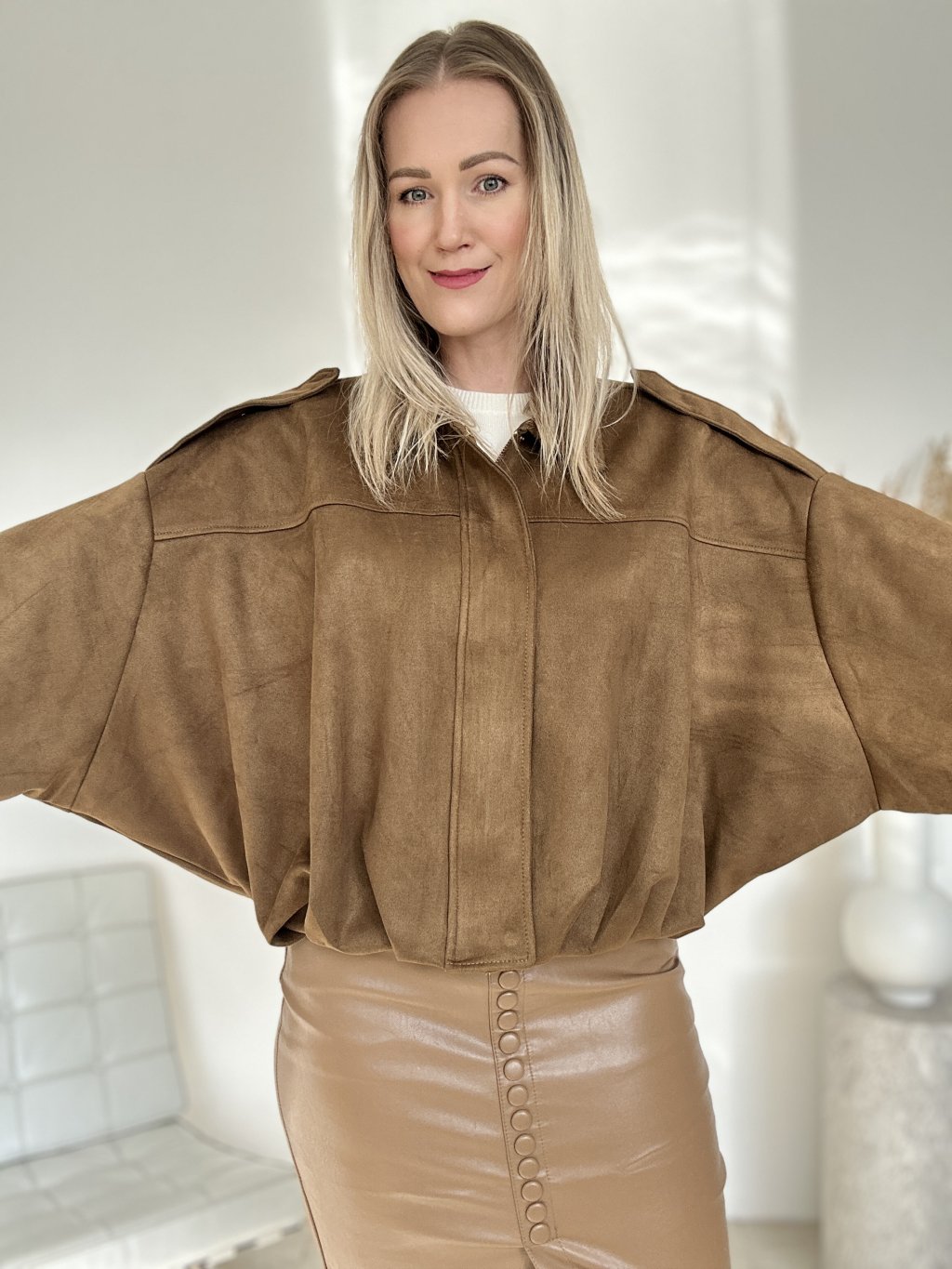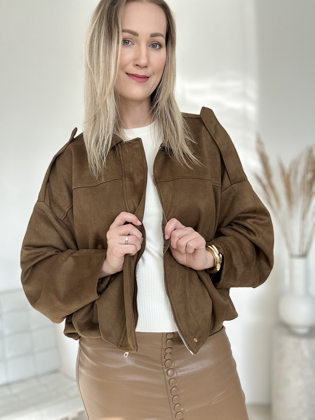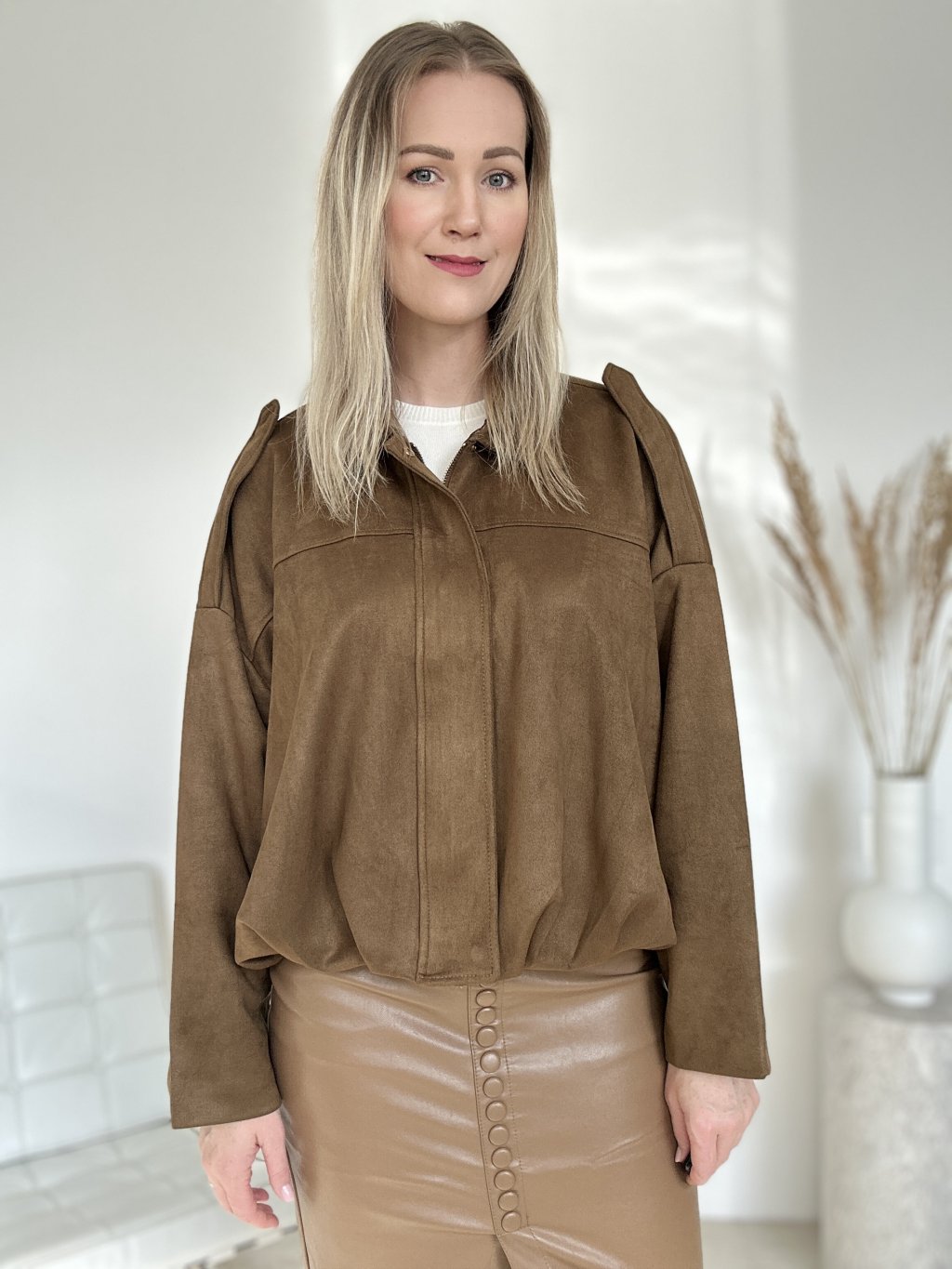 Oversize bunda je moderným kúskom, ktorý spája štýl a komfort. Jej voľnejší strih pôsobí ležérne, no zároveň elegantne a dodáva outfitu originálny charakter. Bunda má zapínanie na zips a cvoky, praktické vrecká a výrazné ramená so štruktúrovanými detailmi. Je ideálna na vrstvenie – či už so šatami, sukňou alebo džínsami, vždy vytvorí trendy vzhľad, ktorý upúta pozornosť.