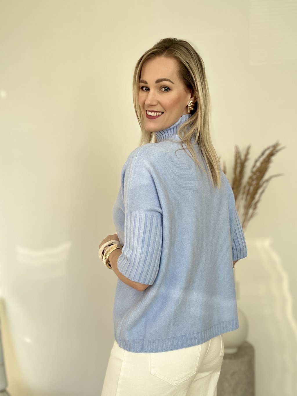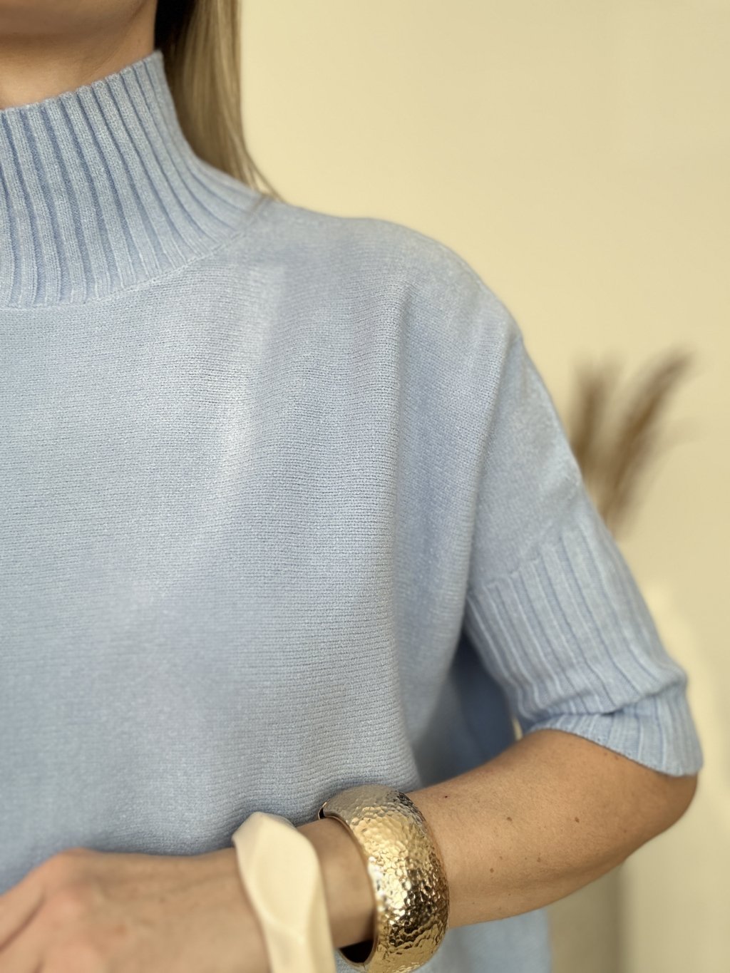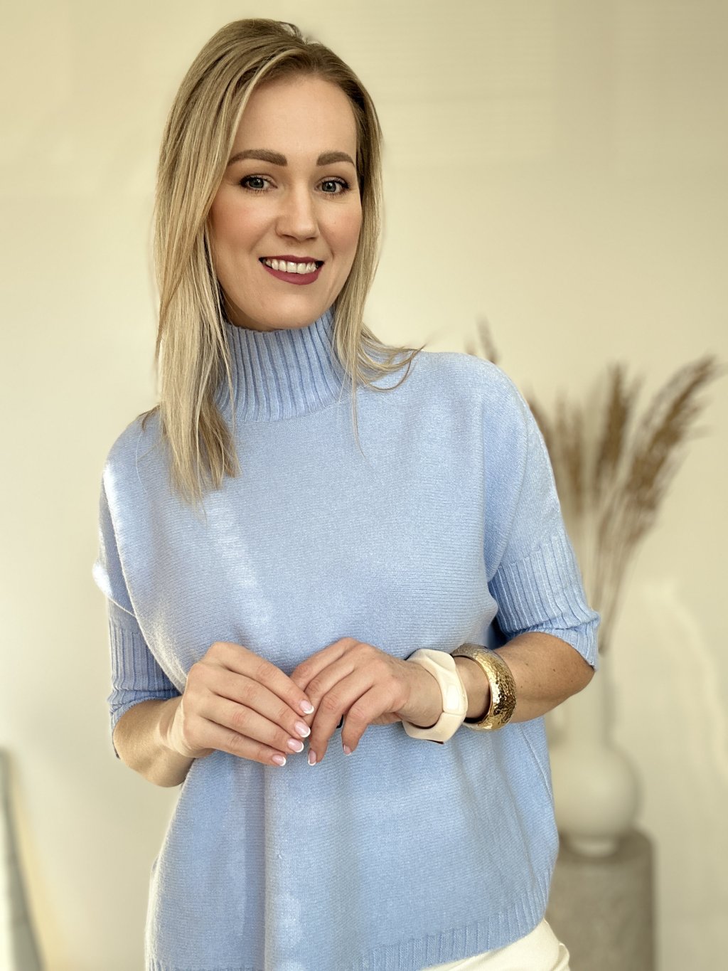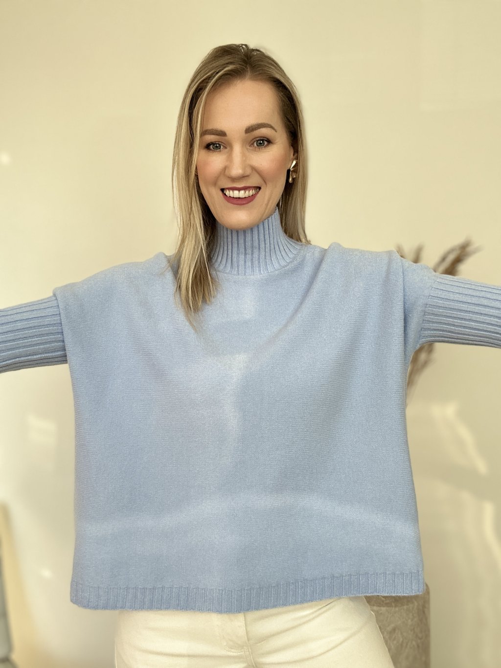 Štýl: Tento typ topu je často charakterizovaný voľným (oversize) strihom a rebrovaným, elastickým rolákom, ktorý mu dodáva eleganciu.