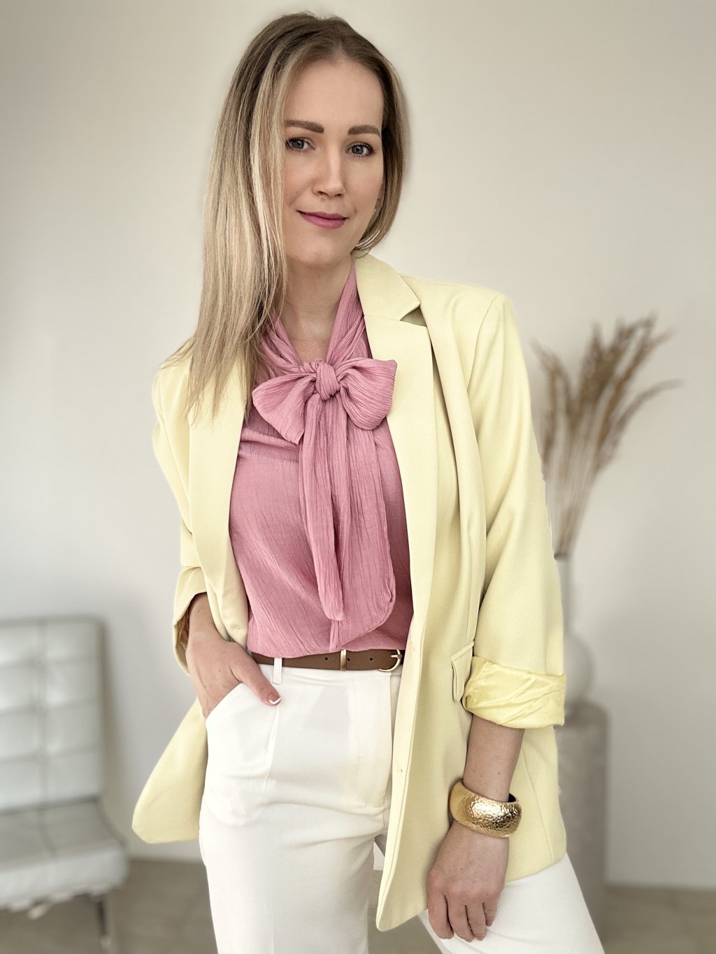 Ide o pastelovo žlté oversize sako s klasickými chlopňami a zapínaním na gombík. . Možnosť kombinácie s nohavicami.