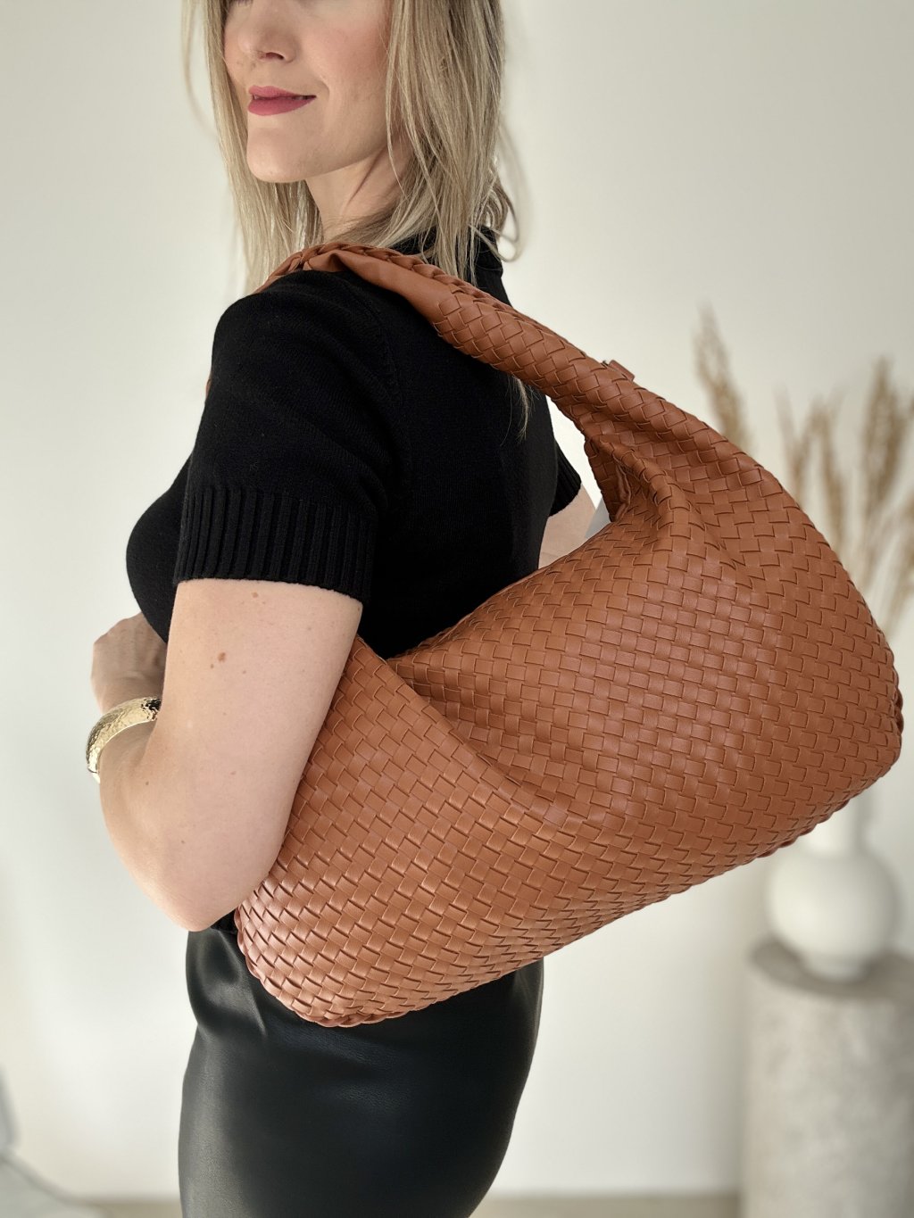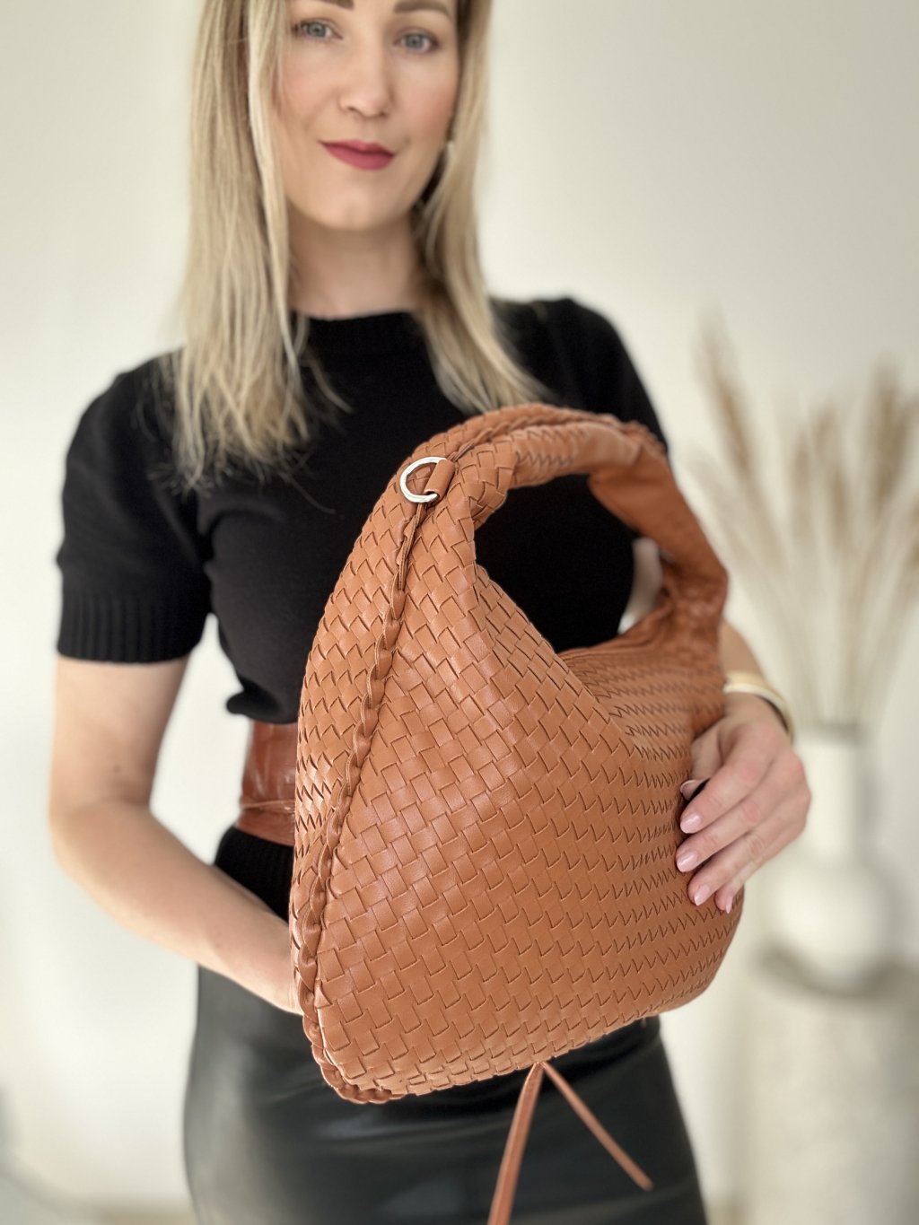Pletená kabelka na rameno so zapínaním na zips. Vnútro má dve bočné vrecká a jedno stredné vrecko so zapínaním na zips.