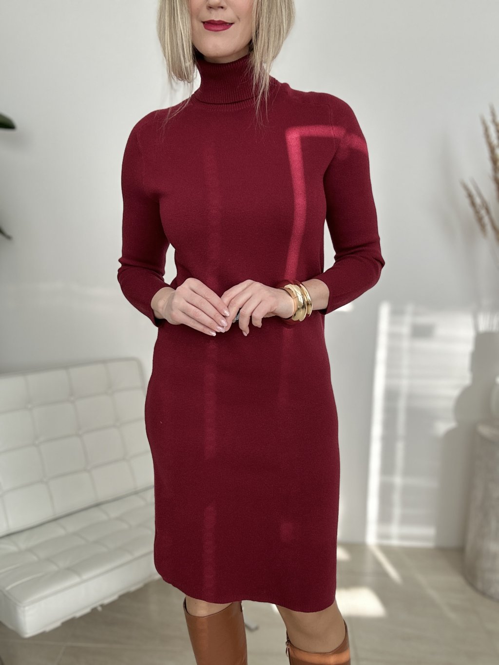Bordové úpletové rolákové šaty sú rovného strihu, siahajúce pod kolená a majú dlhé rukávy. Sú ideálne na chladnejšie dni vďaka teplému materiálu a strihu.