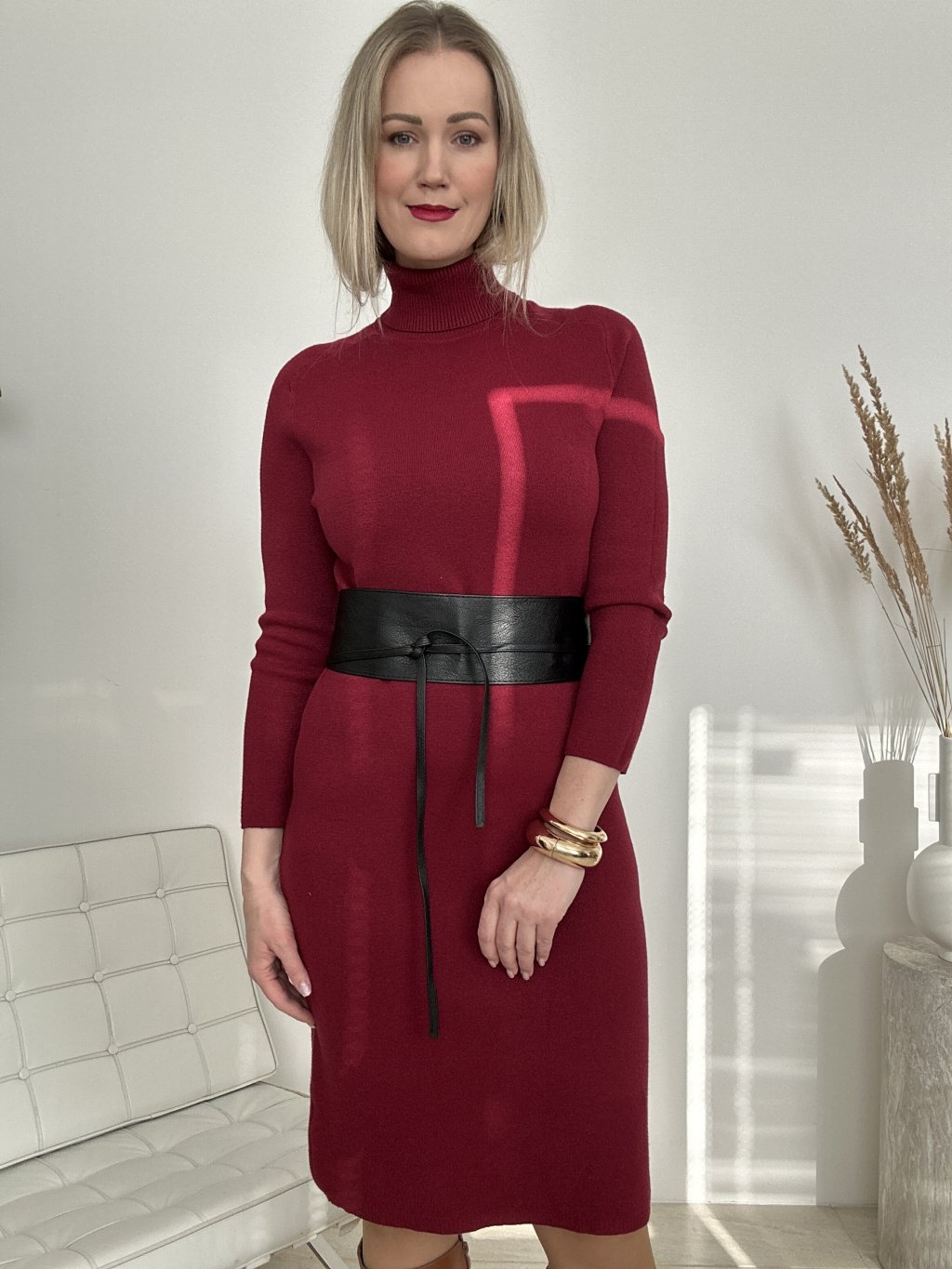 Bordové úpletové rolákové šaty sú rovného strihu, siahajúce pod kolená a majú dlhé rukávy. Sú ideálne na chladnejšie dni vďaka teplému materiálu a strihu. Detail: Výrazným prvkom je vysoký rolákový golier, ktorý chráni krk pred chladom.