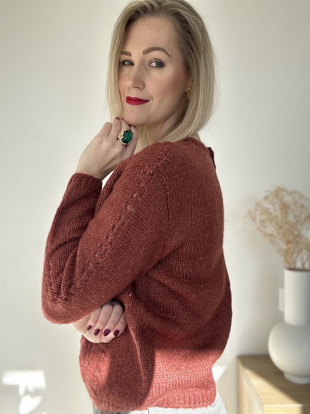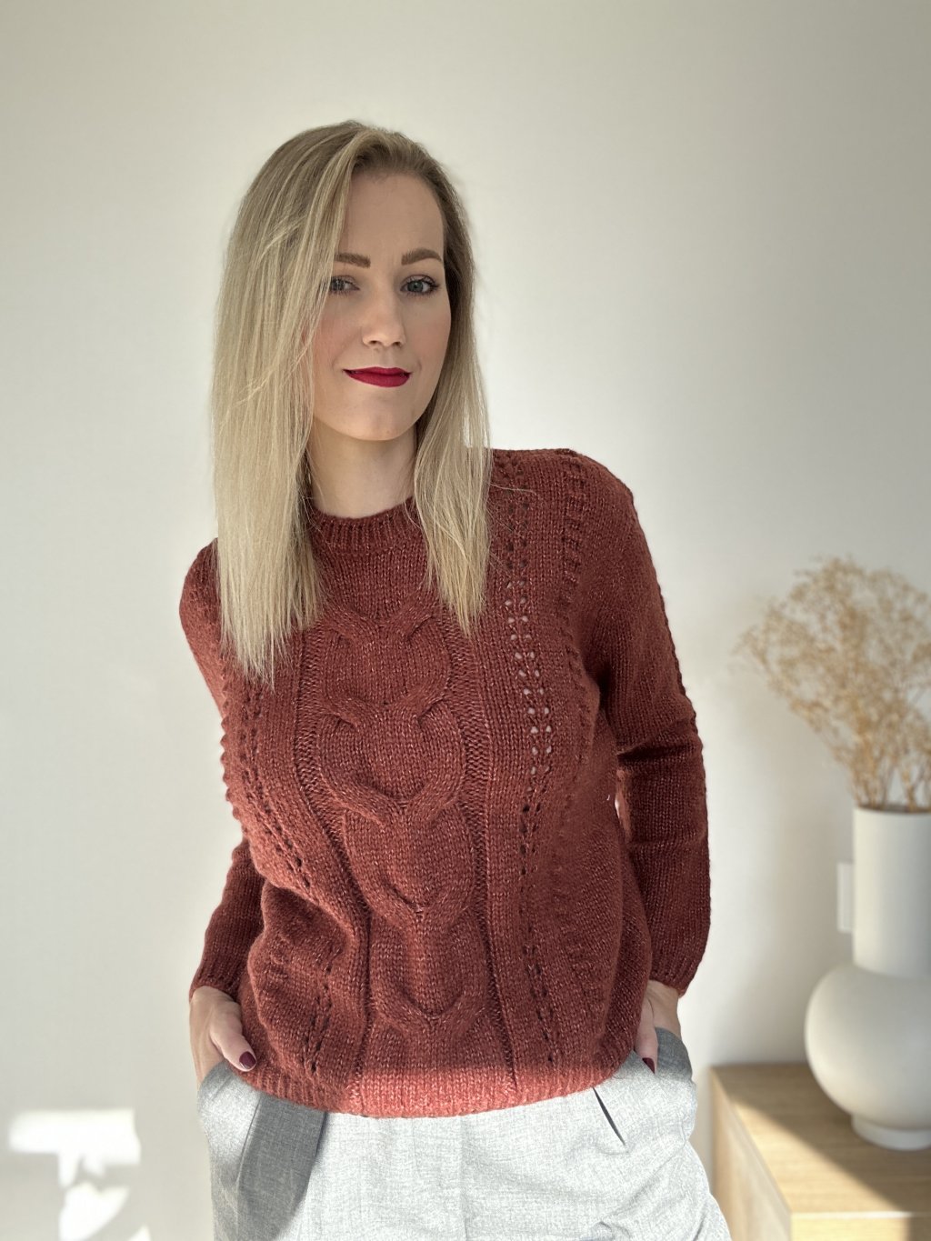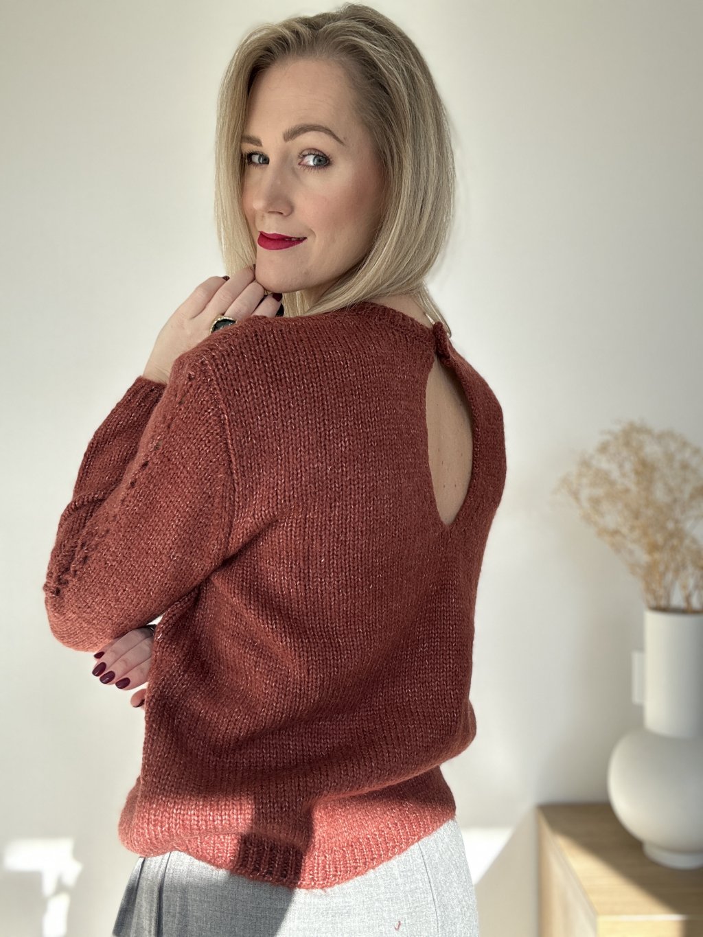 Pletený sveter klasického strihu so zapínaním vzadu na krku.