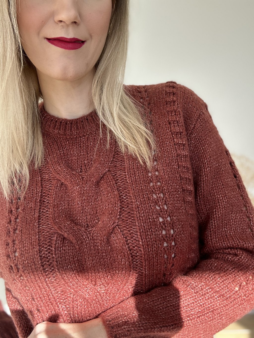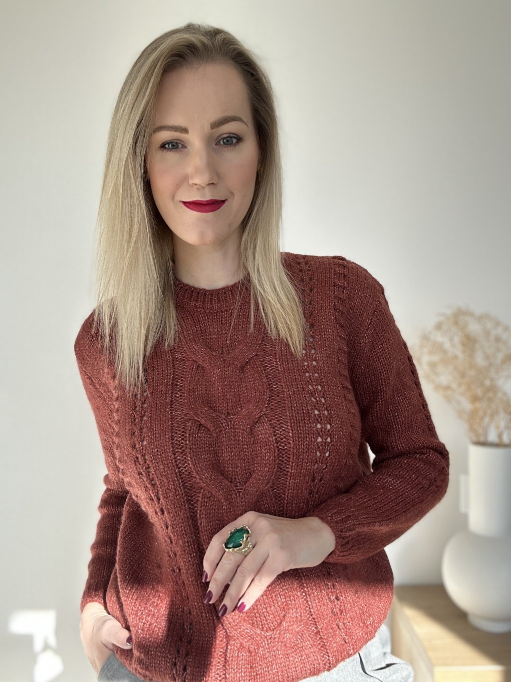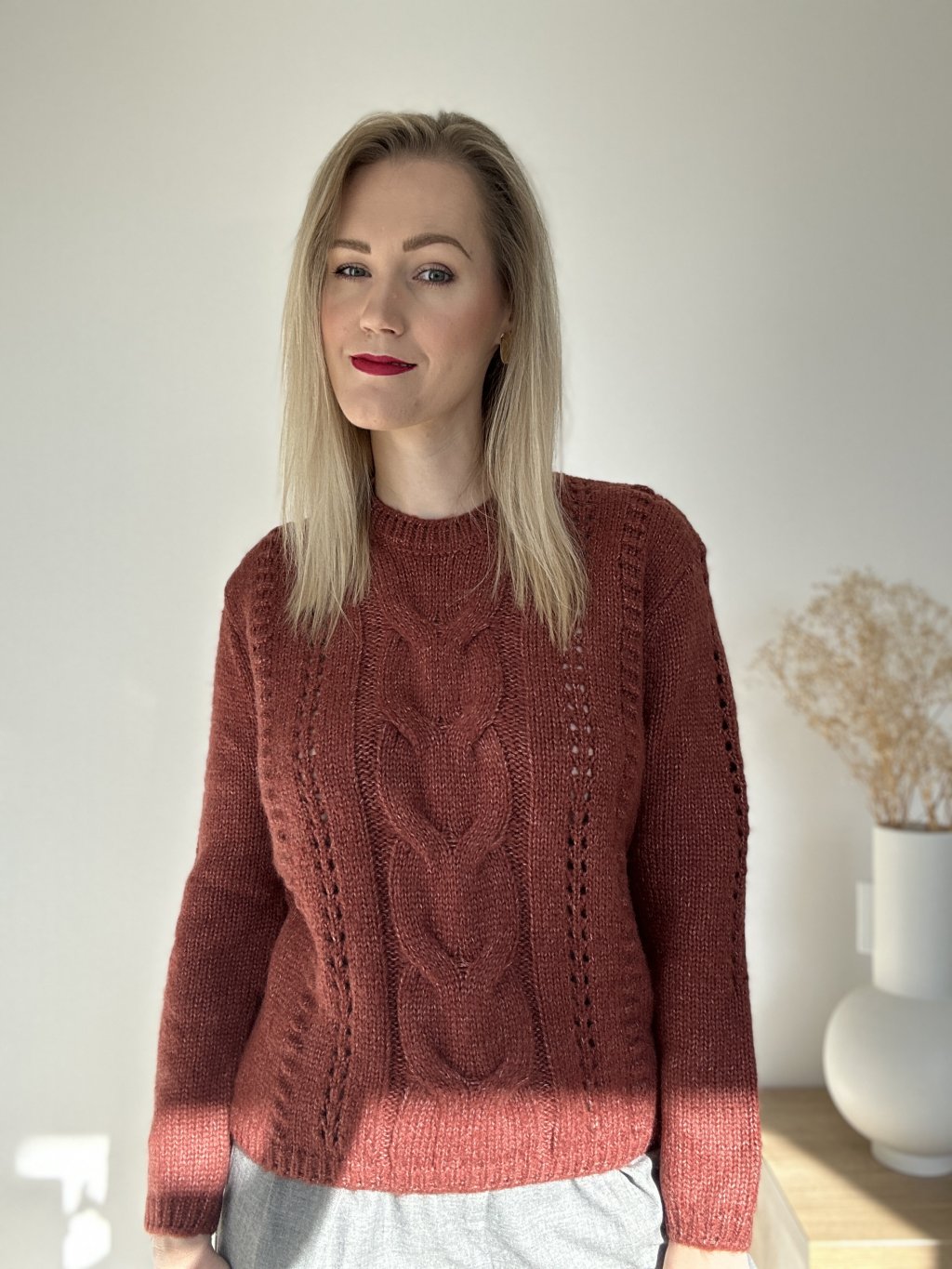 Pletený sveter klasického strihu so zapínaním vzadu na krku.
