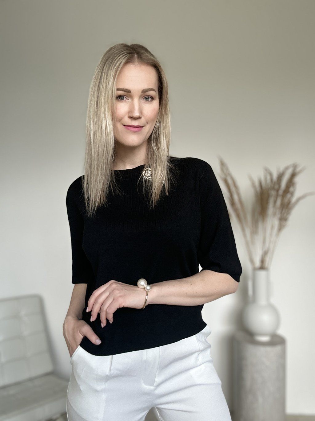Čierny pletený top s okrúhlym výstrihom, jemne oversizový a stredne dlhými, voľnými rukávmi. Top je všestranný a štýlový kúsok, ktorý sa hodí na rôzne príležitosti. Sˇučasťou je aj ozdobná brošňa.