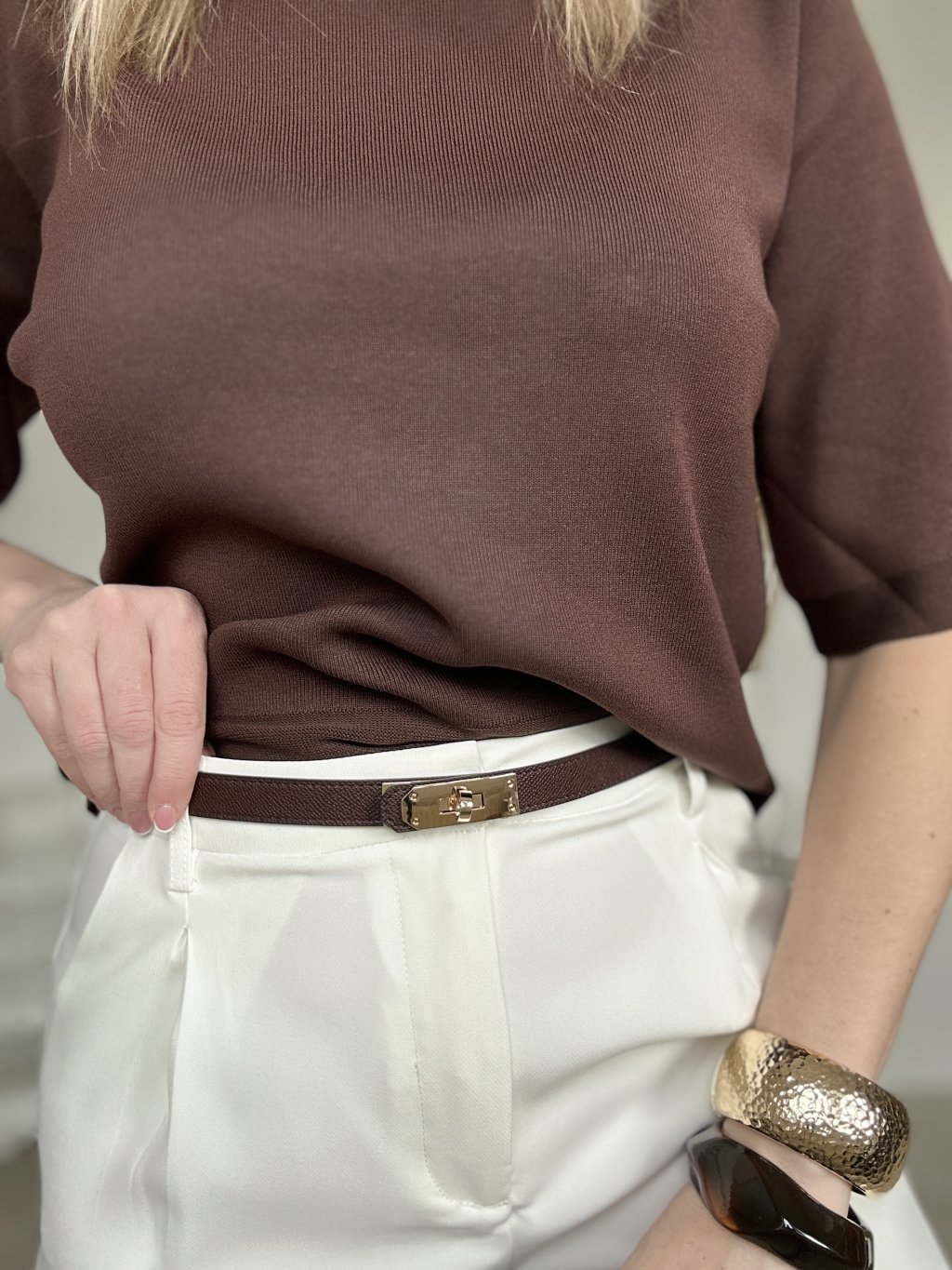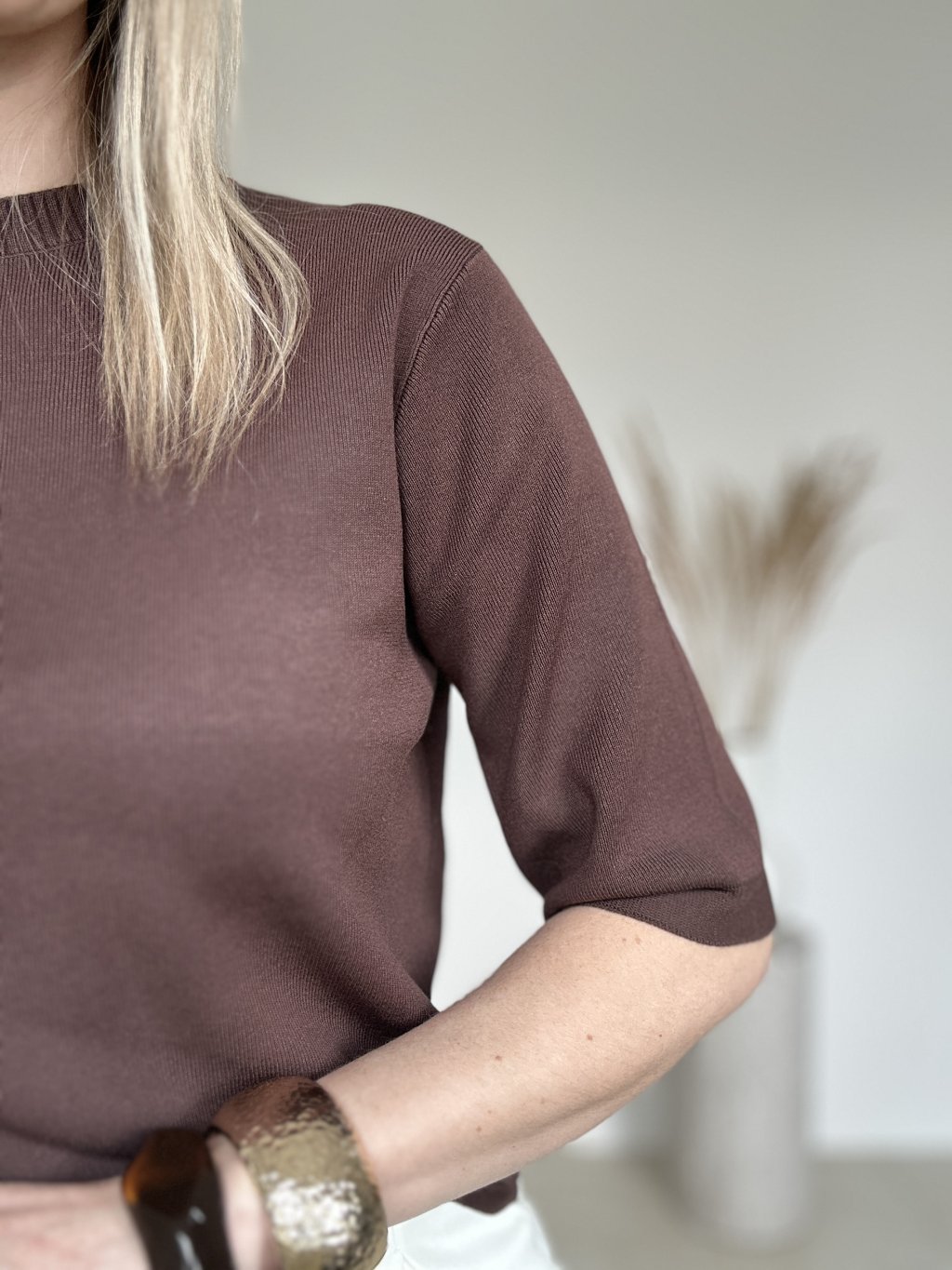 Čokoládový pletený top s okrúhlym výstrihom a stredne dlhými, voľnými rukávmi. Top je všestranný a štýlový kúsok, ktorý sa hodí na rôzne príležitosti. Súčasťou je aj ozdobná brošňa.