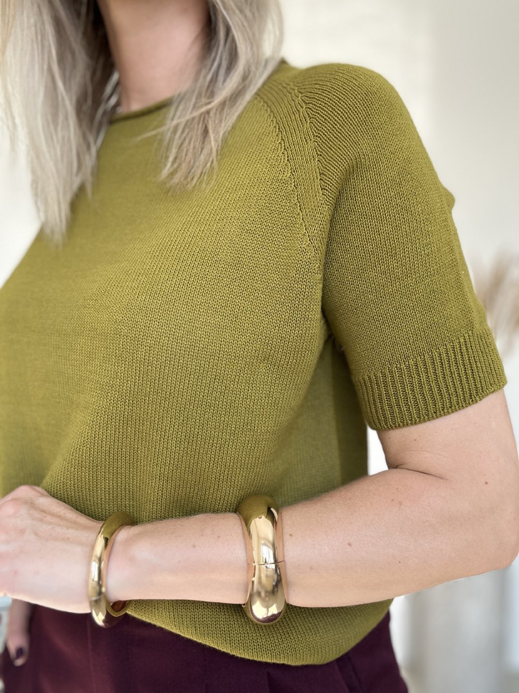 Dámsky pletený bavlnený top s okrúhlim výstrihom a krátkymi raglánovými rukávmi.