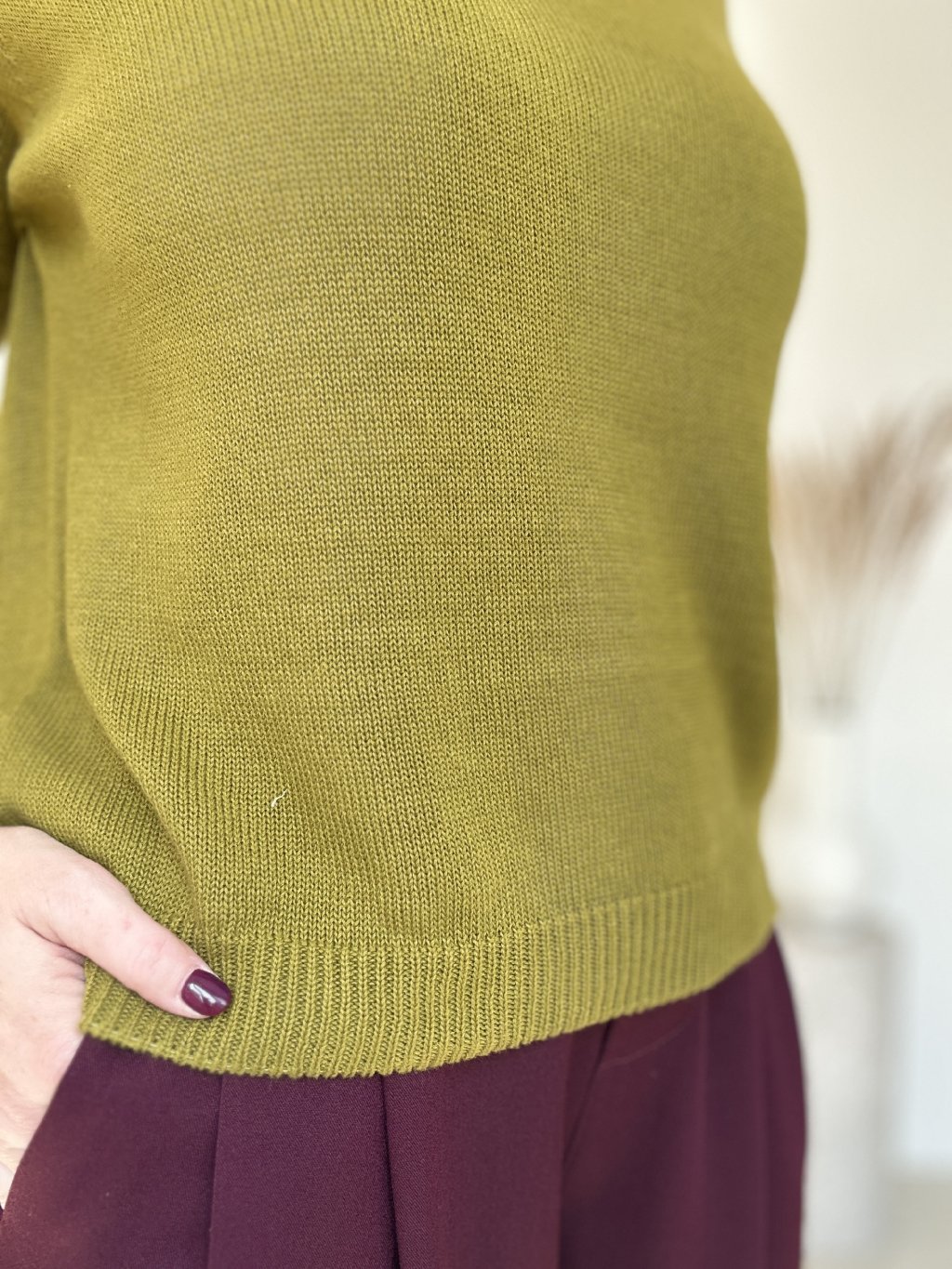 Dámsky pletený top s okrúhlim výstrihom a krátkymi raglánovými rukávmi. Top ideálny na prechodné obdobia alebo letné večery. Spodný okraj a manžety rukávov sú zakončené rebrovaným patentom.