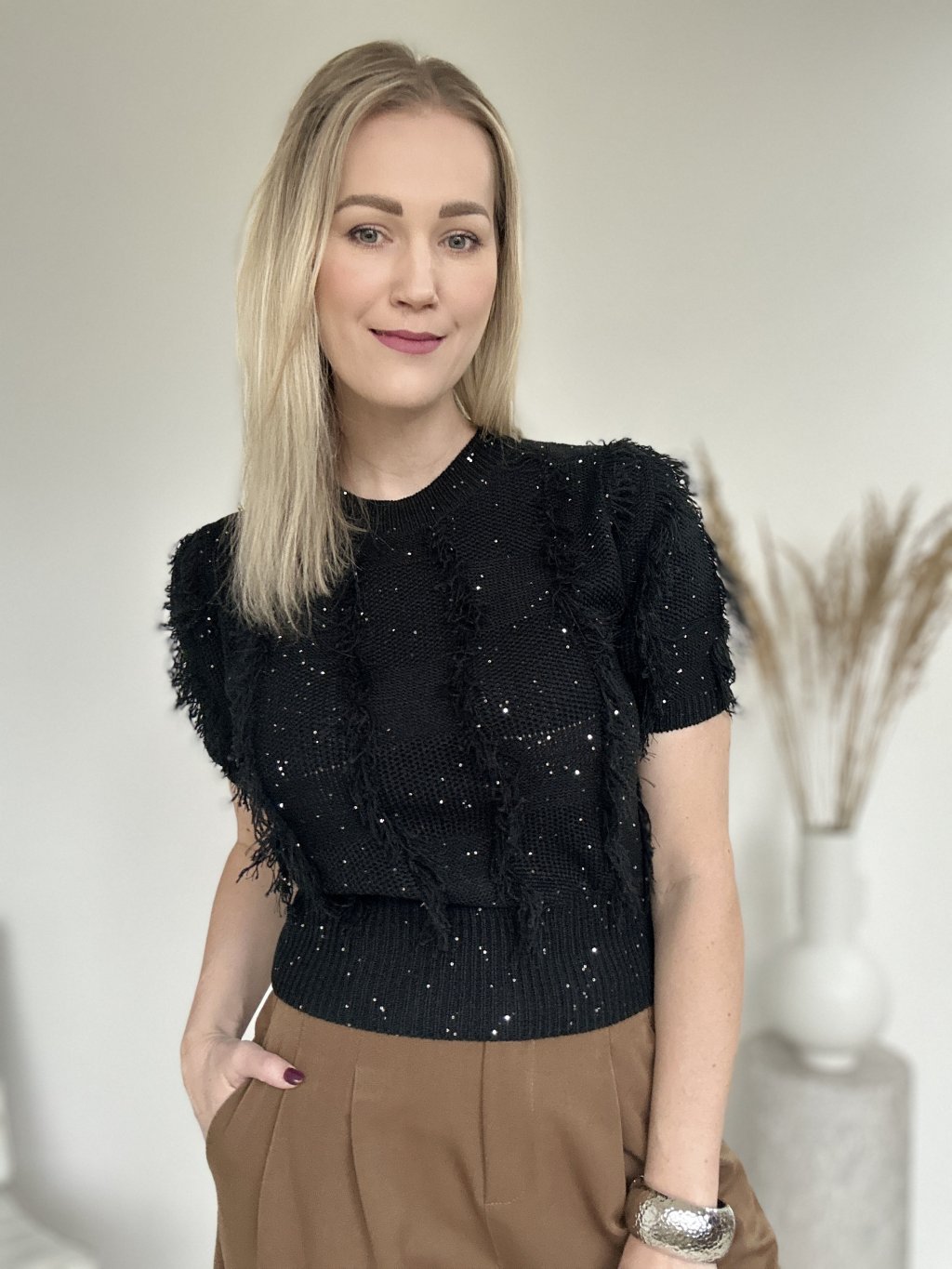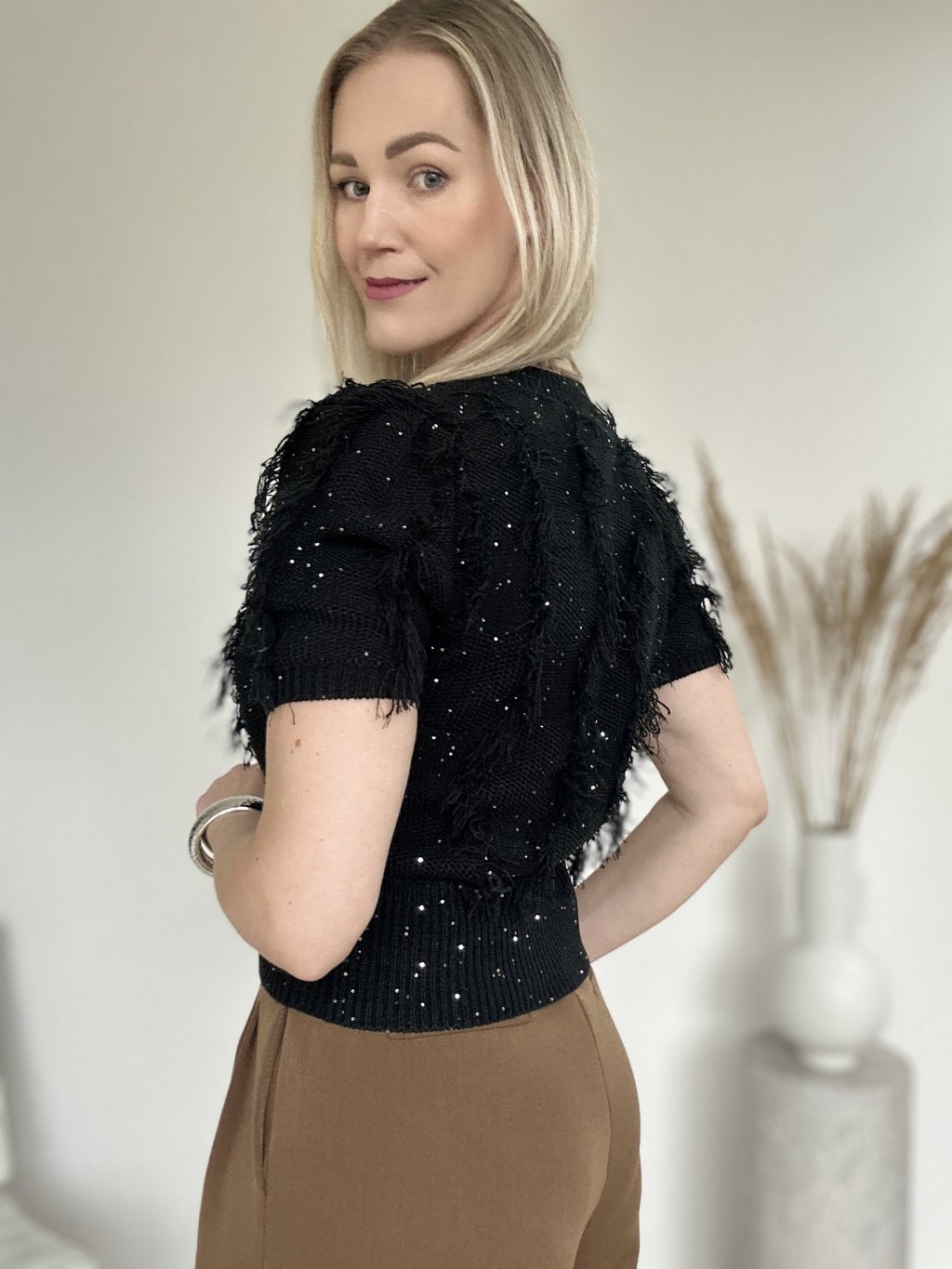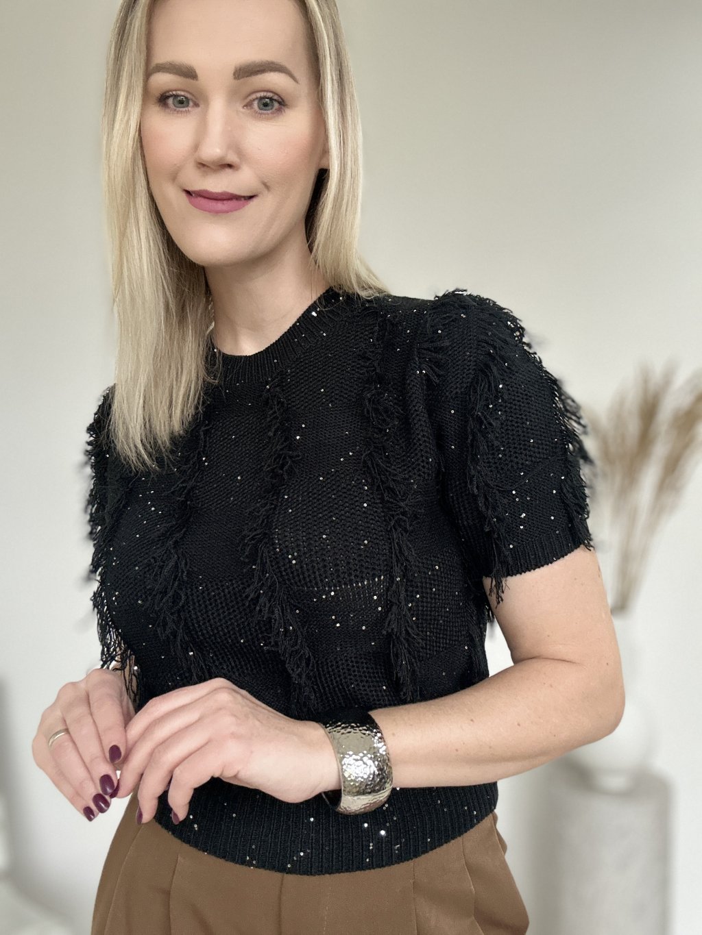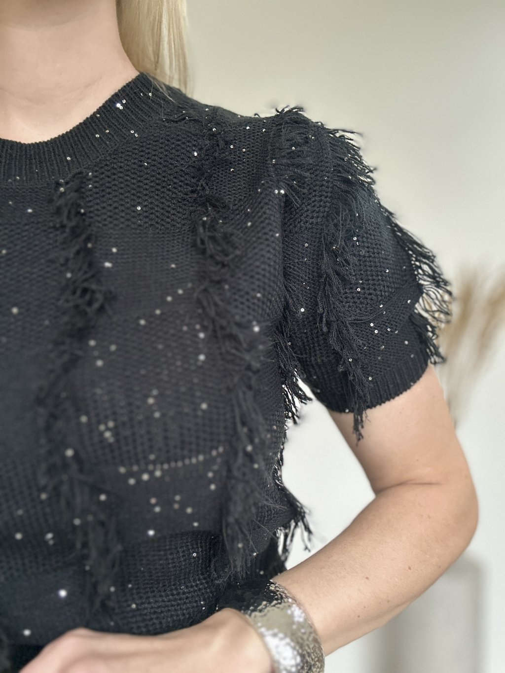 Pletený elastický top s krátkym rukávom a textúrovanými, strapcovými detailmi.