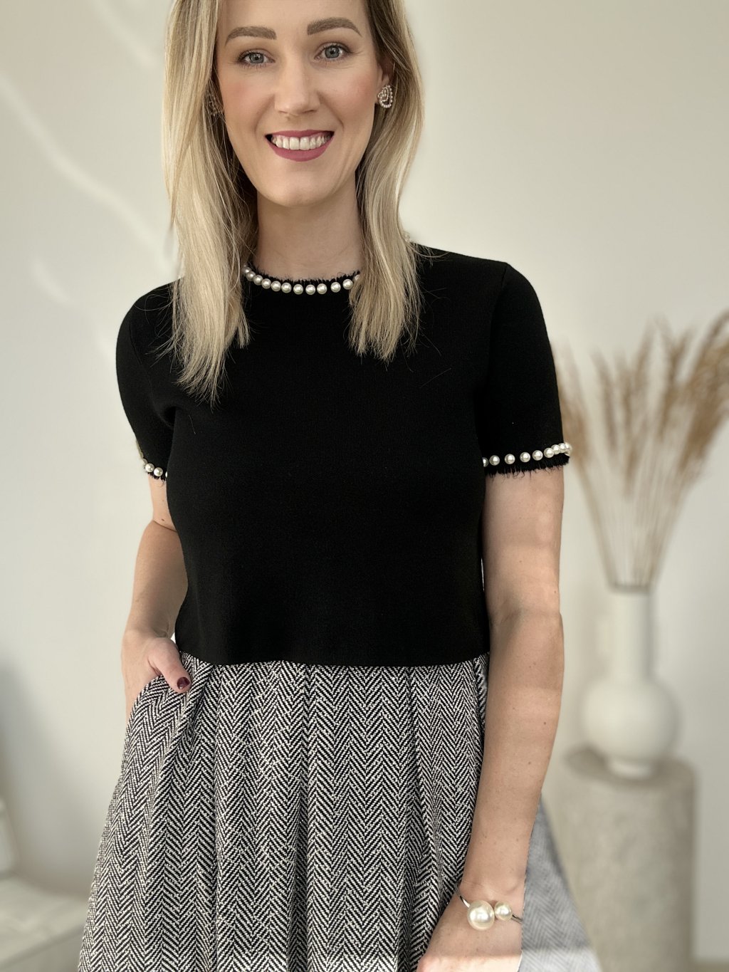 Pletený elastický hrubší top s krátkymi rukávmi s detailmi z umelých perál na golieri a manžetách rukávov.