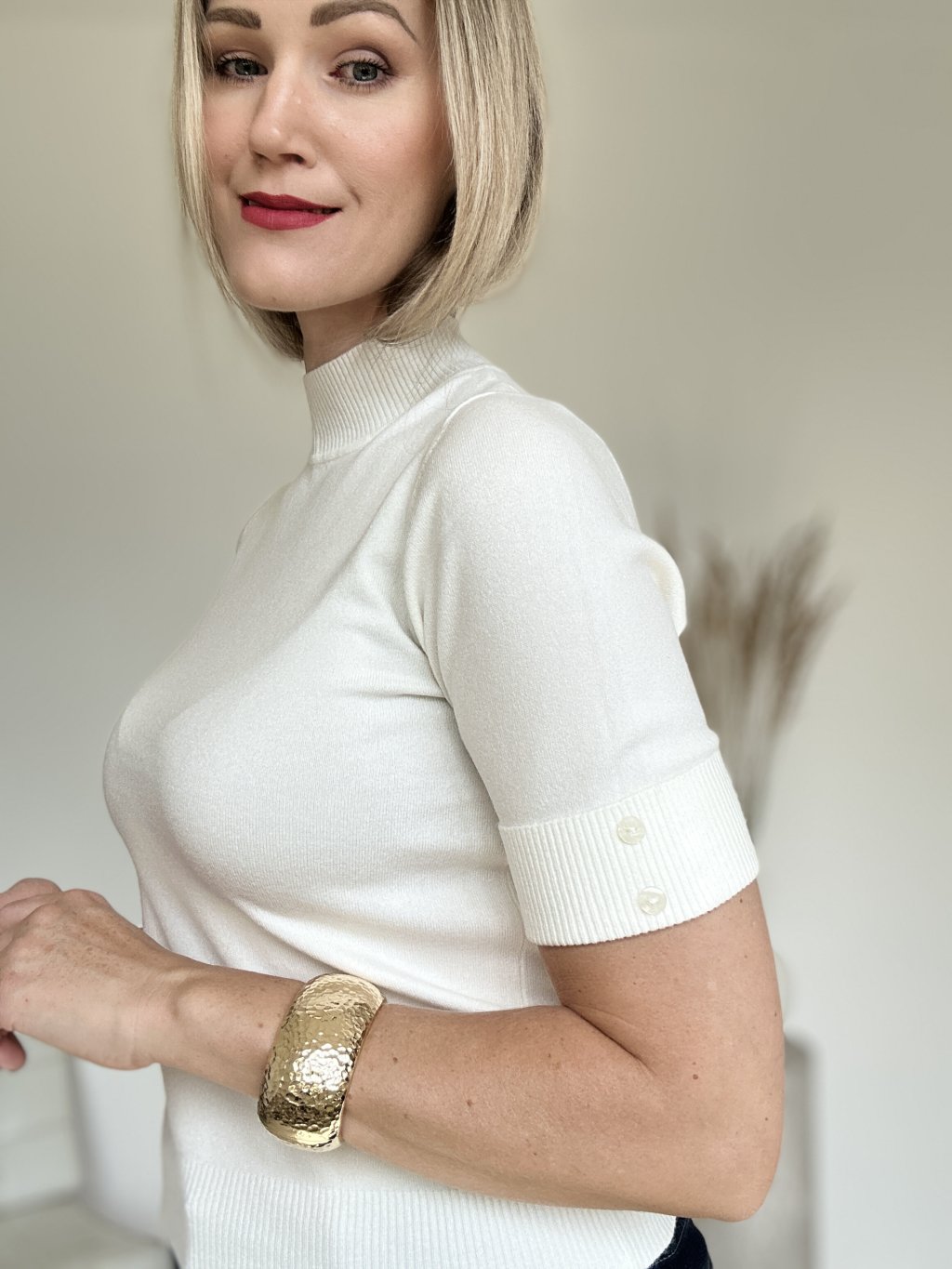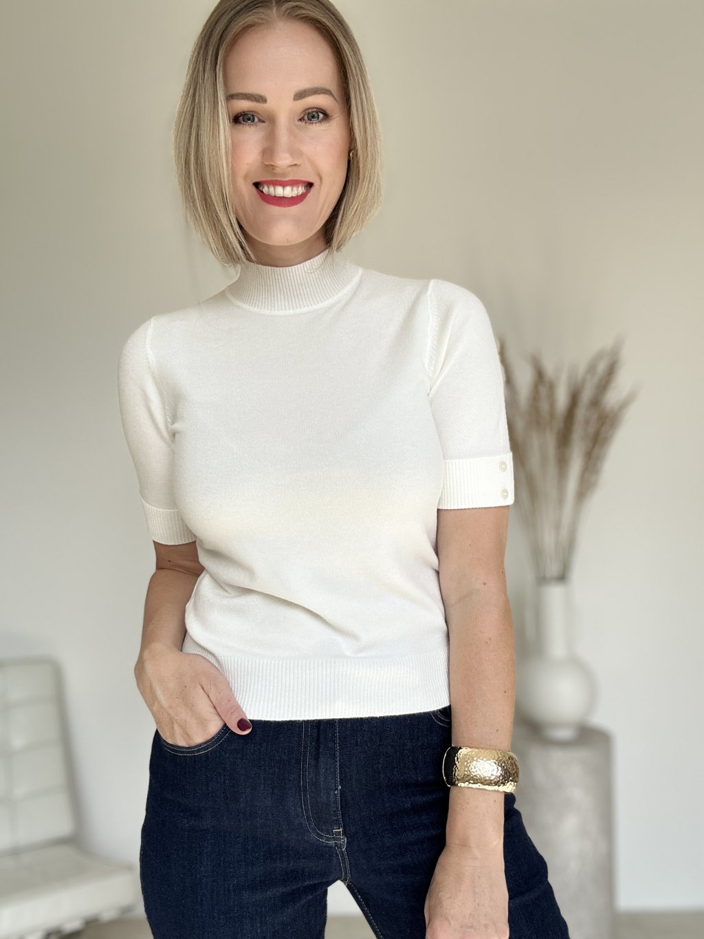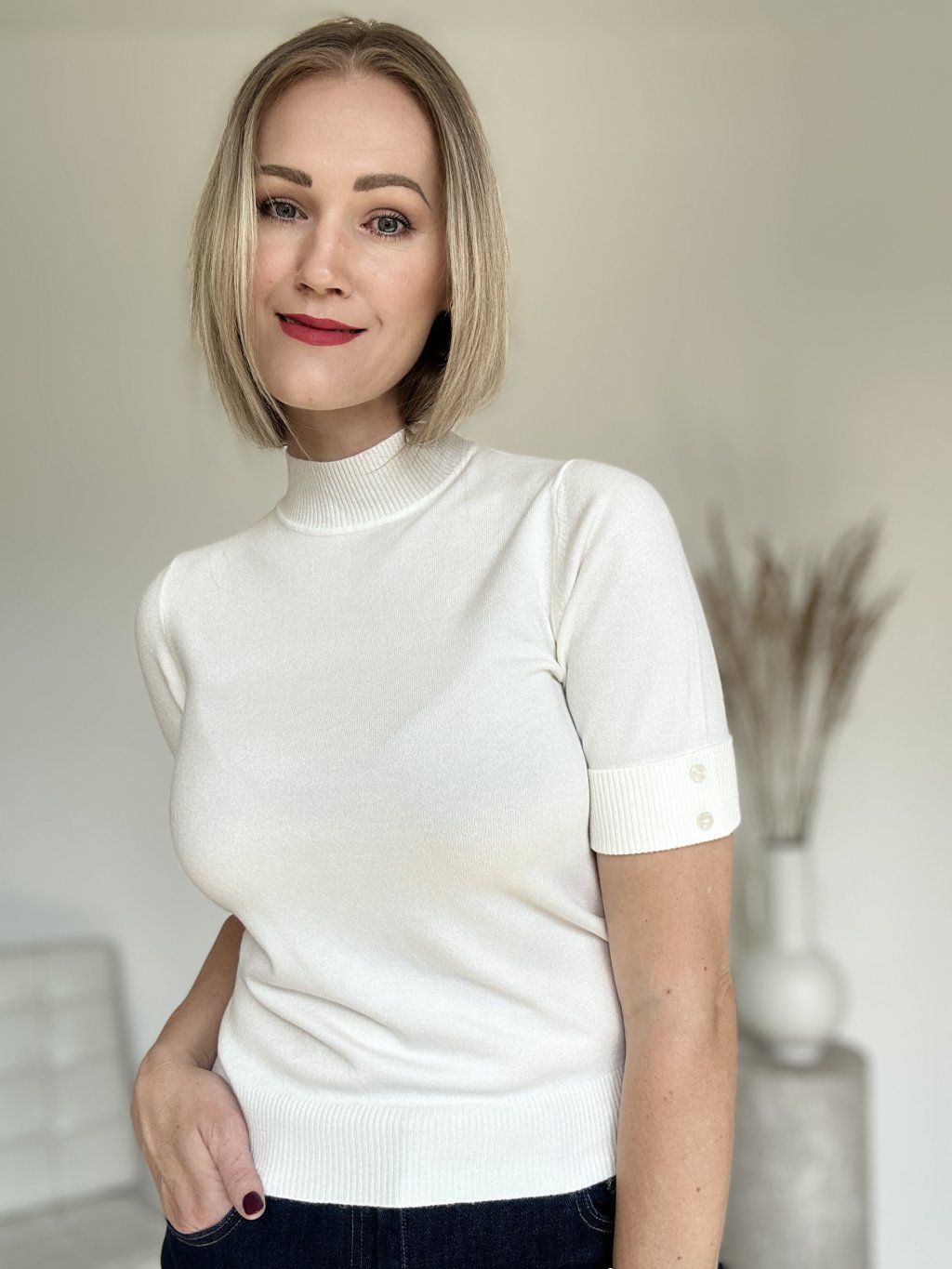 Minimalistický jemný úpletový top s krátkym rukávom a zdobený gombíkmi.
