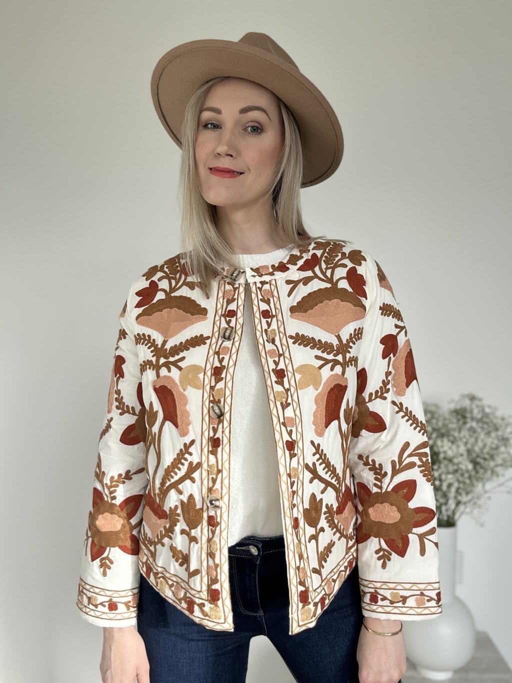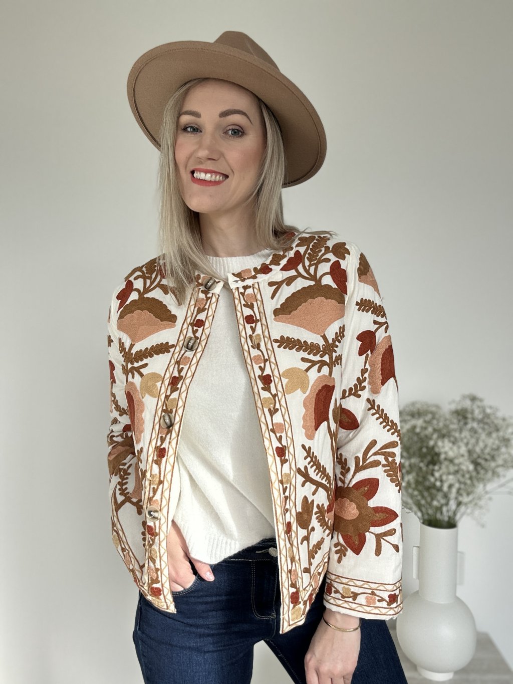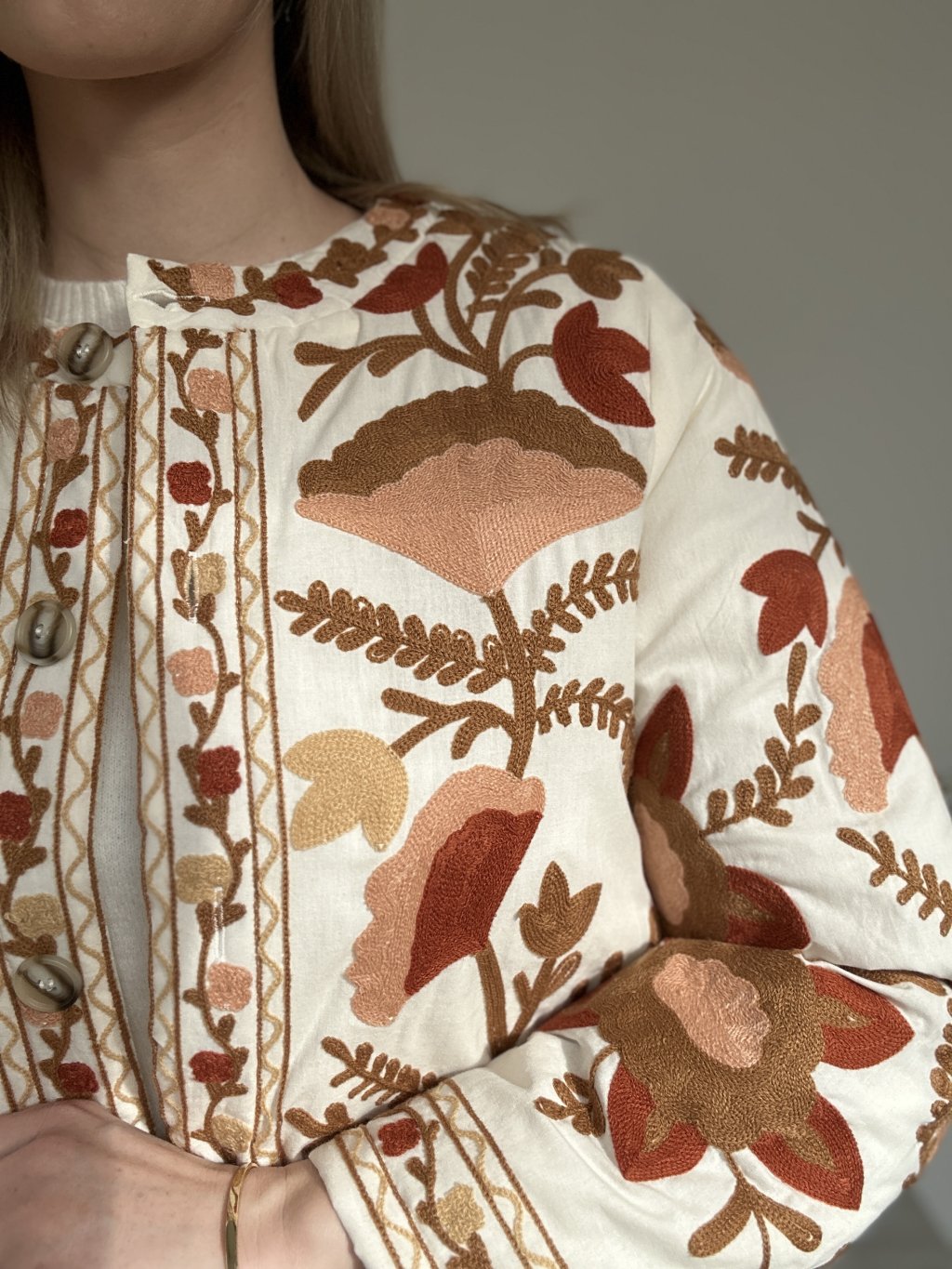 Pozdvihnite svoj štýl s touto bohémskou vyšívanou bundou , skutočným klenotom rafinovanosti a originality. Je vyrobená z mäkkej a pohodlnej látky a vyniká svojou bohatou kvetinovou výšivkou v teplých odtieňoch hnedej, terakotovej, oranžovej a béžovej. Okrúhly výstrih bez goliera , elegantné gombíky a rovný strih dodávajú tomuto nadčasovému kúsku nádych sofistikovanosti.
