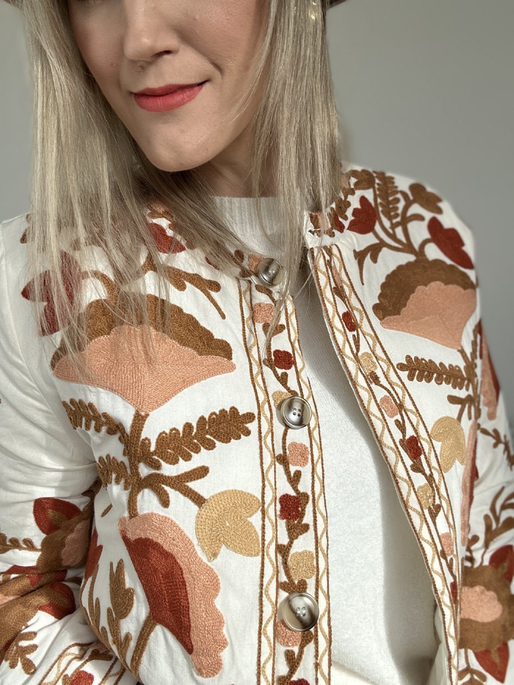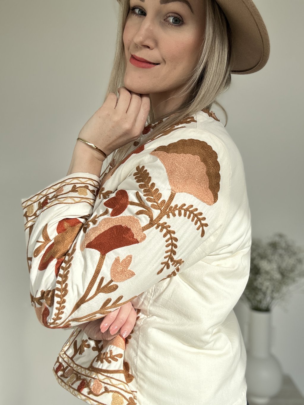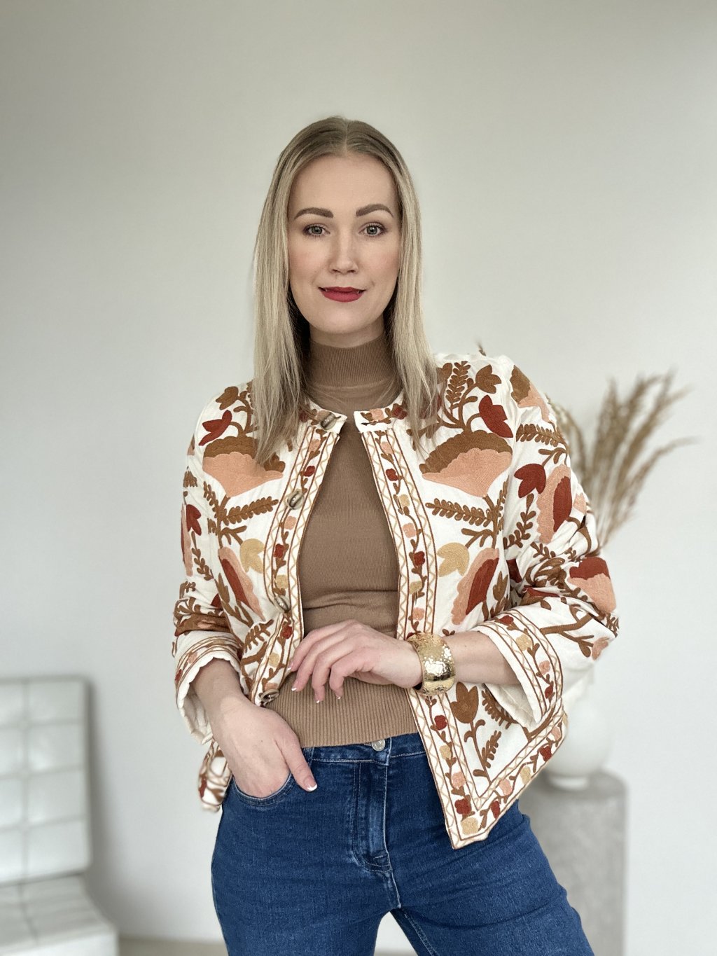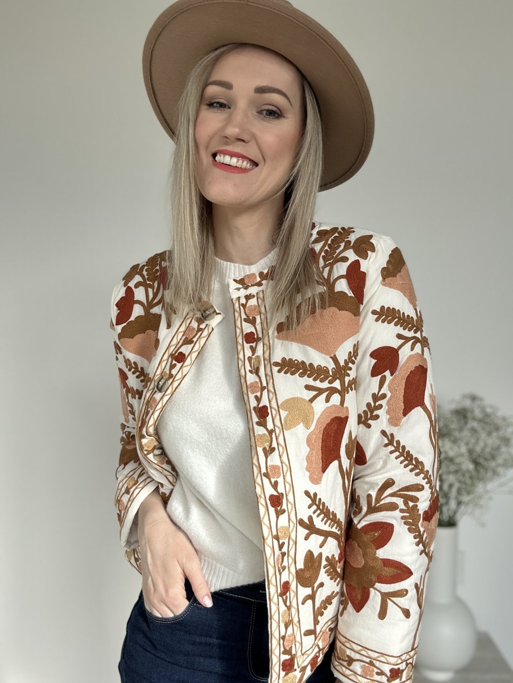 Pozdvihnite svoj štýl s touto bohémskou vyšívanou bundou , skutočným klenotom rafinovanosti a originality. Je vyrobená z mäkkej a pohodlnej látky a vyniká svojou bohatou kvetinovou výšivkou v teplých odtieňoch hnedej, terakotovej, oranžovej a béžovej. Okrúhly výstrih bez goliera , elegantné gombíky a rovný strih dodávajú tomuto nadčasovému kúsku nádych sofistikovanosti.