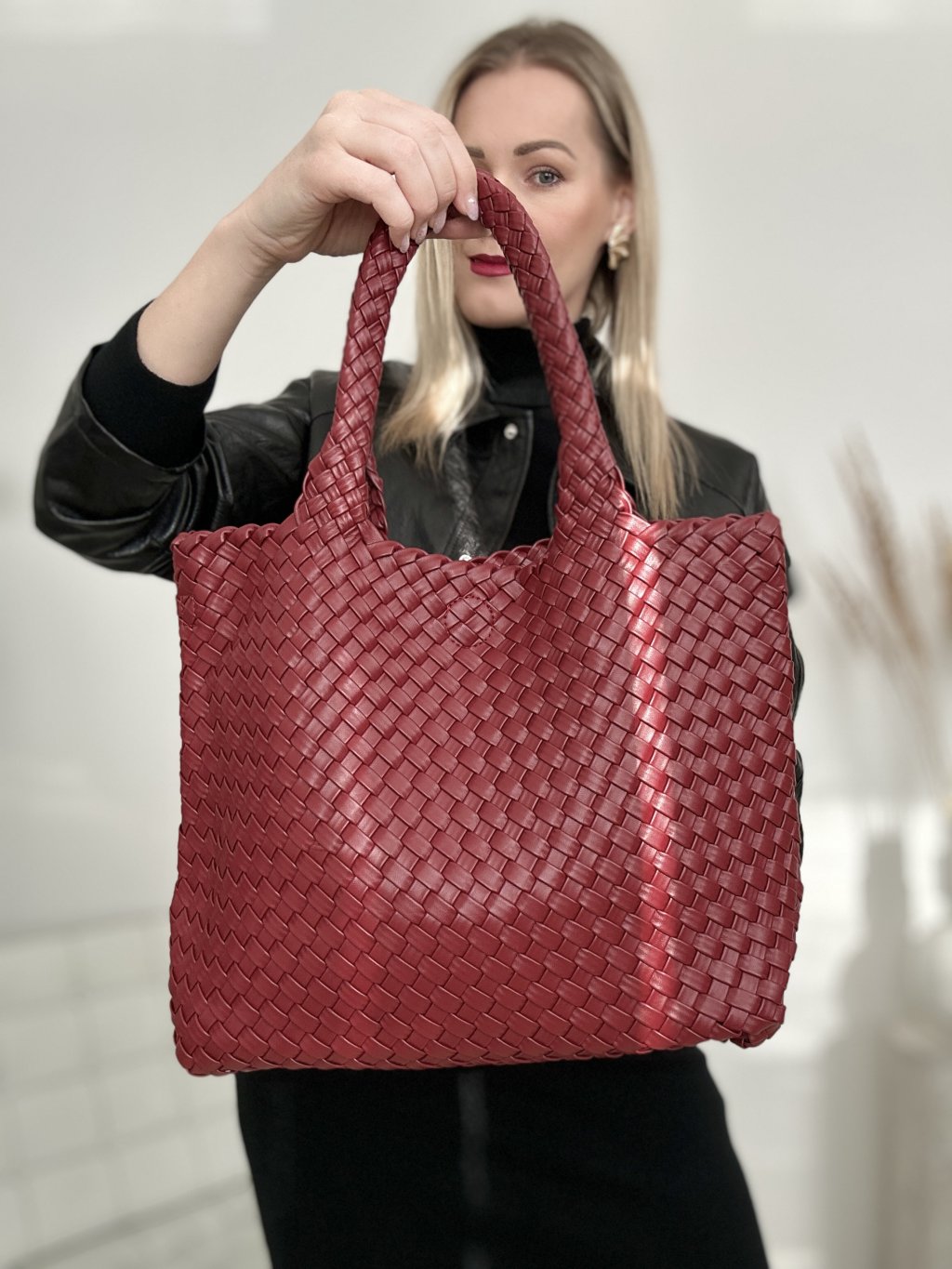 Bordová preplietaná kabelka často označovaná ako "tote bag" je obľúbením kúskom aj veľkosťou na denné nosenie a prenášanie osobných potrieb.