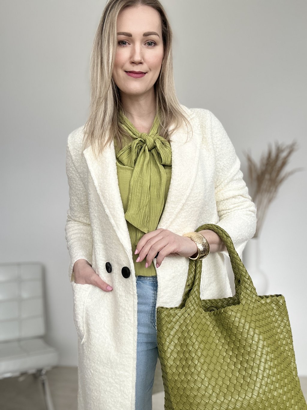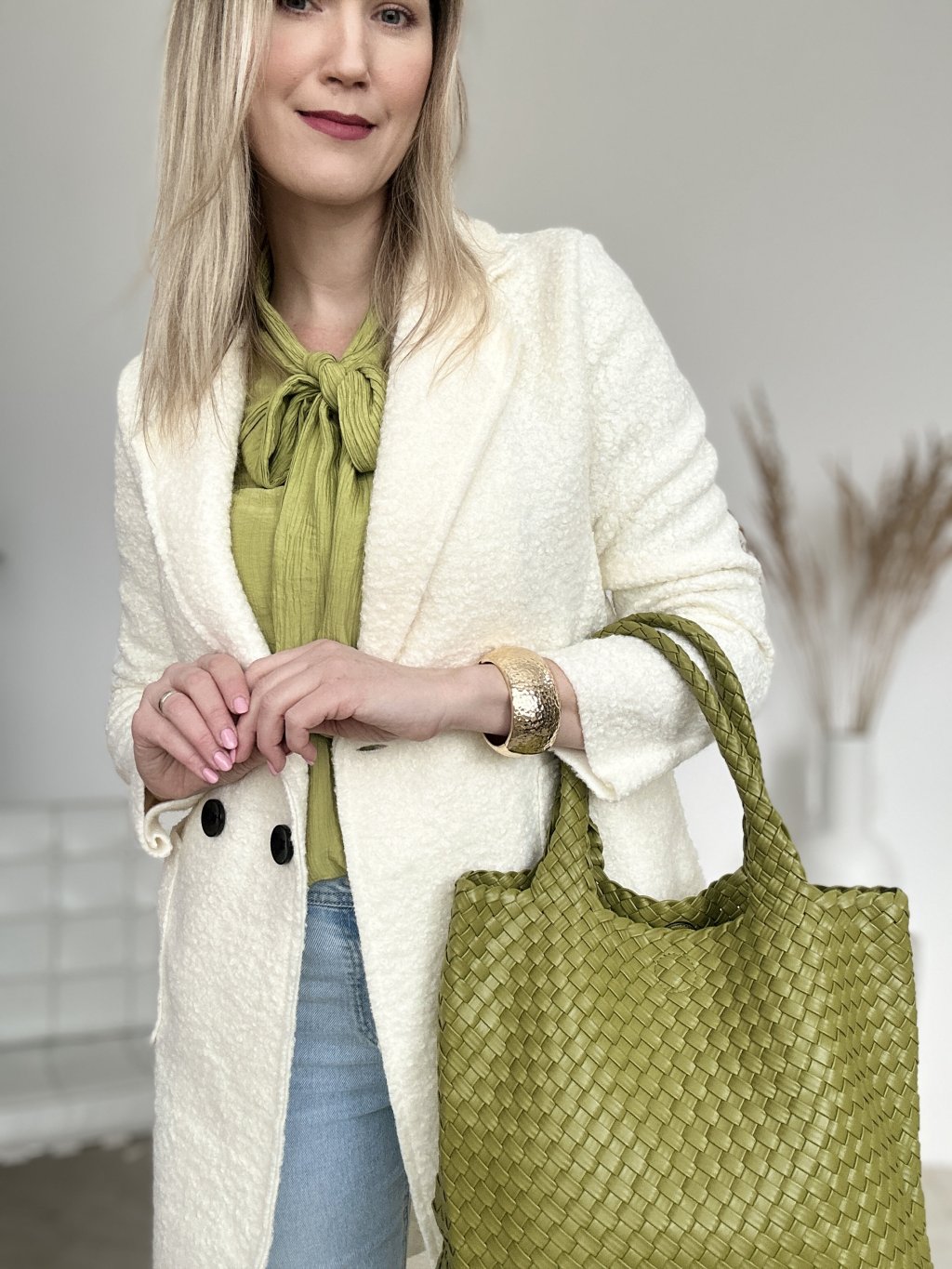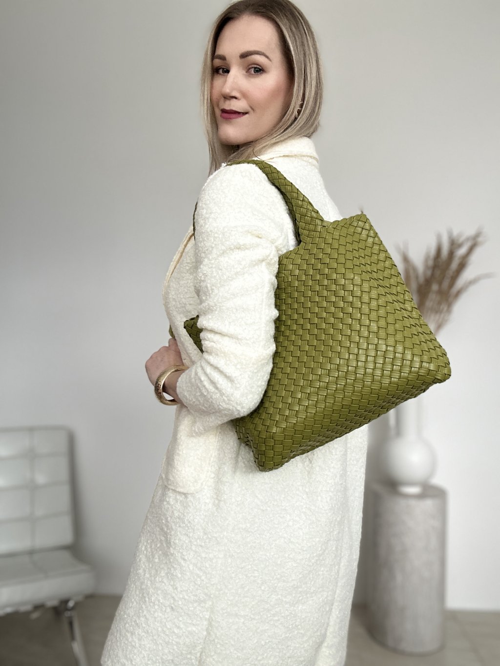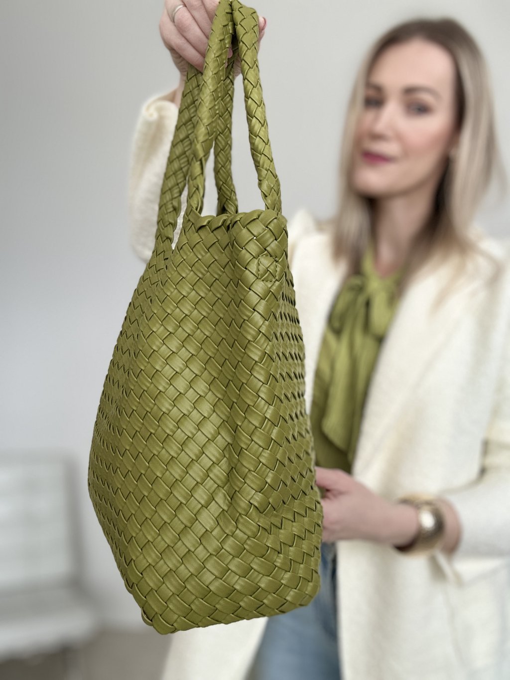 Zelená preplietaná kabelka často označovaná ako "tote bag" je obľúbením kúskom aj veľkosťou na denné nosenie a prenášanie osobných potrieb.