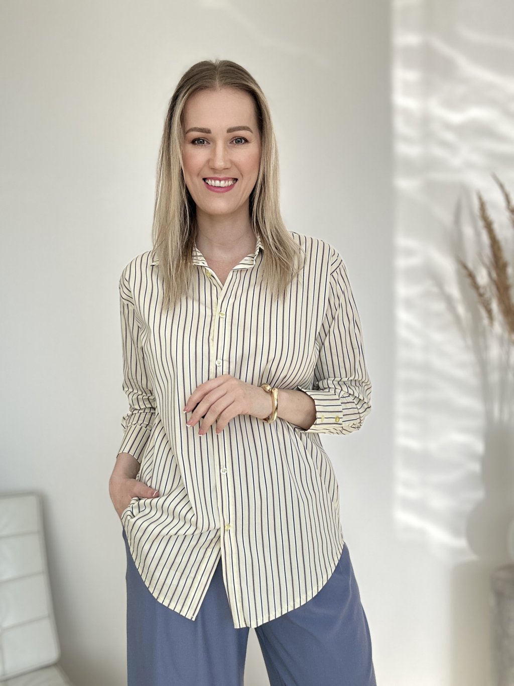• Vzor a farba: Košeľa má svetlomodrý podklad s bielymi vertikálnymi pruhmi. Tento typ vzoru je nadčasový a opticky predlžuje postavu [14, 48].