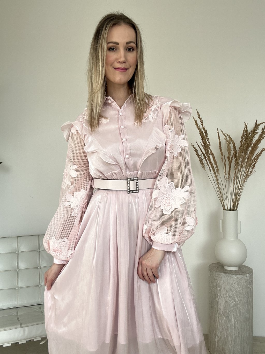 Elegantné púdrovoružové midi šaty kombinujú romantický štýl s klasickými prvkami košelového strihu. Dominantným materiálom je ľahká, mierne lesklá tkanina, ktorá šatám dodáva luxusný vzhľad.