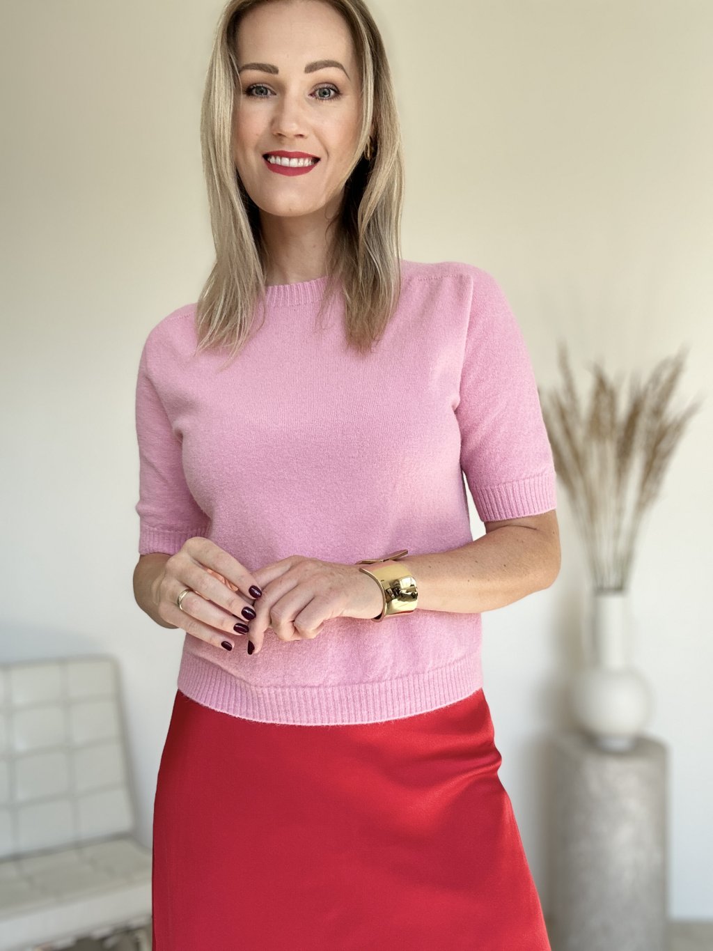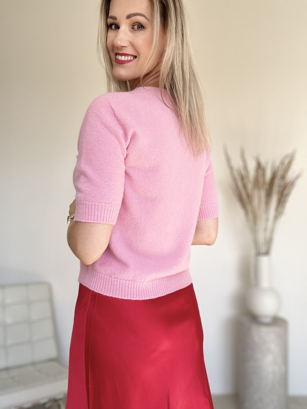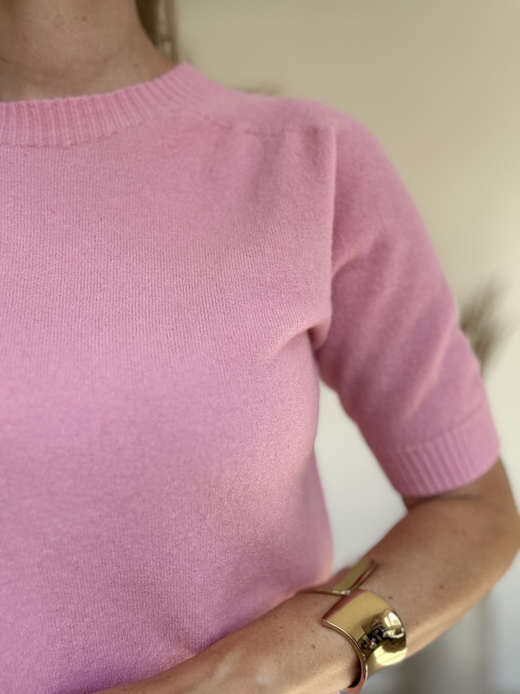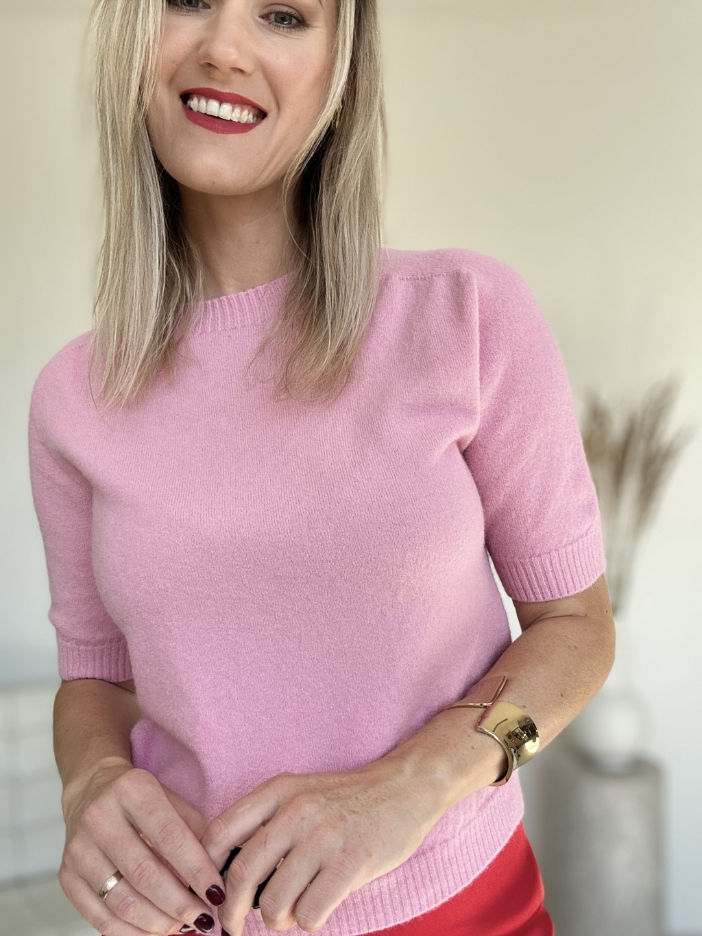 Univerzálny pulóver s krátkym rukávom kašmírového vzhľadu. Pôsobí univerzálne a elegantne.