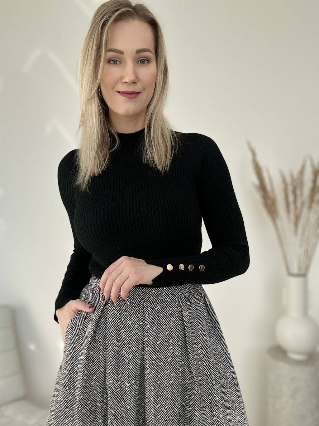 Je to priliehavý rebrovaný rolákový sveter s dlhým rukávom. Je vyrobený z kvalitného a príjemného materiálu a na manžetách rukávov má ozdobné zlaté gombíky, ktoré mu dodávajú šmrnc.