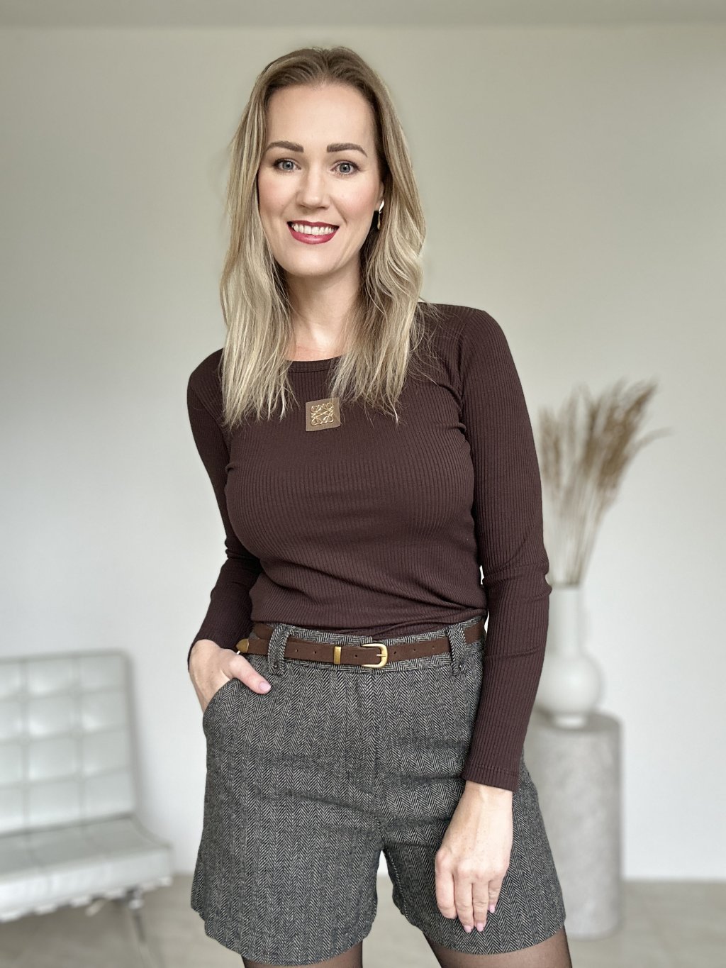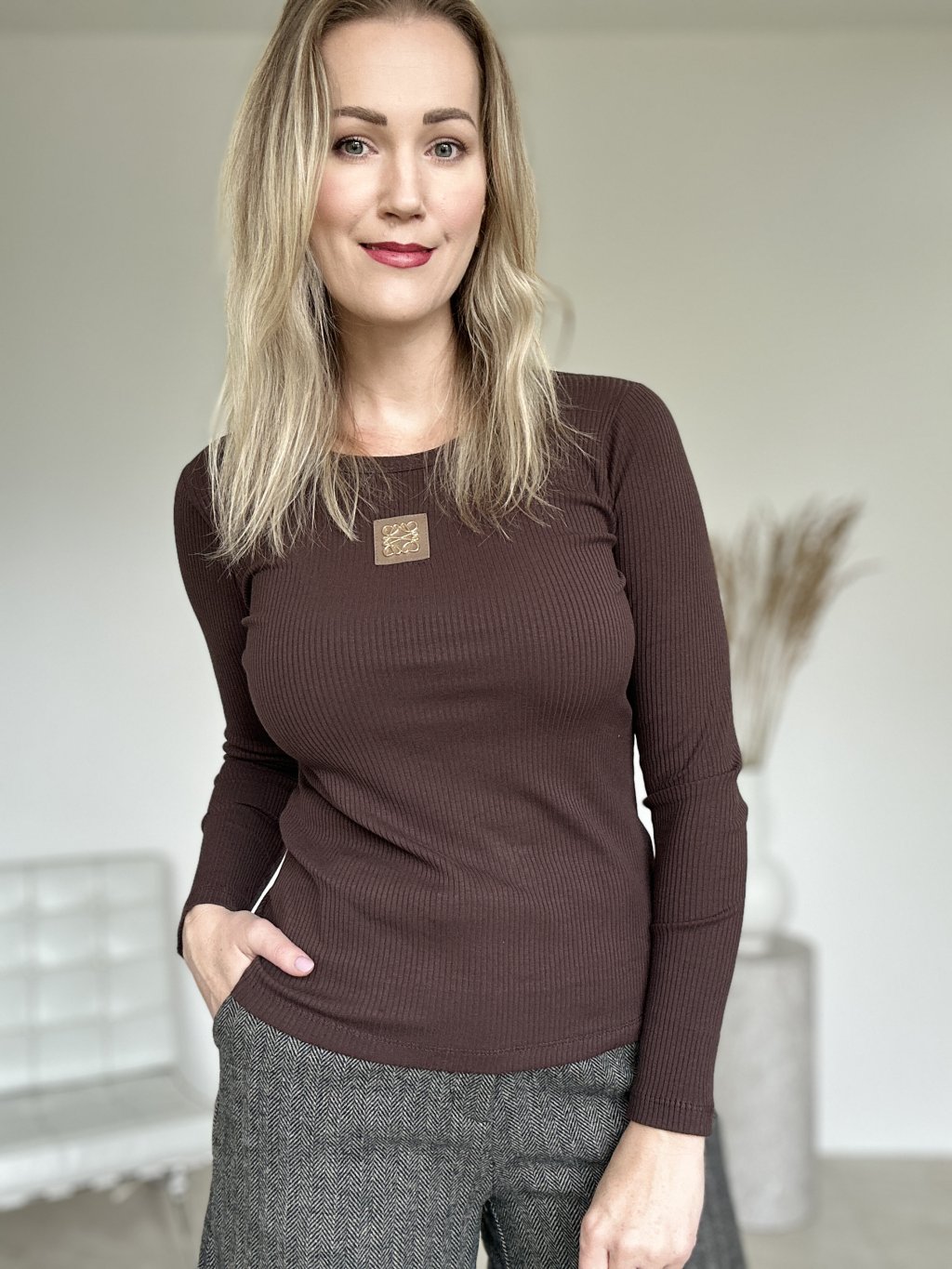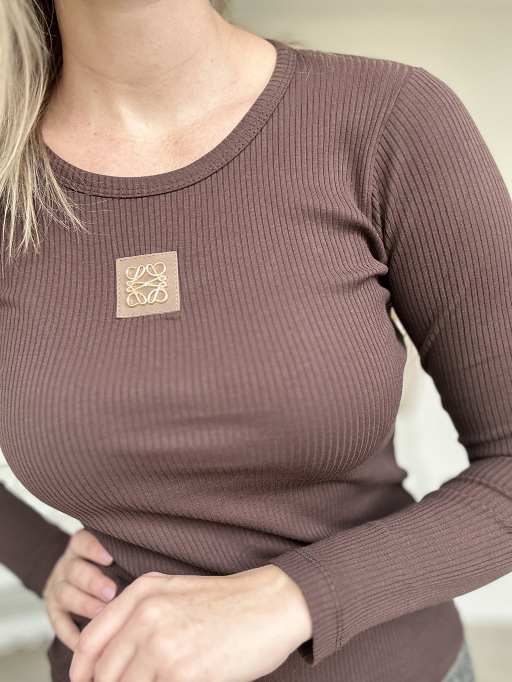 Hnedý rebrovaný top s dlhými rukávmi zdobený malým štvorcovým zlatým emblémom.