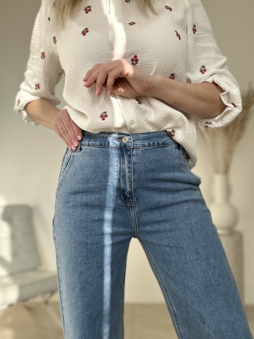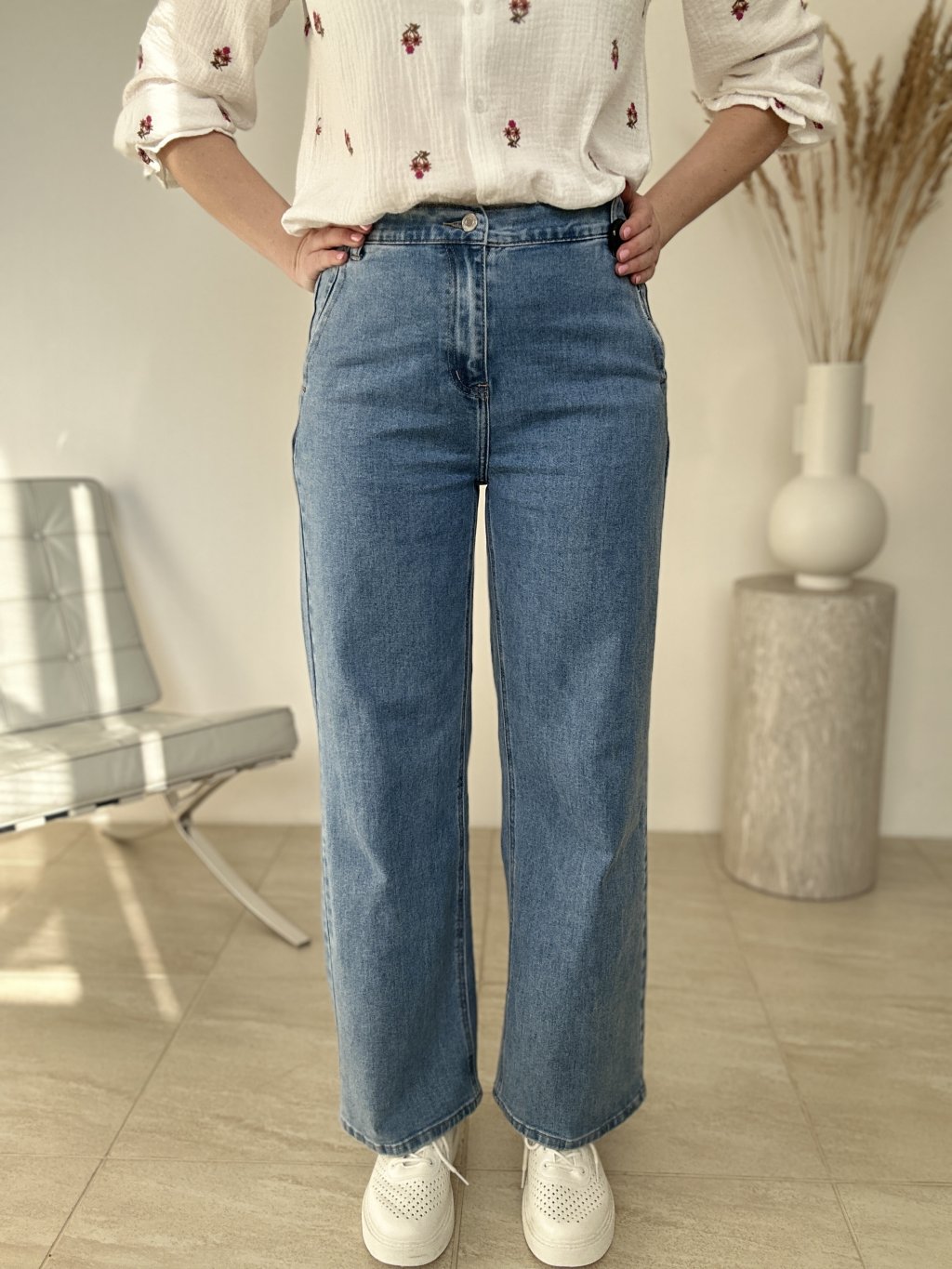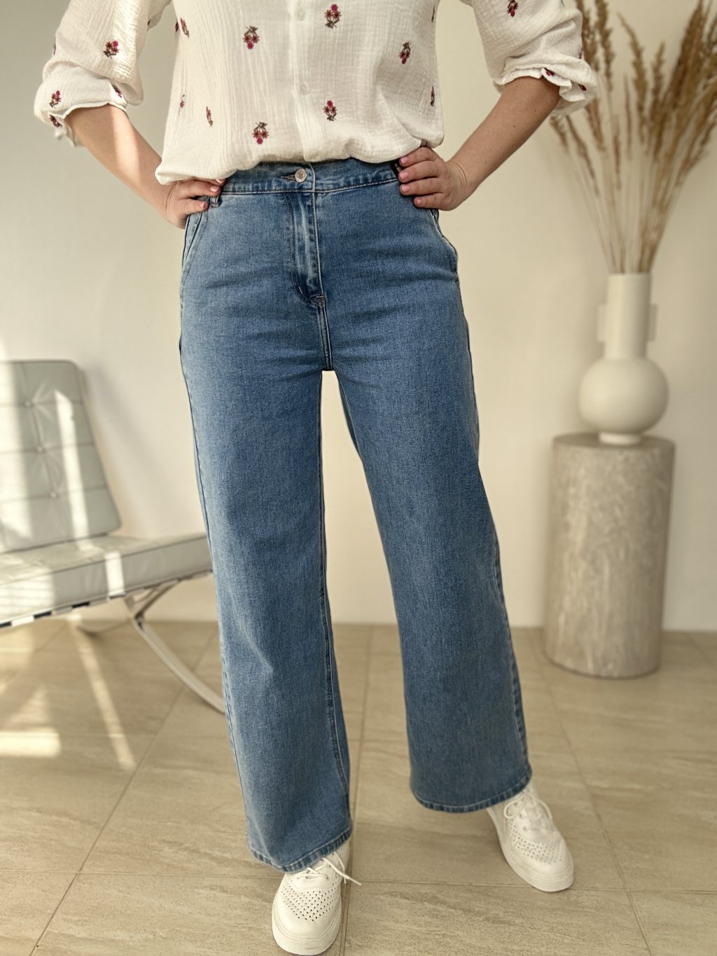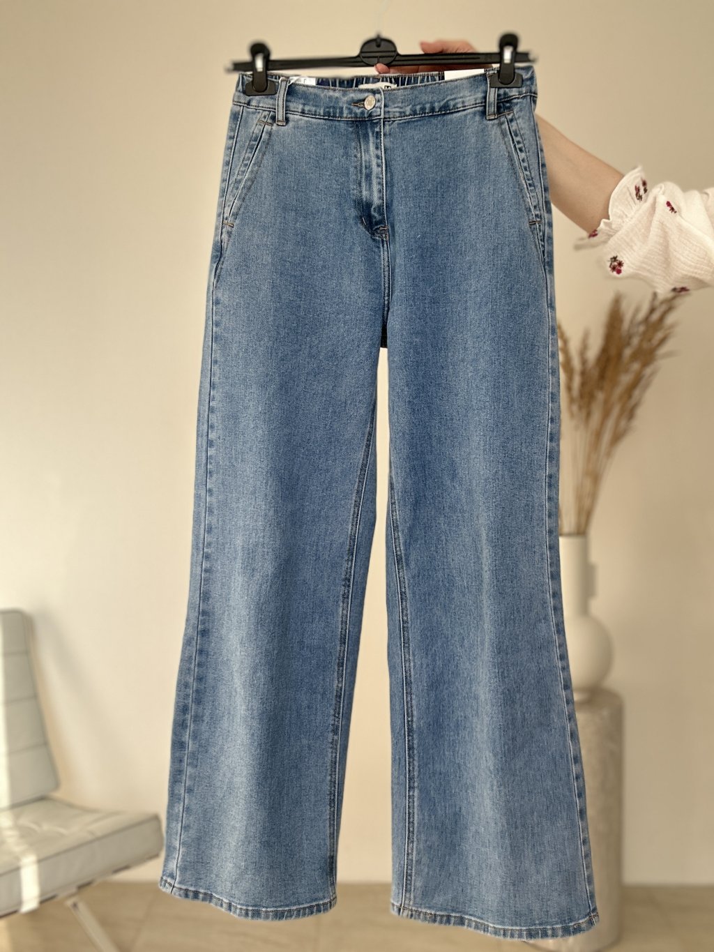Tieto rifle sú skvelou voľbou, ak hľadáš nadčasový denim s moderným širokým strihom. Majú vyšší pás, klasické zapínanie na gombík a zips a praktické vrecká, vďaka čomu sú ideálne na každodenné nosenie. Široká, rovná nohavica pôsobí aktuálne, zároveň však zostáva veľmi univerzálna – ľahko ich zladíš s priliehavým topom, košeľou aj so sakom. Strih opticky predlžuje nohy a pekne vyváži siluetu, takže funguje rovnako dobre s teniskami, mokasínami aj s podpätkami.