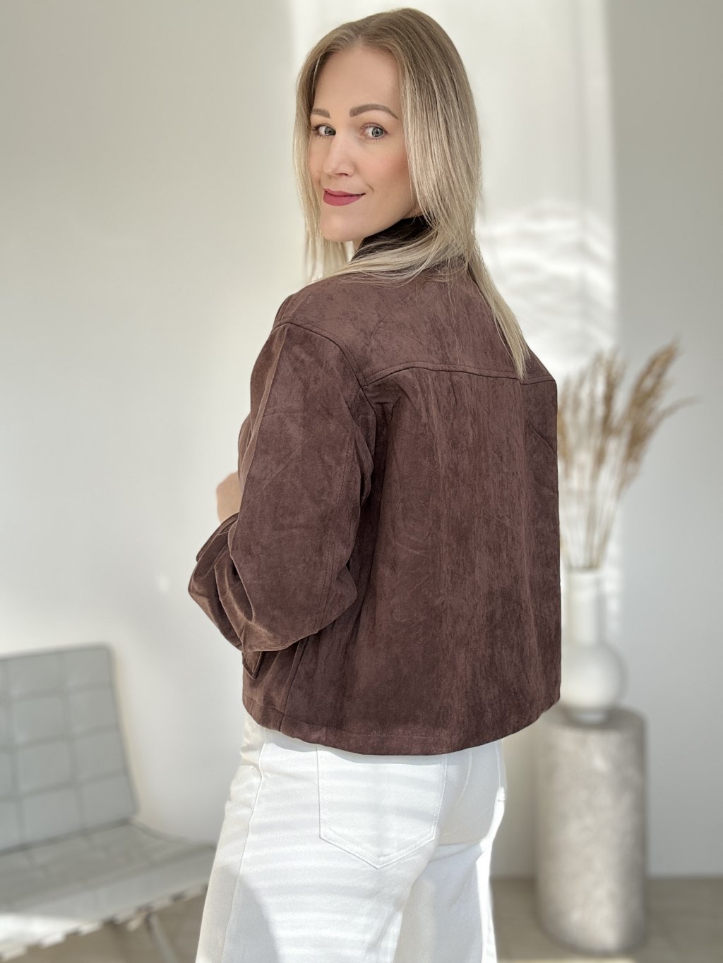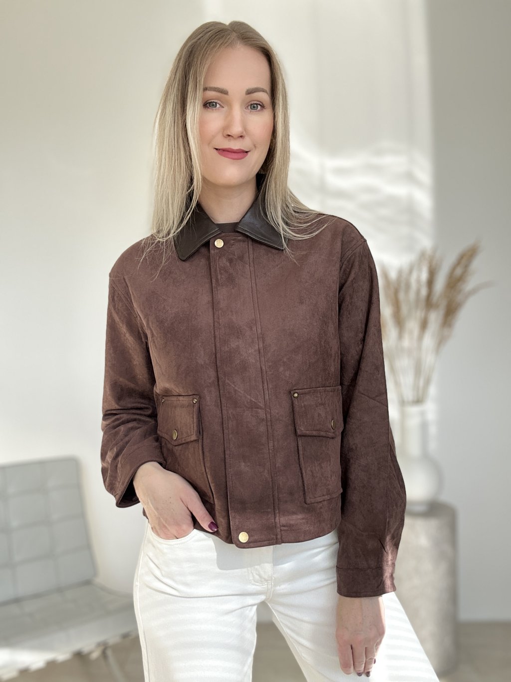 Moderná semišová bunda, s tmavohnedým koženým golierom, funkčnými vreckami a zapínaním na zips. Má dve veľké funkčné vrecká s chopňami na prednej strane, ktoré sa zapínajú na cvoky.