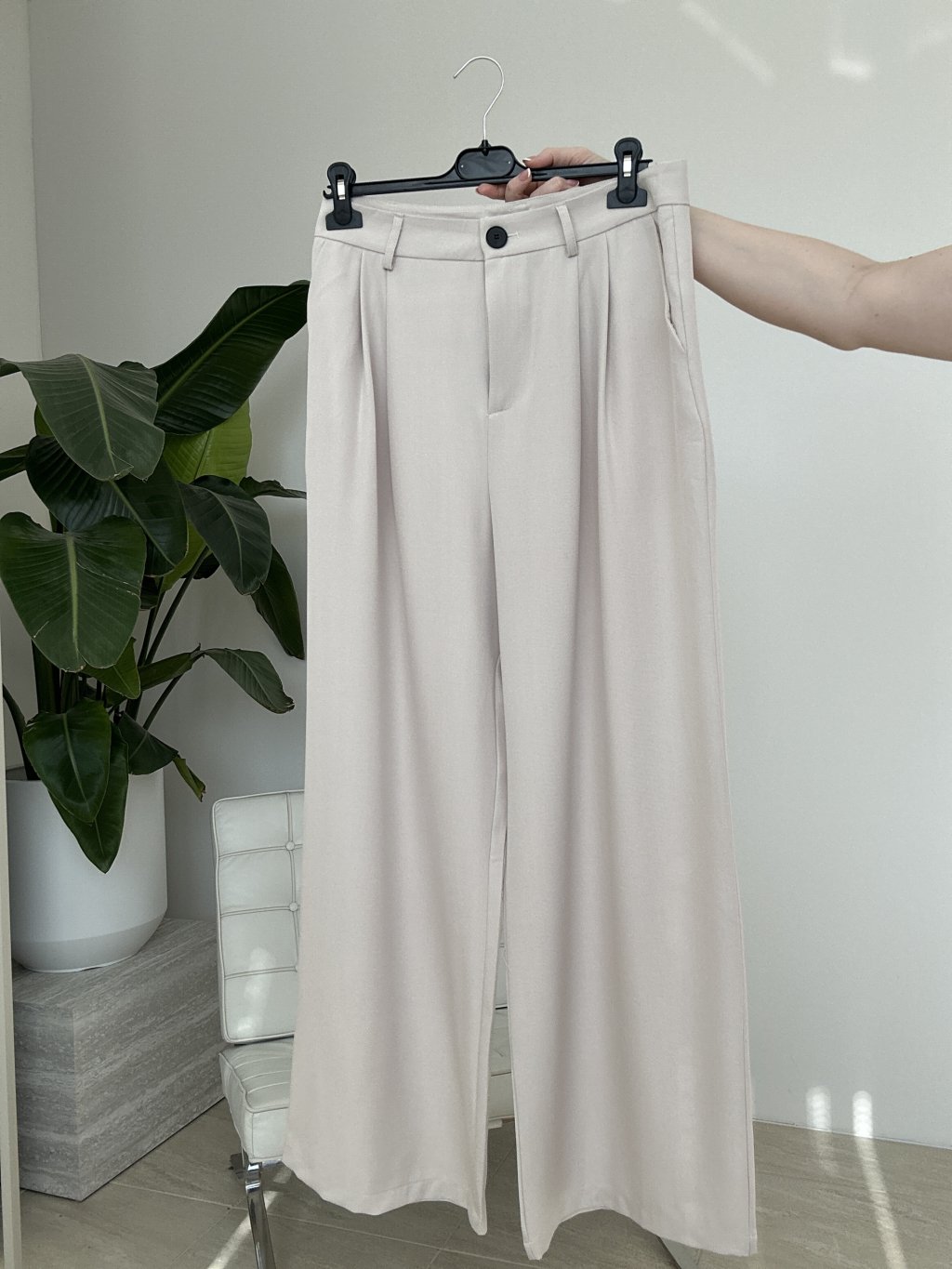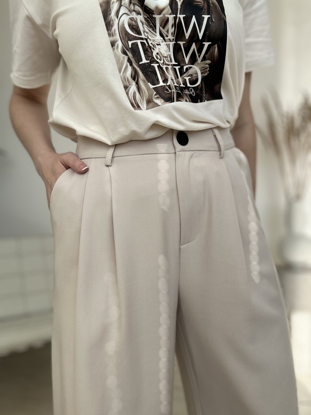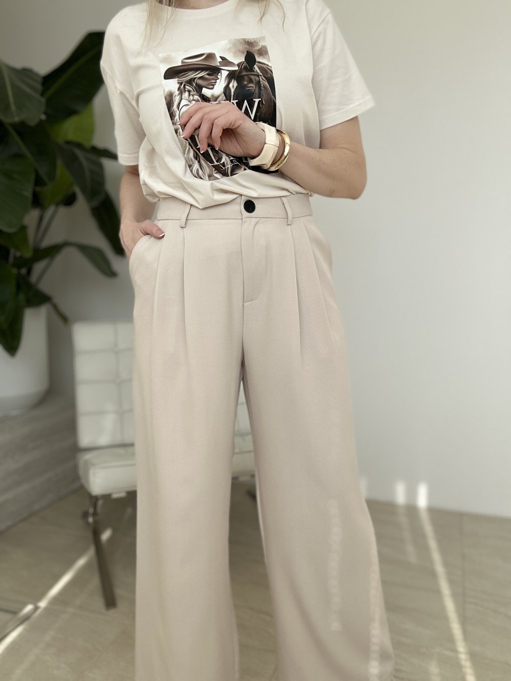 Dámske spoločenské nohavice v elegantnom a modernom prevedení. Nohavice majú široký, rovný strih, ktorý voľne padá od bokov až dole. Tento štýl je aktuálne veľmi trendy a opticky predlžuje postavu.