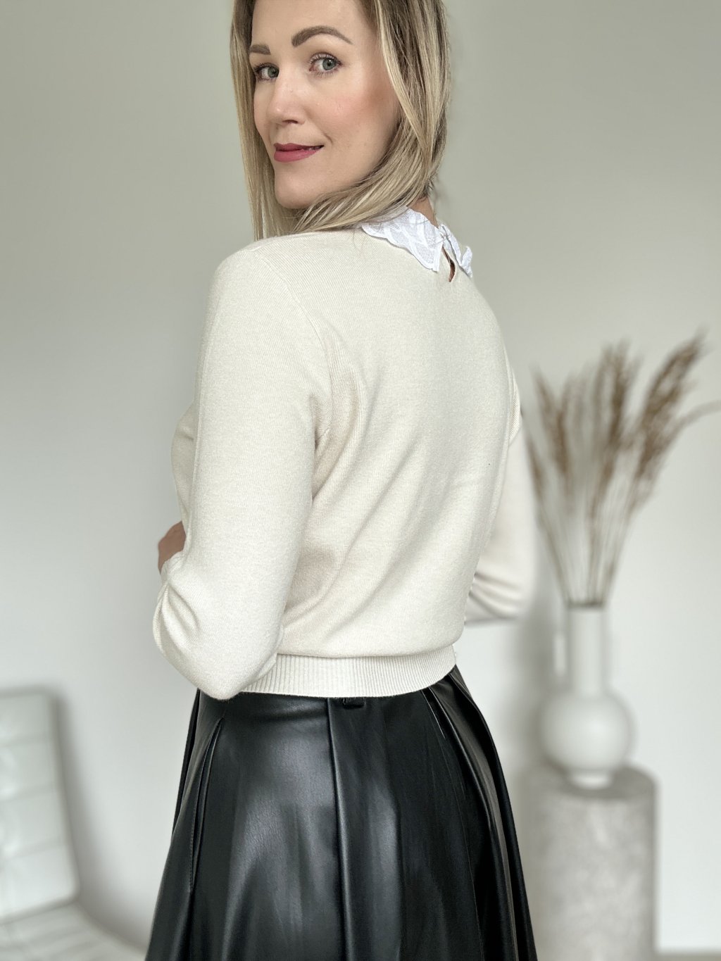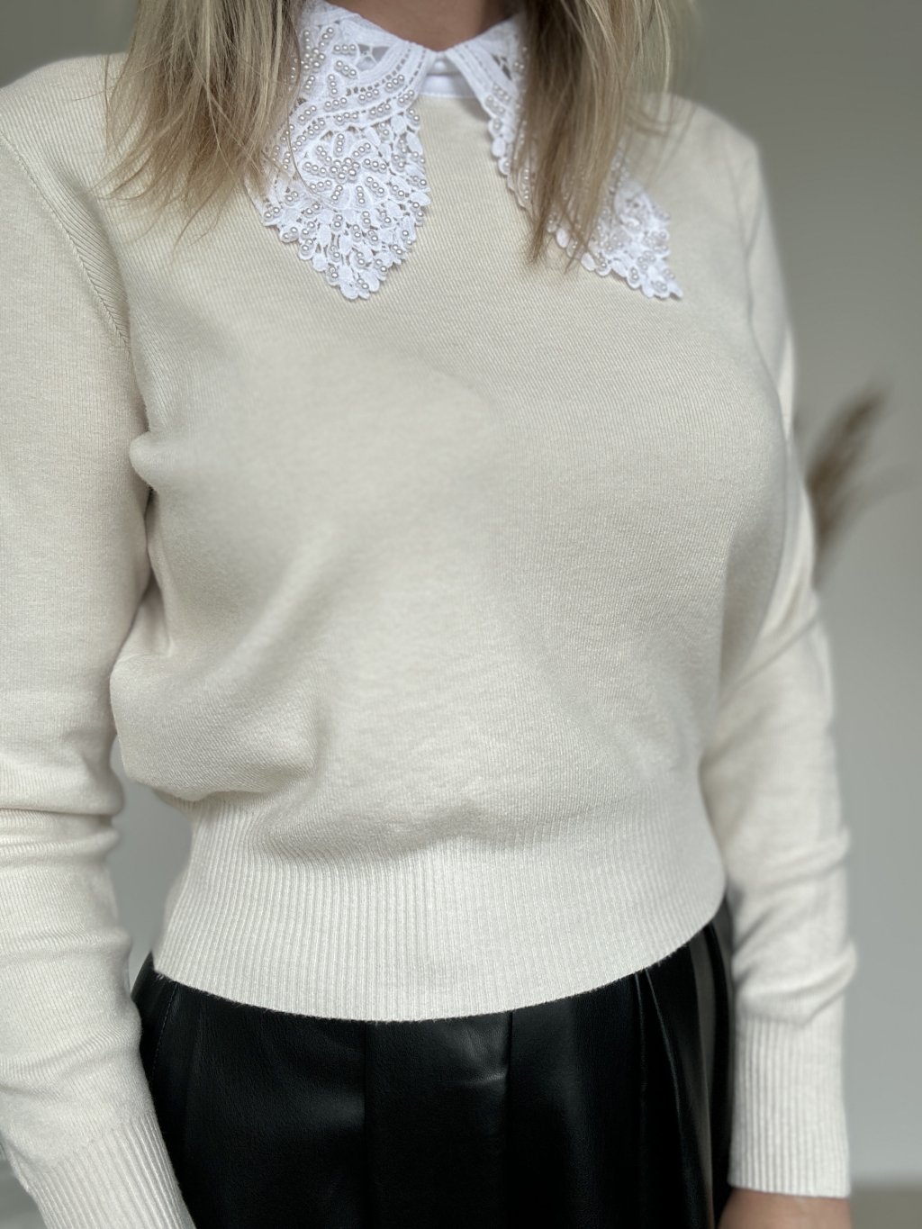 Smotanový pletený pulóver s bielym čipkovaným golierom.