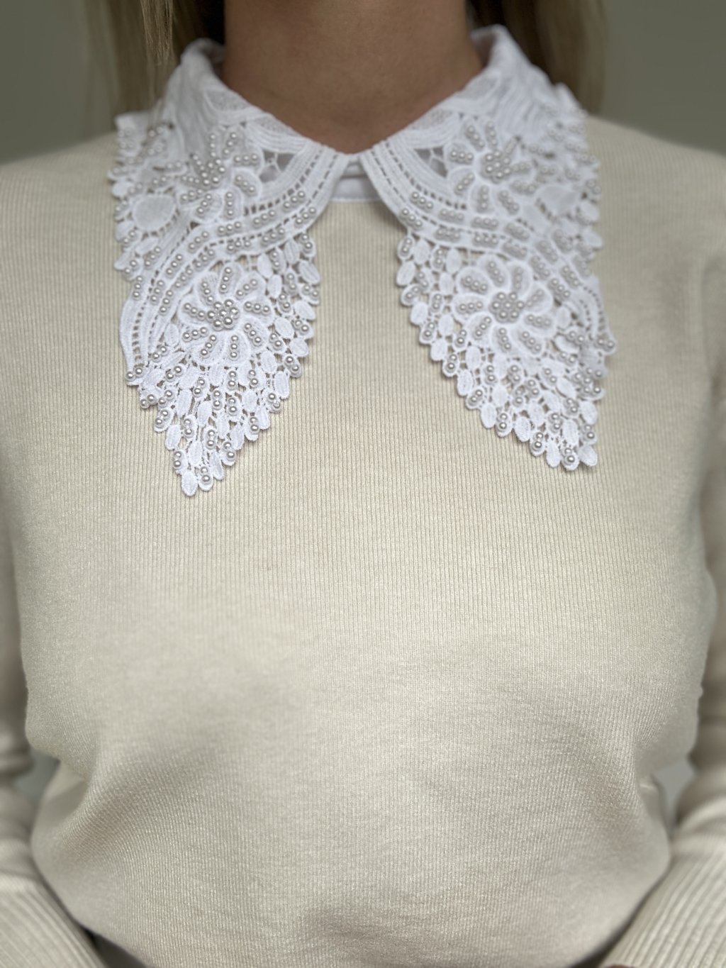 Smotanový pletený pulóver s bielym čipkovaným golierom. Klasický strih s výrazným dekoratívnym golierom, ktorý dodáva elegantný a ženský vzhľad.